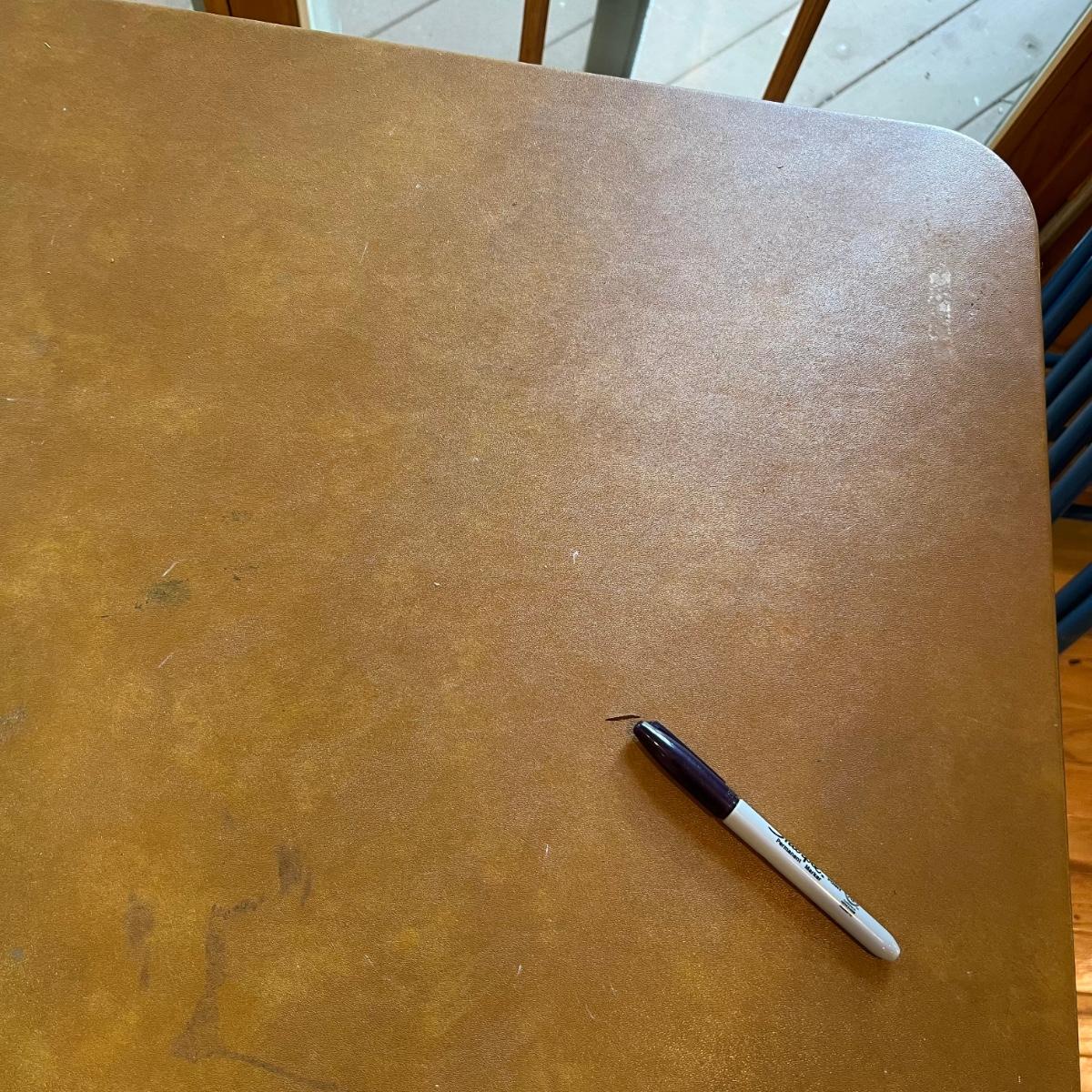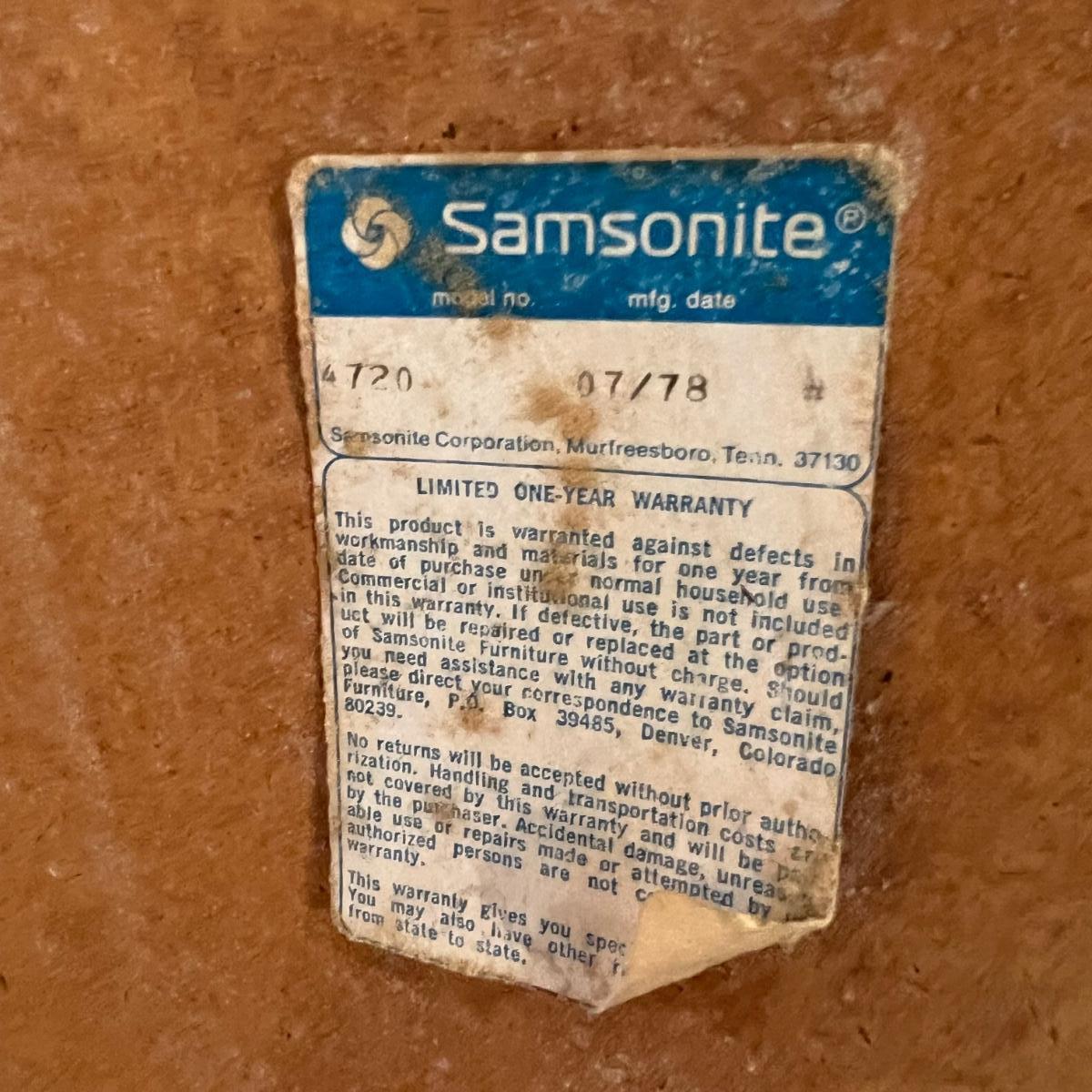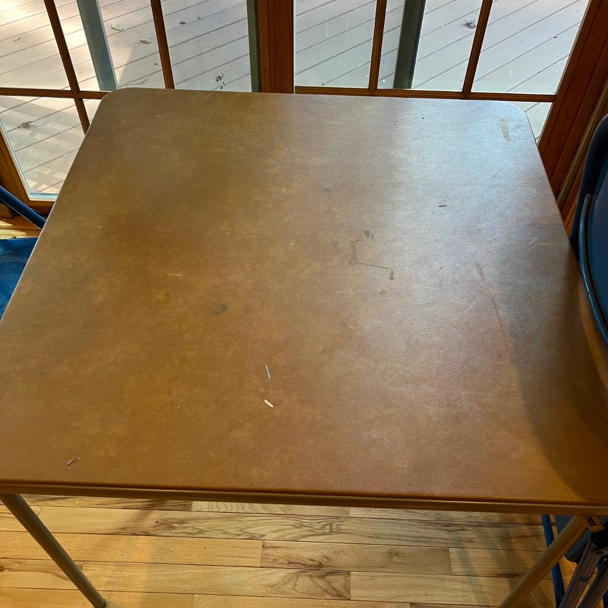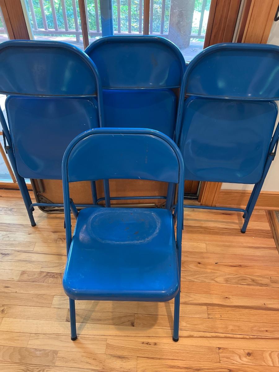 Samsonite card table measures approximately 33” square x 26”H. it has a small slice in the top surface shown in pic. Four matching blue metal chairs measure 18” x 20” x 30” with 17” seat height. One chair has a bit of rust.