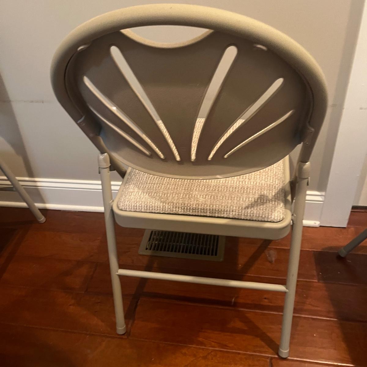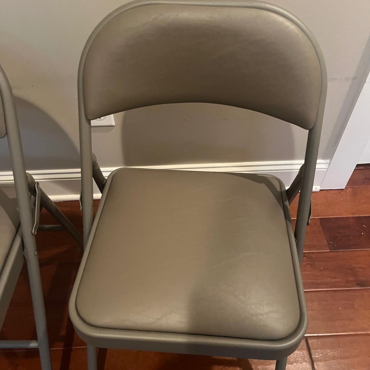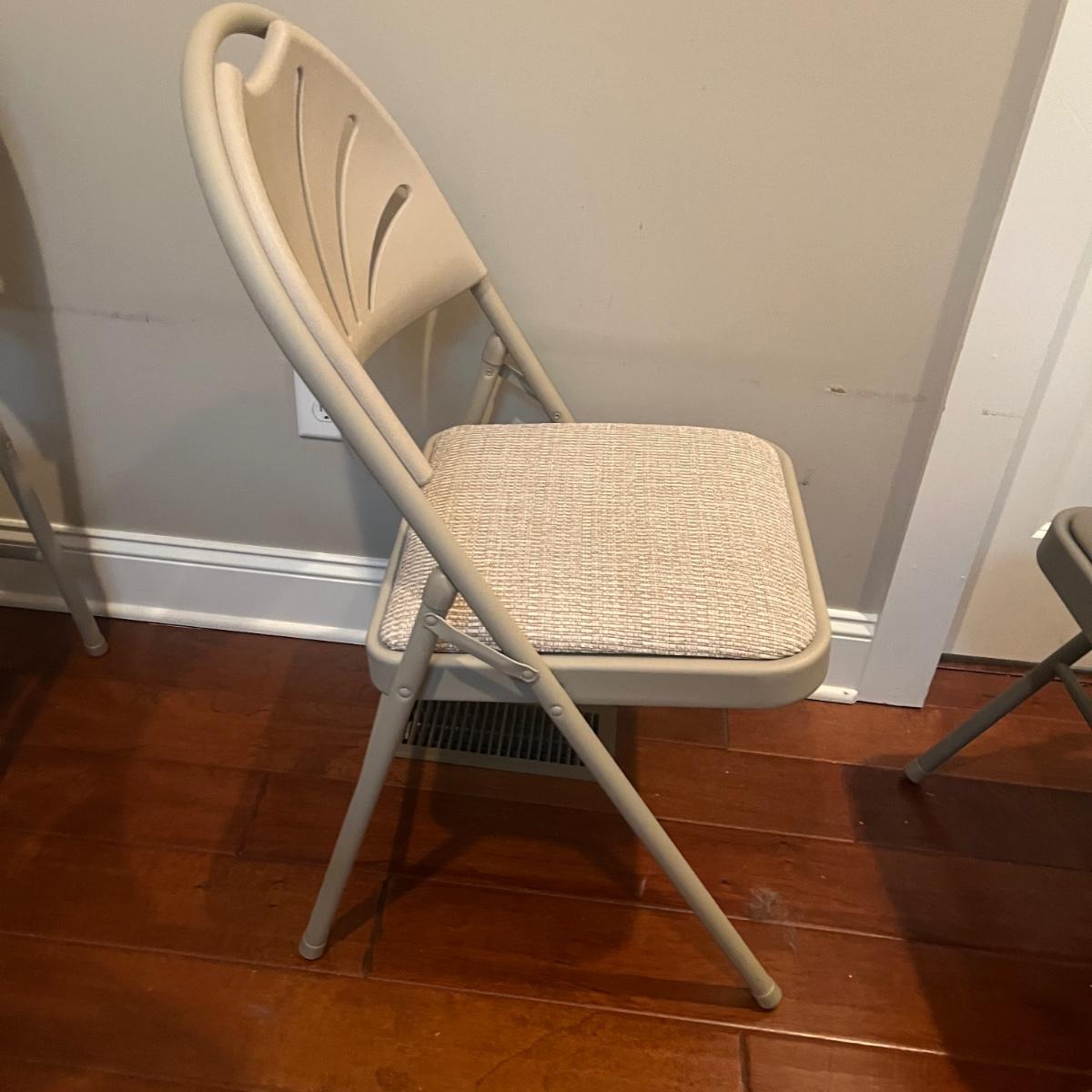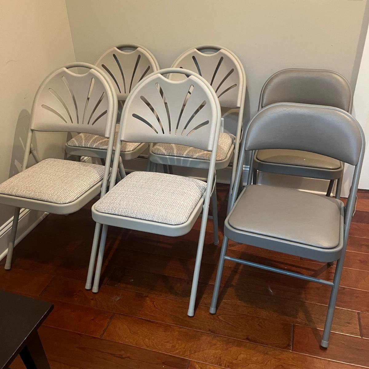 Lot includes four Samsonite folding metal chairs with padded and upholstered seats. Also includes two Sudden Comfort folding metal chairs with padded back and seat. Samsonite chairs measure 18” x 22” x 33”H with a 18” seat height.