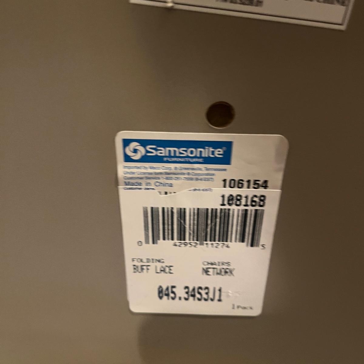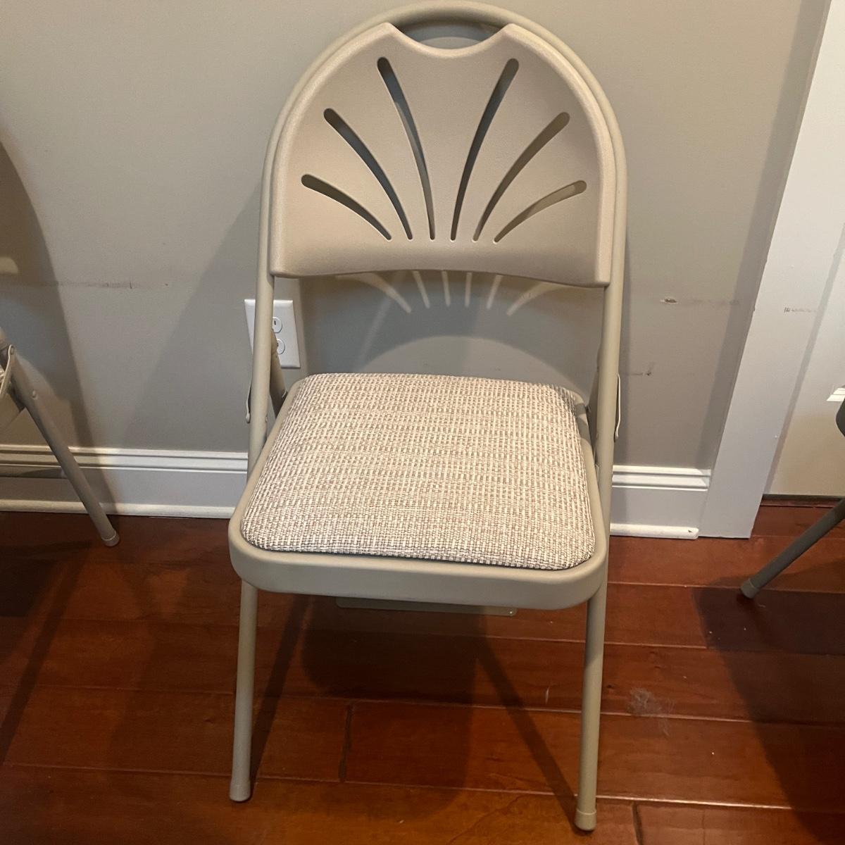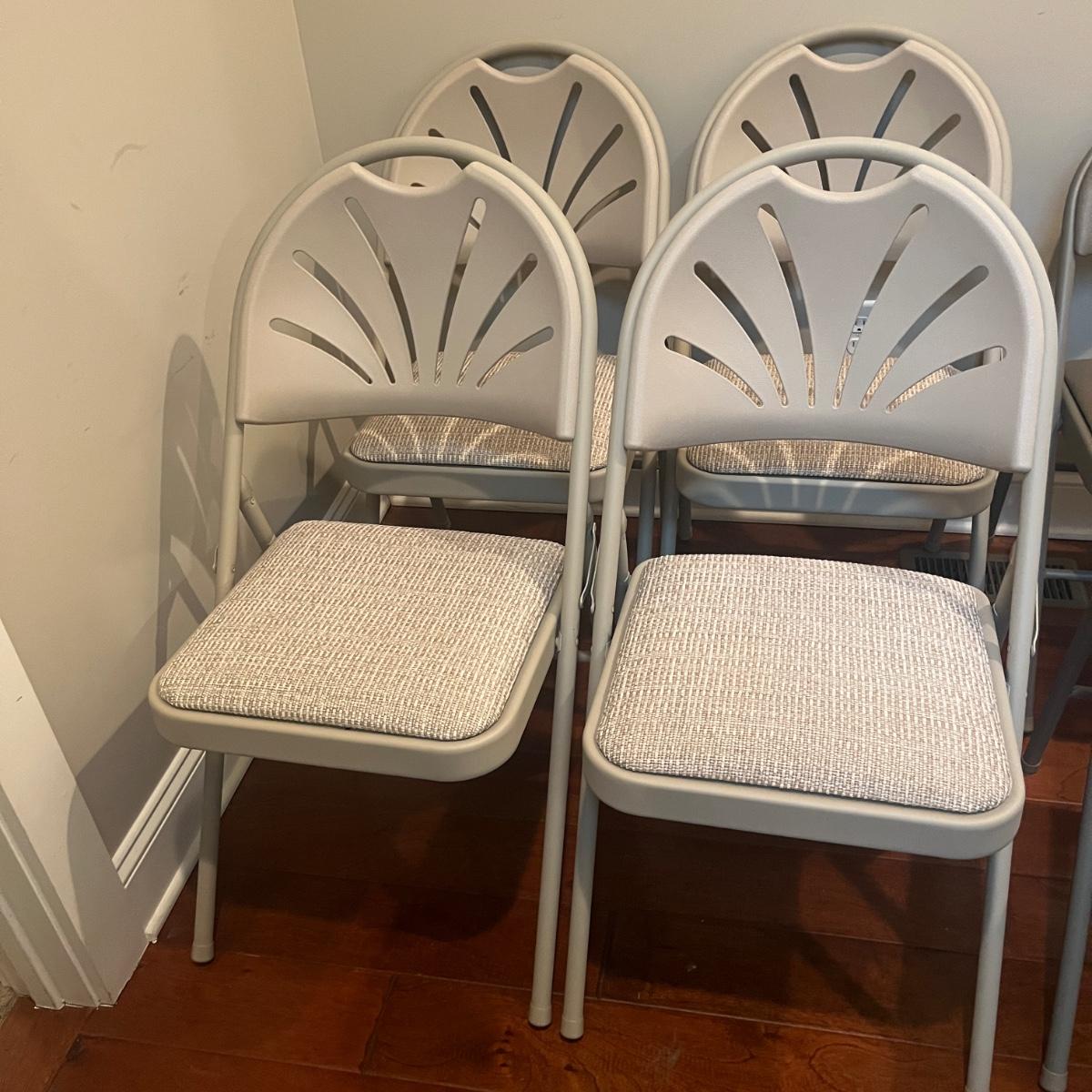 Lot includes four Samsonite folding metal chairs with padded and upholstered seats. Also includes two Sudden Comfort folding metal chairs with padded back and seat. Samsonite chairs measure 18” x 22” x 33”H with a 18” seat height.