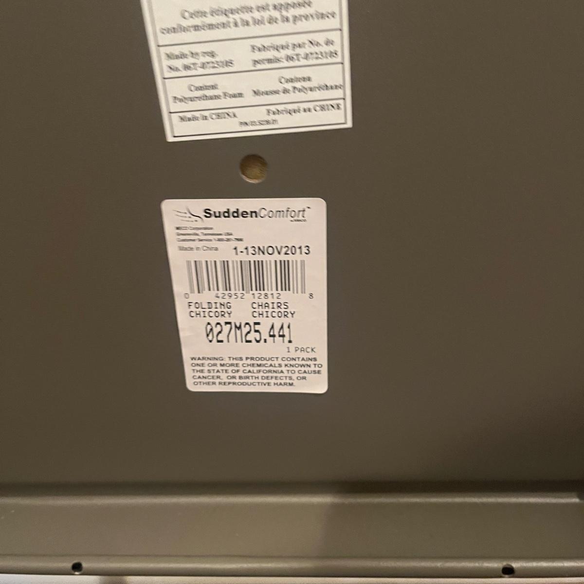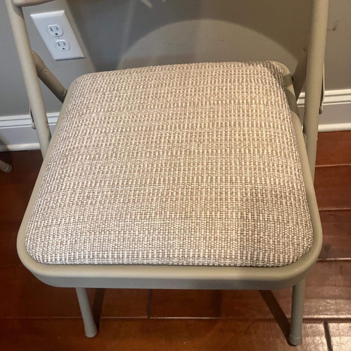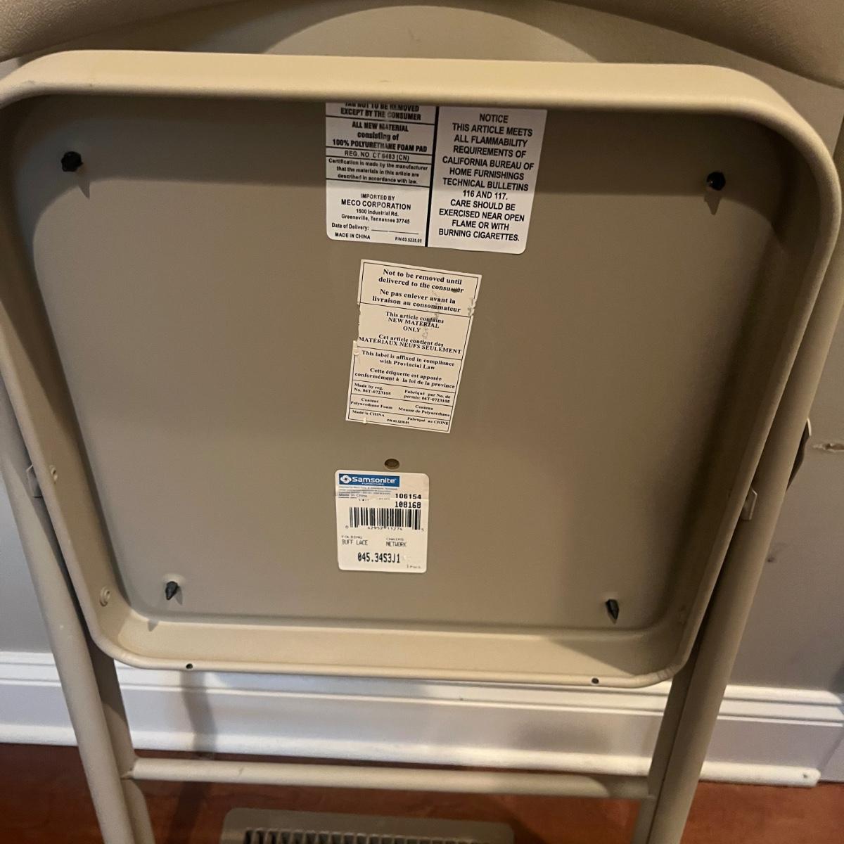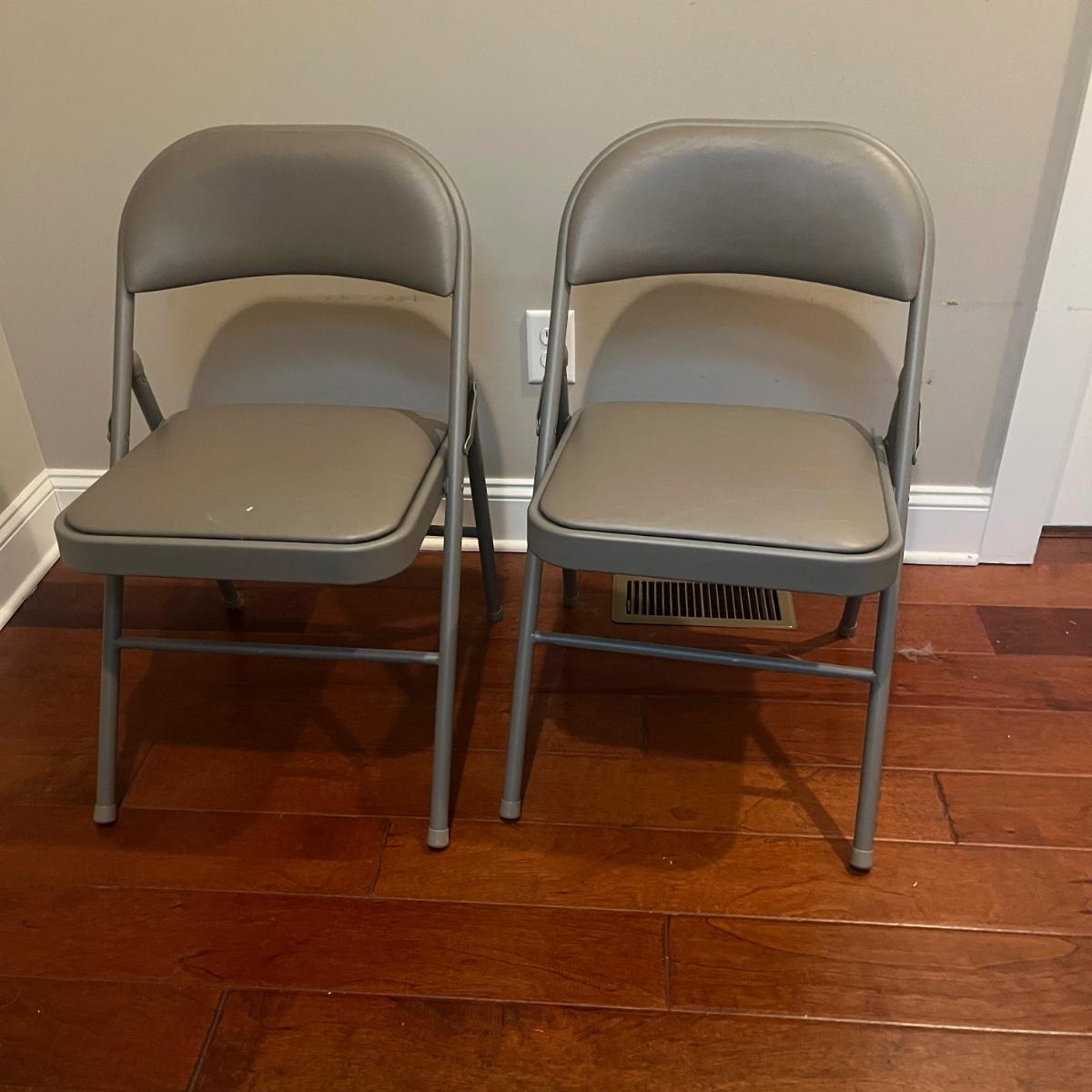 Lot includes four Samsonite folding metal chairs with padded and upholstered seats. Also includes two Sudden Comfort folding metal chairs with padded back and seat. Samsonite chairs measure 18” x 22” x 33”H with a 18” seat height.
