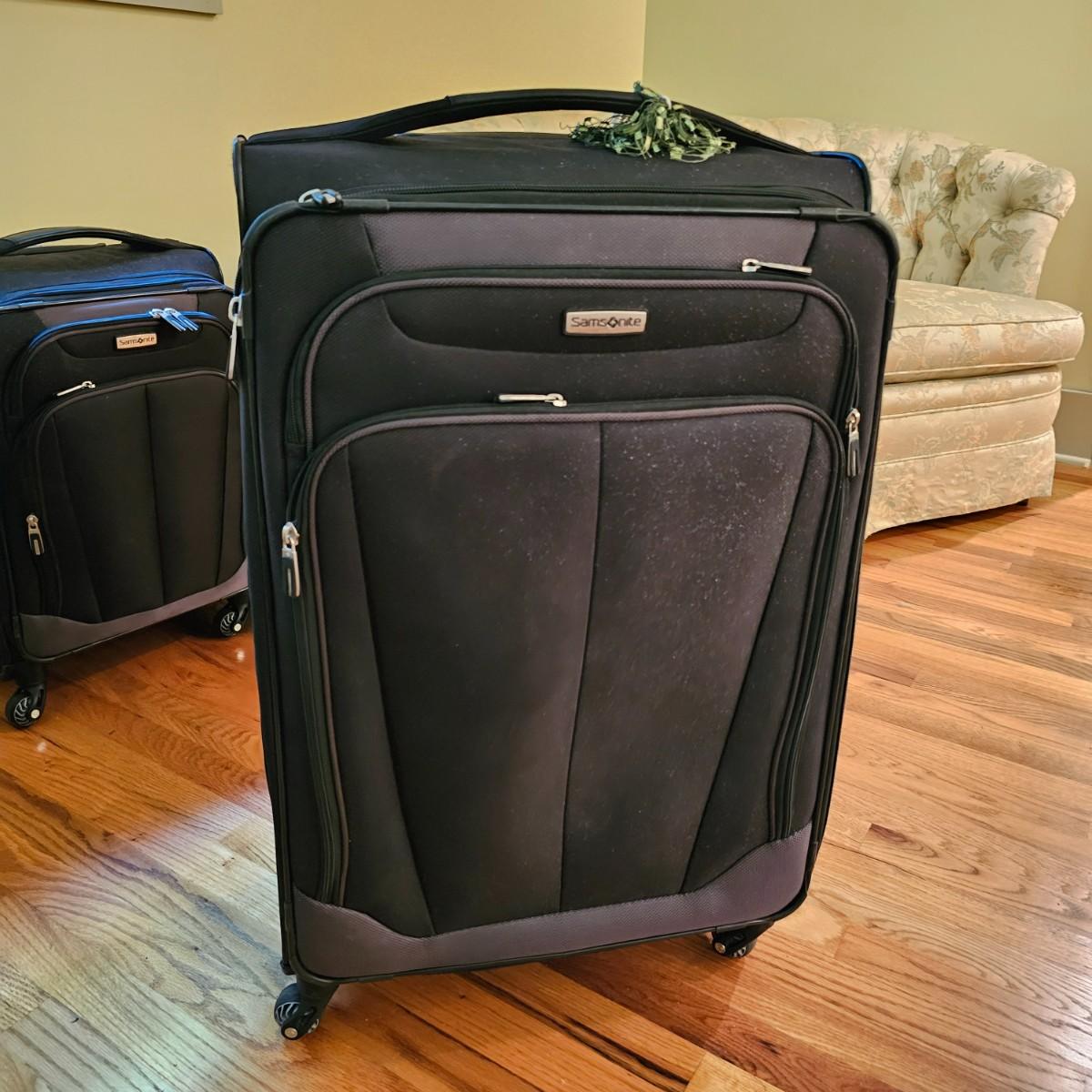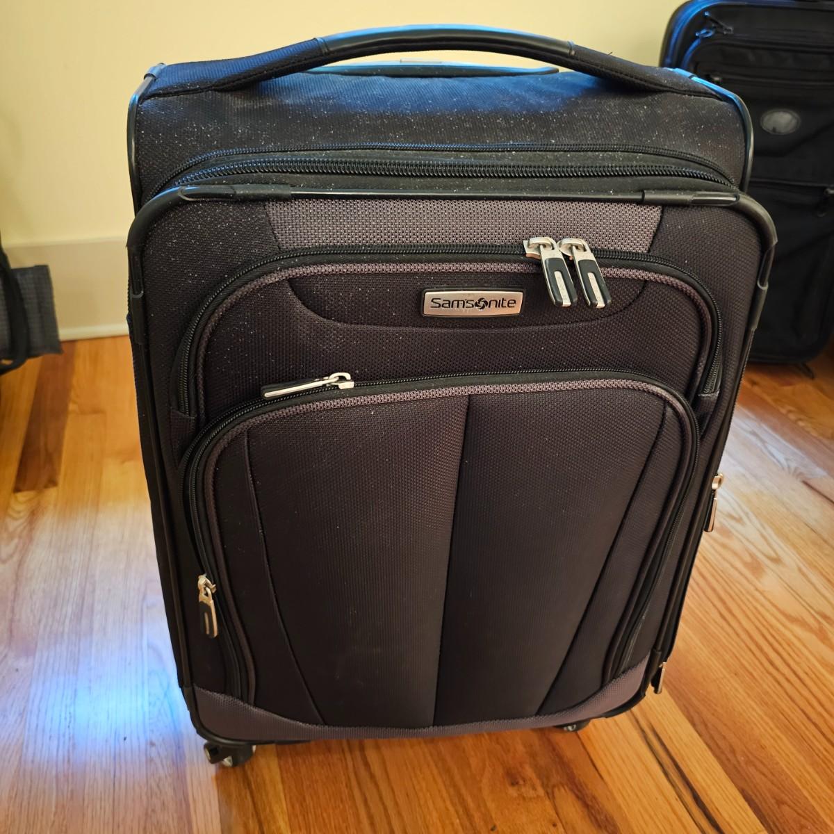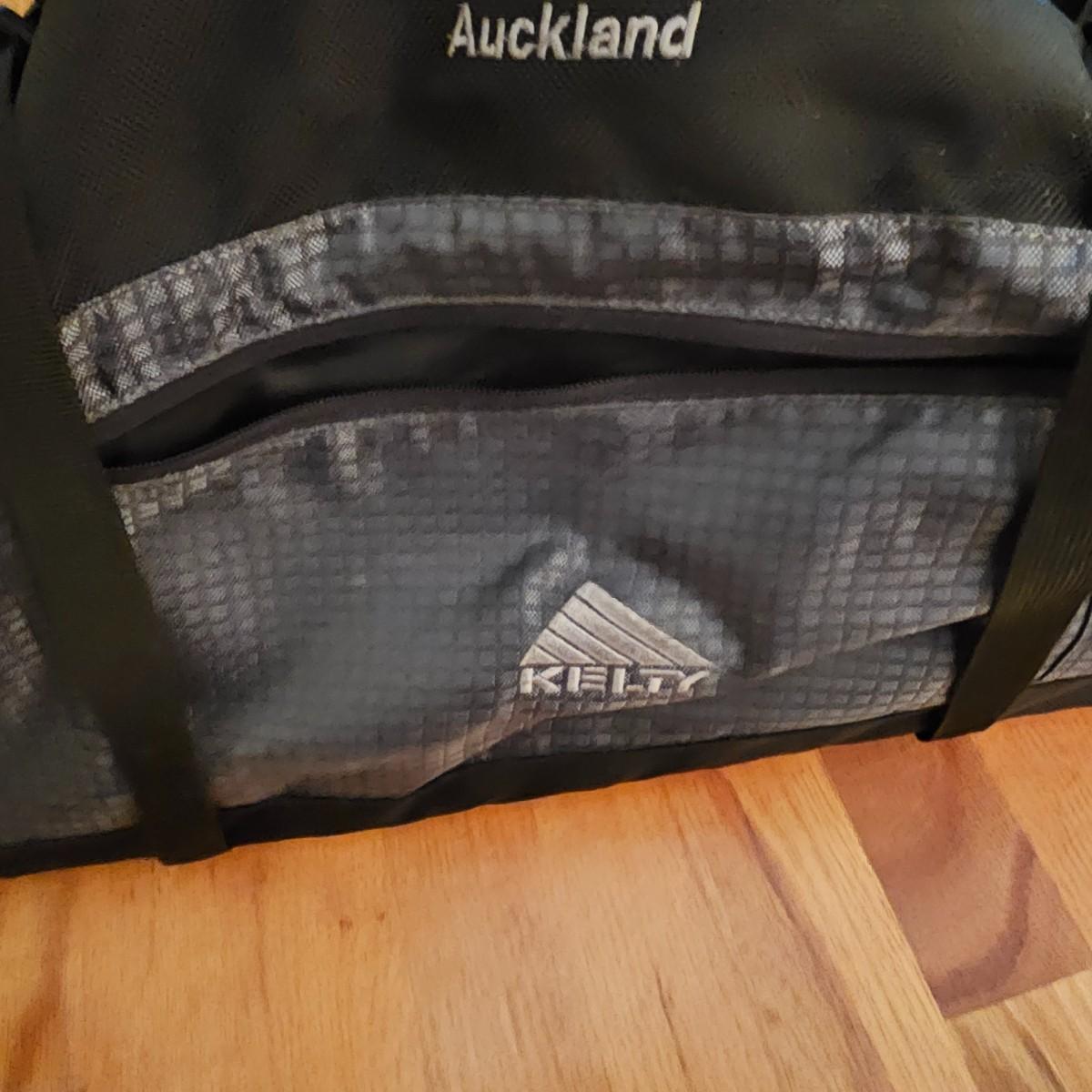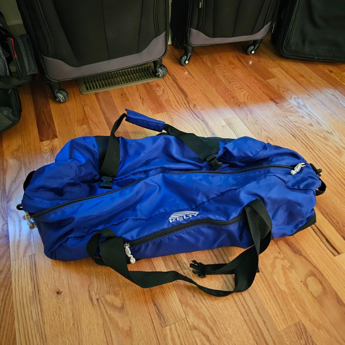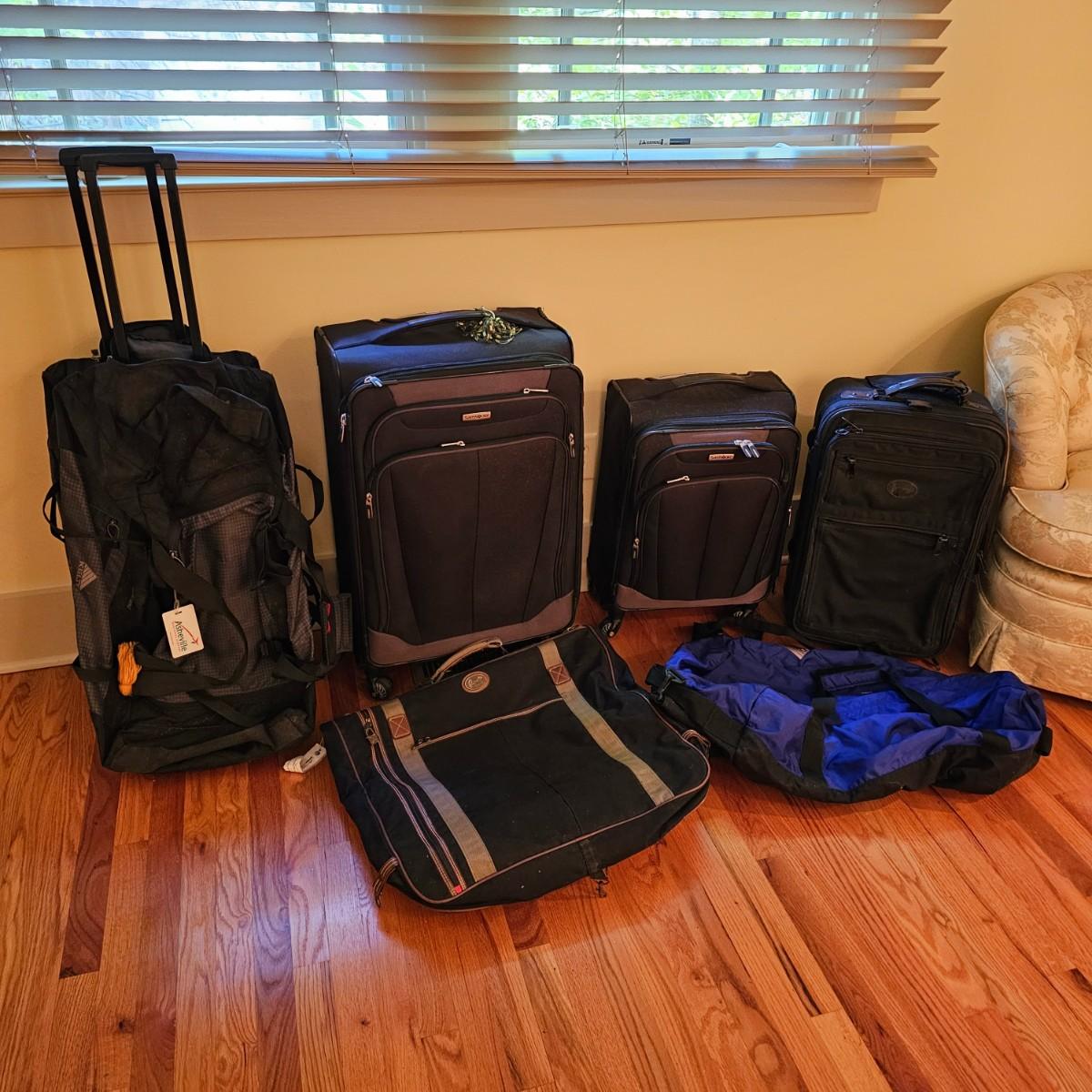 Seven pieces of luggage/travel gear. Two matching pieces of Samsonite luggage, large is 19" x 12" x 31"H, small is 16" x 11" x 24"H. Rolling wheels, extendable handles, multi pockets. One Kirkland small luggage, 14" x 9" x 24"H. Wheels and handle. One Ricardo hanging garment bag, 24" x 42" with carry handle. One Kelty large duffel style bag, 34" x 16". Two Kelty rolling cart/luggage combos, 17" x 9" x 31"H. Extendable handles and wheels. See photos for details. Local pickup only.