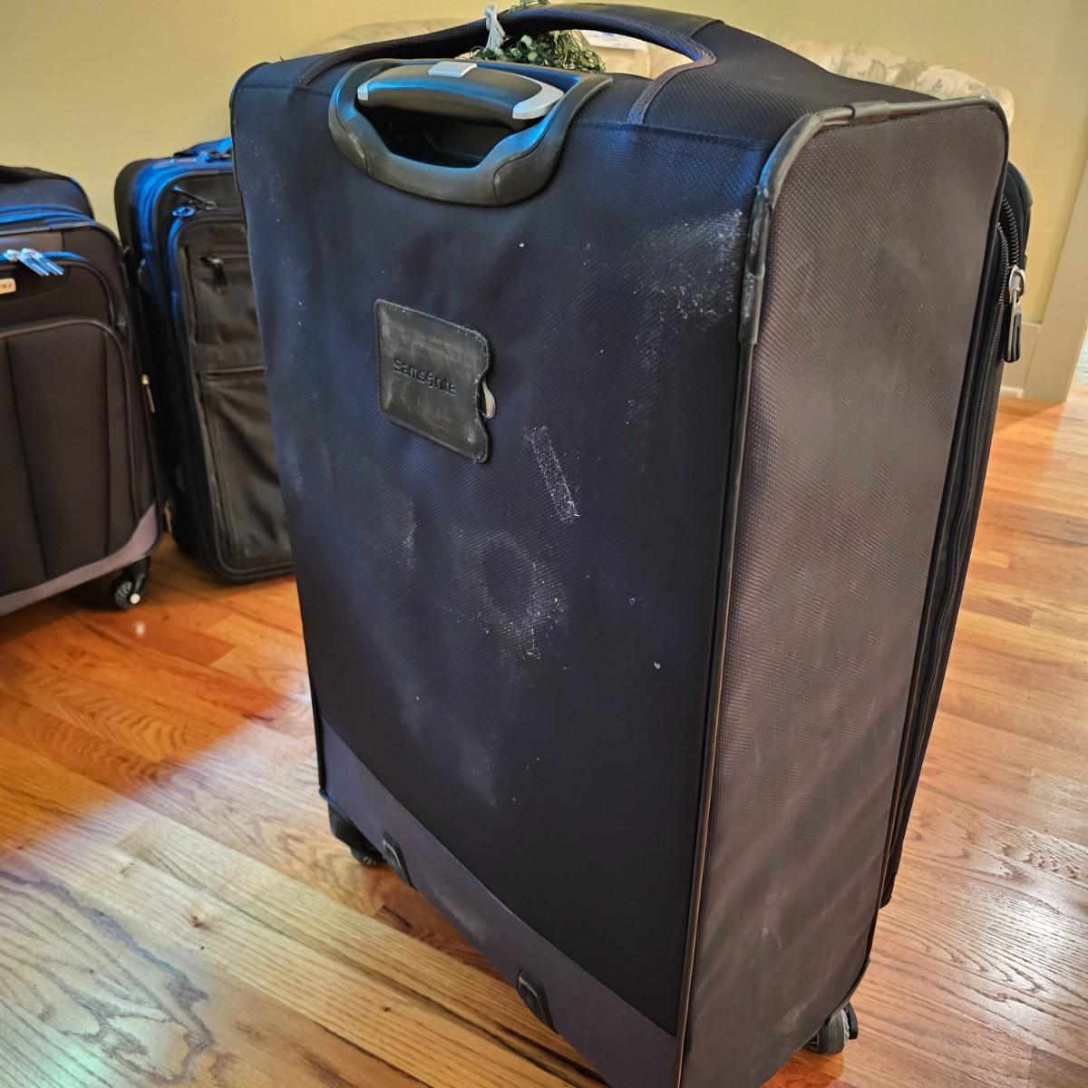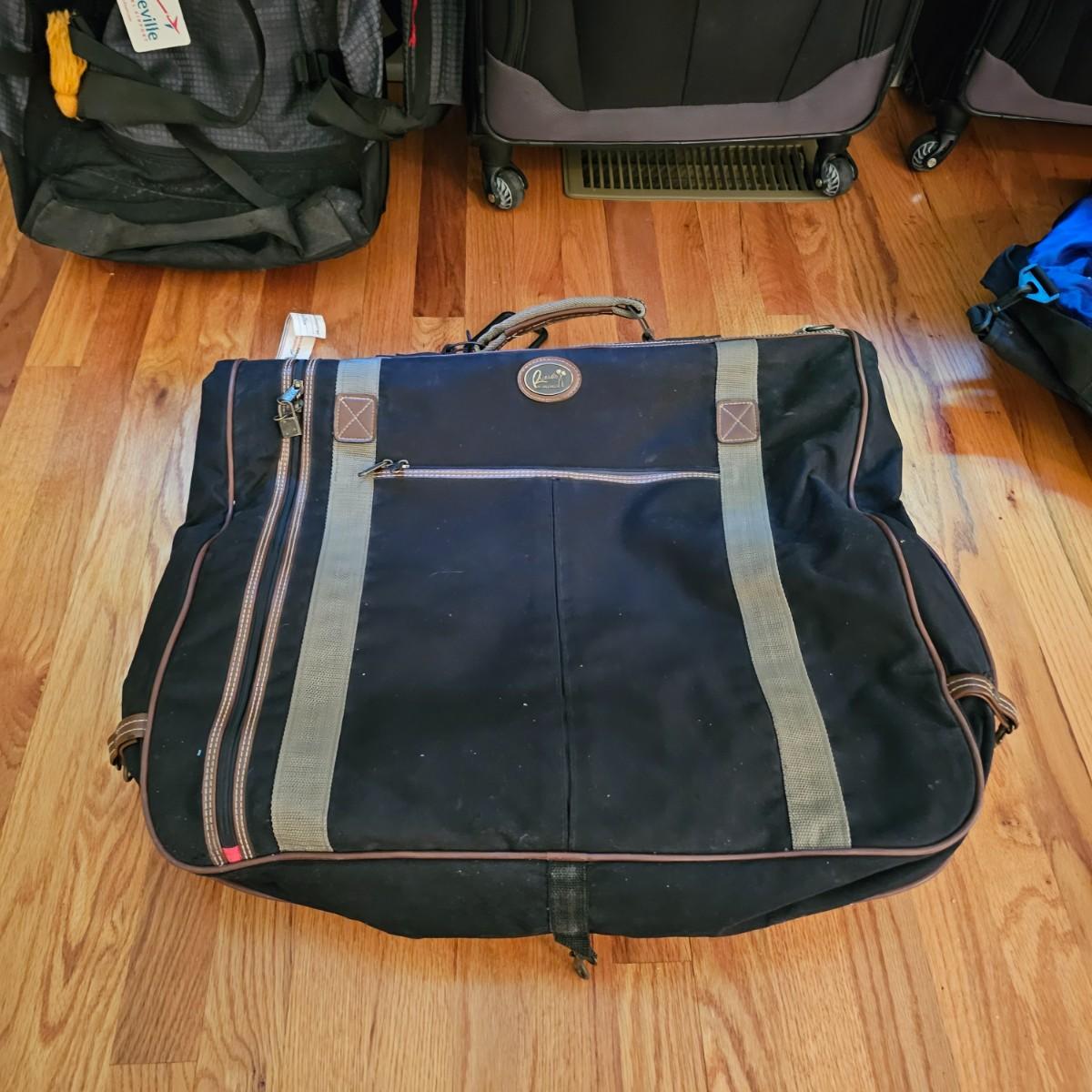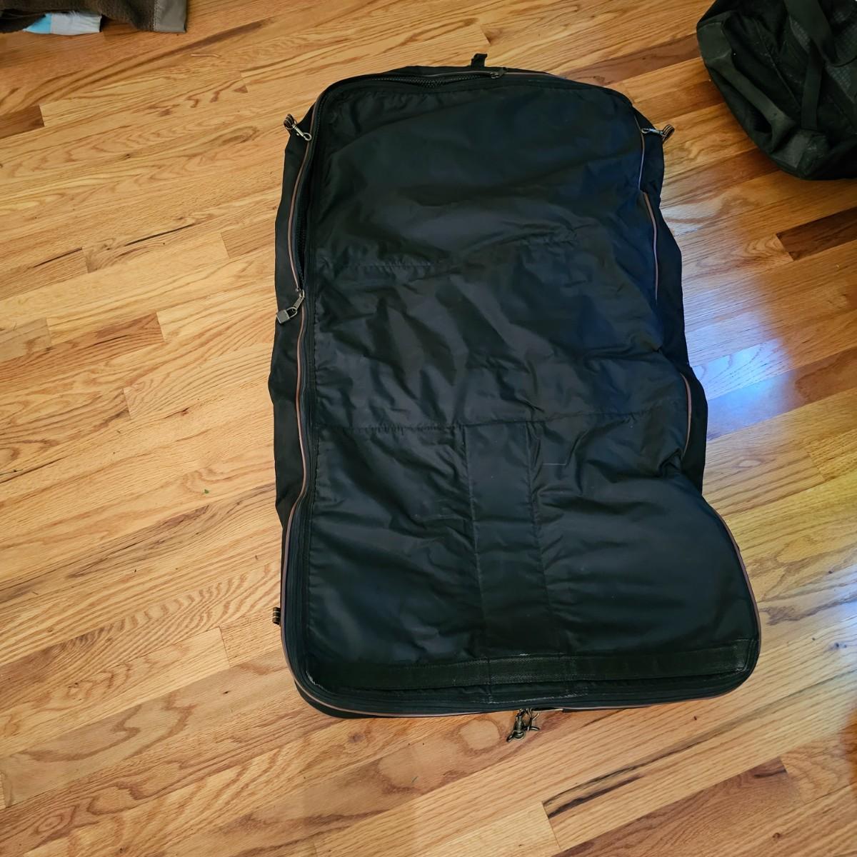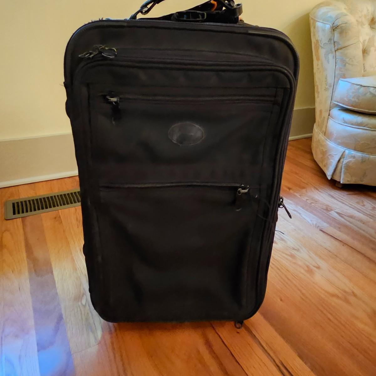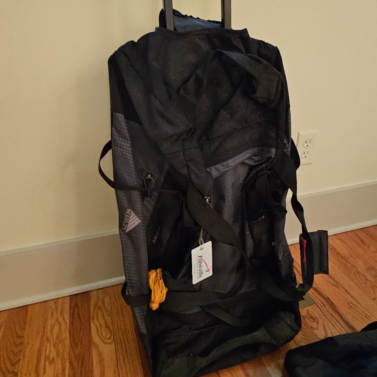 Seven pieces of luggage/travel gear. Two matching pieces of Samsonite luggage, large is 19" x 12" x 31"H, small is 16" x 11" x 24"H. Rolling wheels, extendable handles, multi pockets. One Kirkland small luggage, 14" x 9" x 24"H. Wheels and handle. One Ricardo hanging garment bag, 24" x 42" with carry handle. One Kelty large duffel style bag, 34" x 16". Two Kelty rolling cart/luggage combos, 17" x 9" x 31"H. Extendable handles and wheels. See photos for details. Local pickup only.