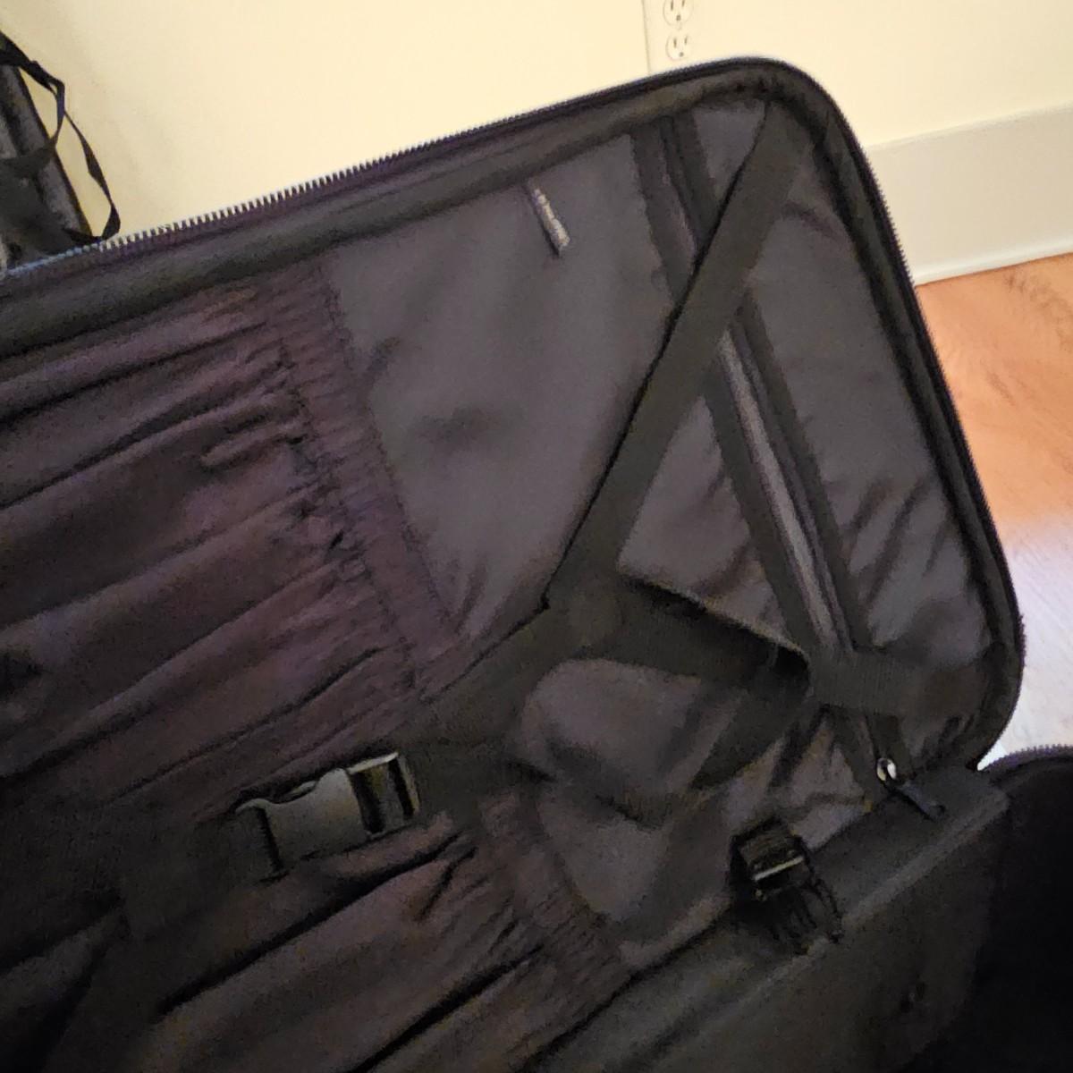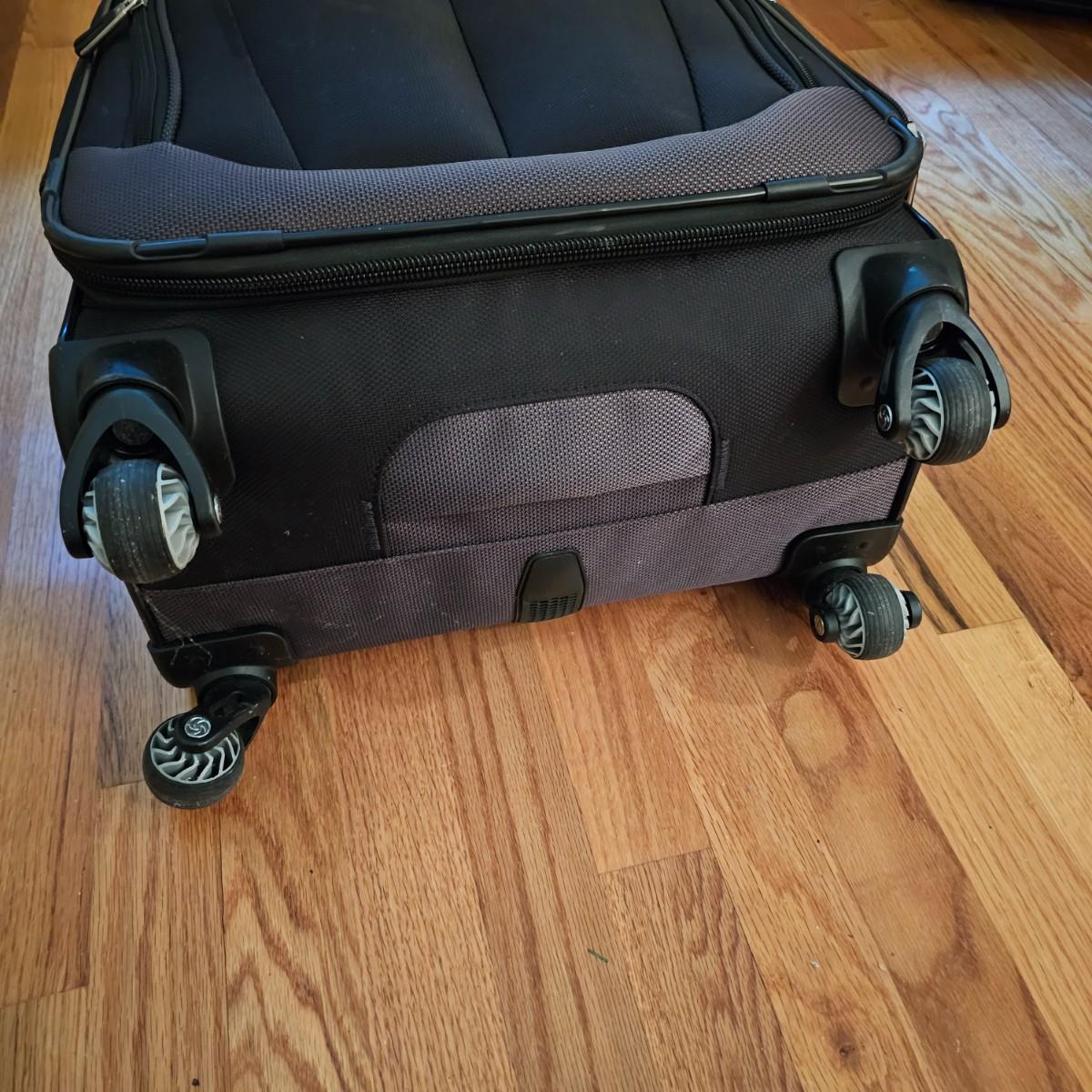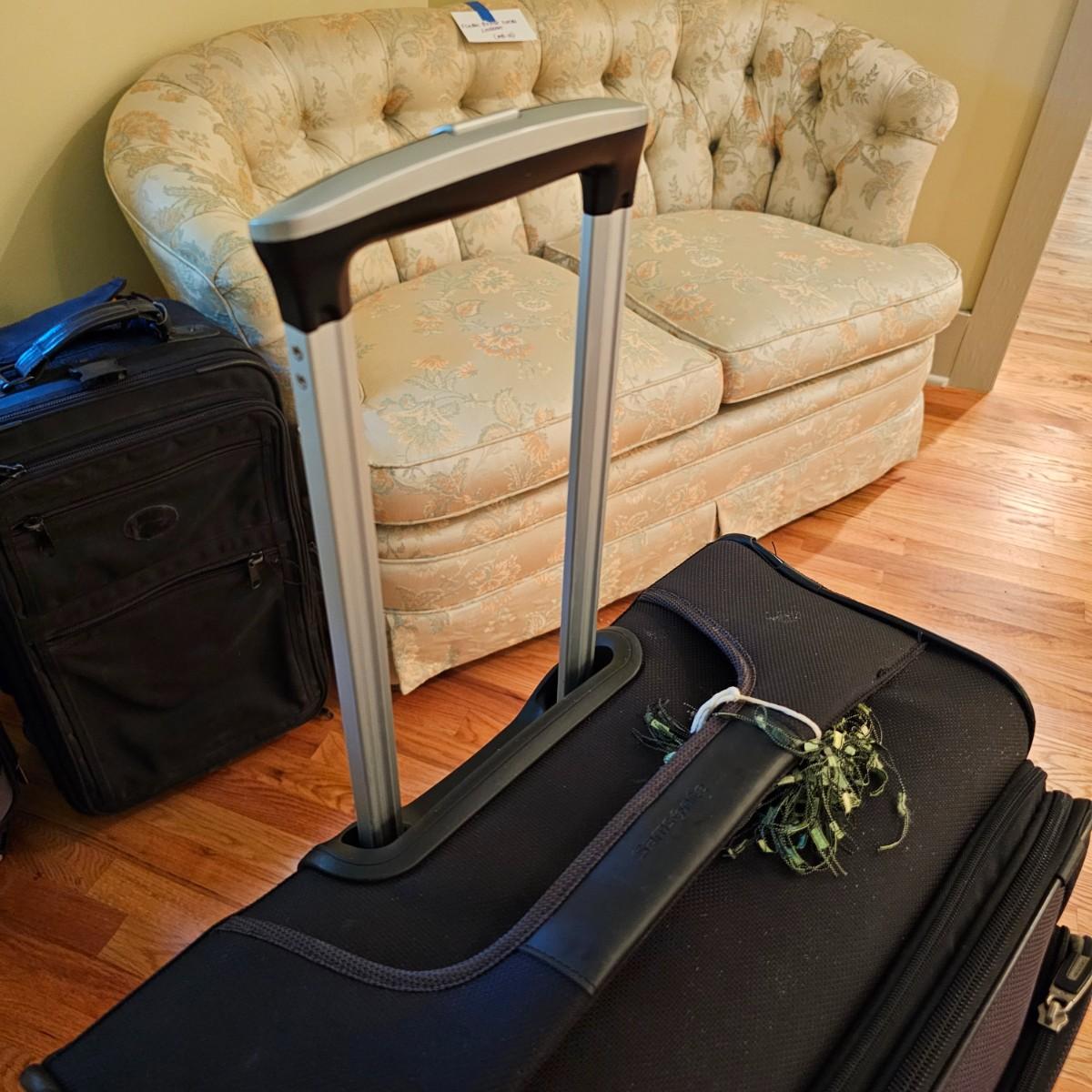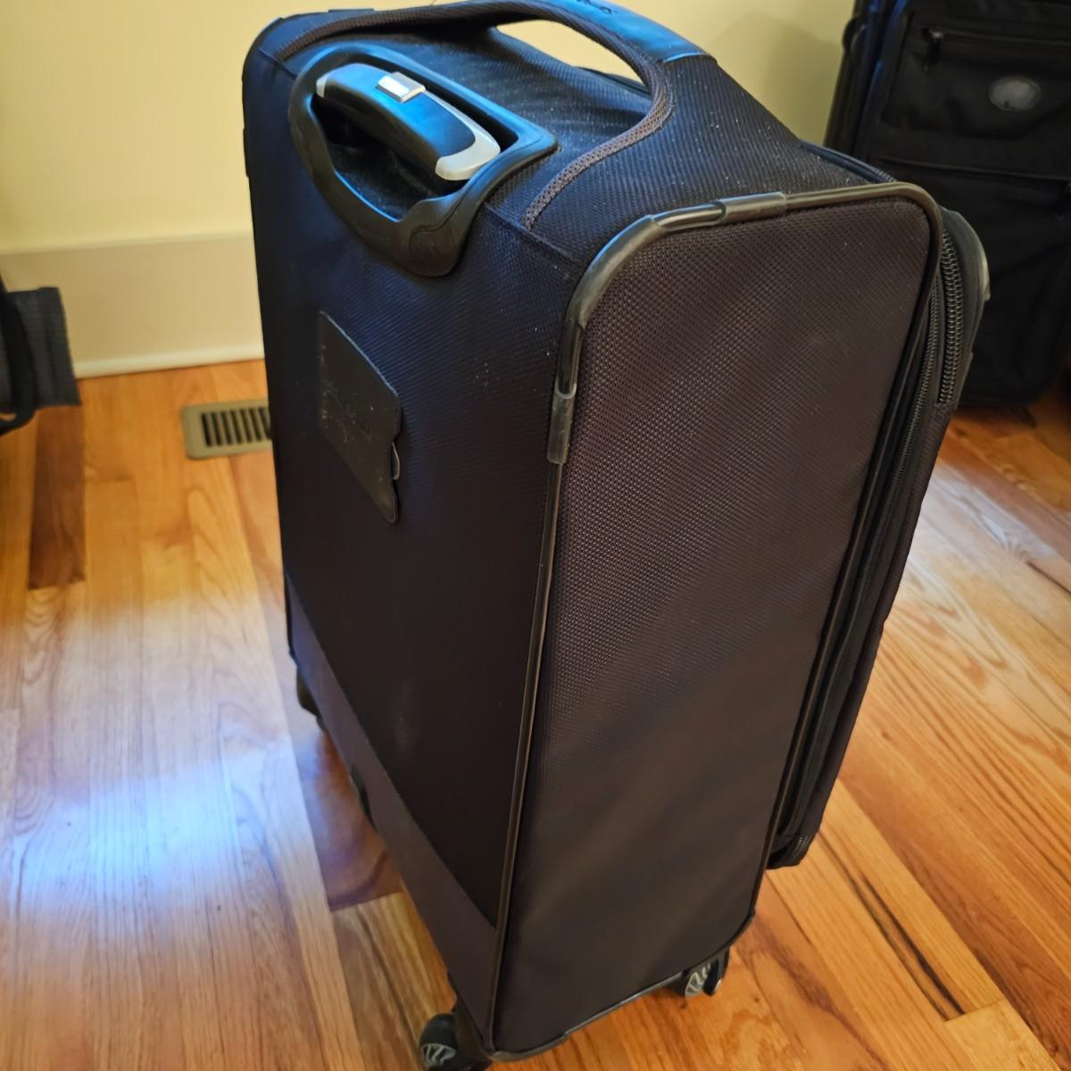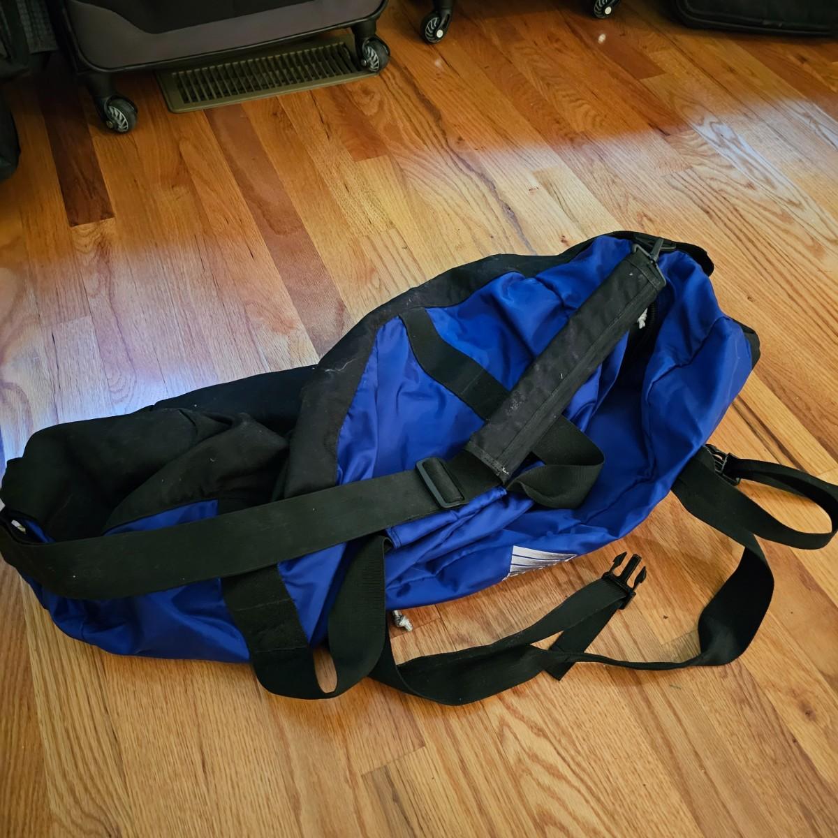 Seven pieces of luggage/travel gear. Two matching pieces of Samsonite luggage, large is 19" x 12" x 31"H, small is 16" x 11" x 24"H. Rolling wheels, extendable handles, multi pockets. One Kirkland small luggage, 14" x 9" x 24"H. Wheels and handle. One Ricardo hanging garment bag, 24" x 42" with carry handle. One Kelty large duffel style bag, 34" x 16". Two Kelty rolling cart/luggage combos, 17" x 9" x 31"H. Extendable handles and wheels. See photos for details. Local pickup only.