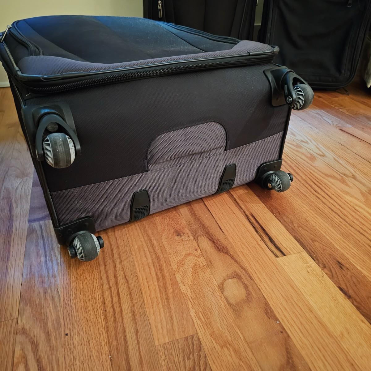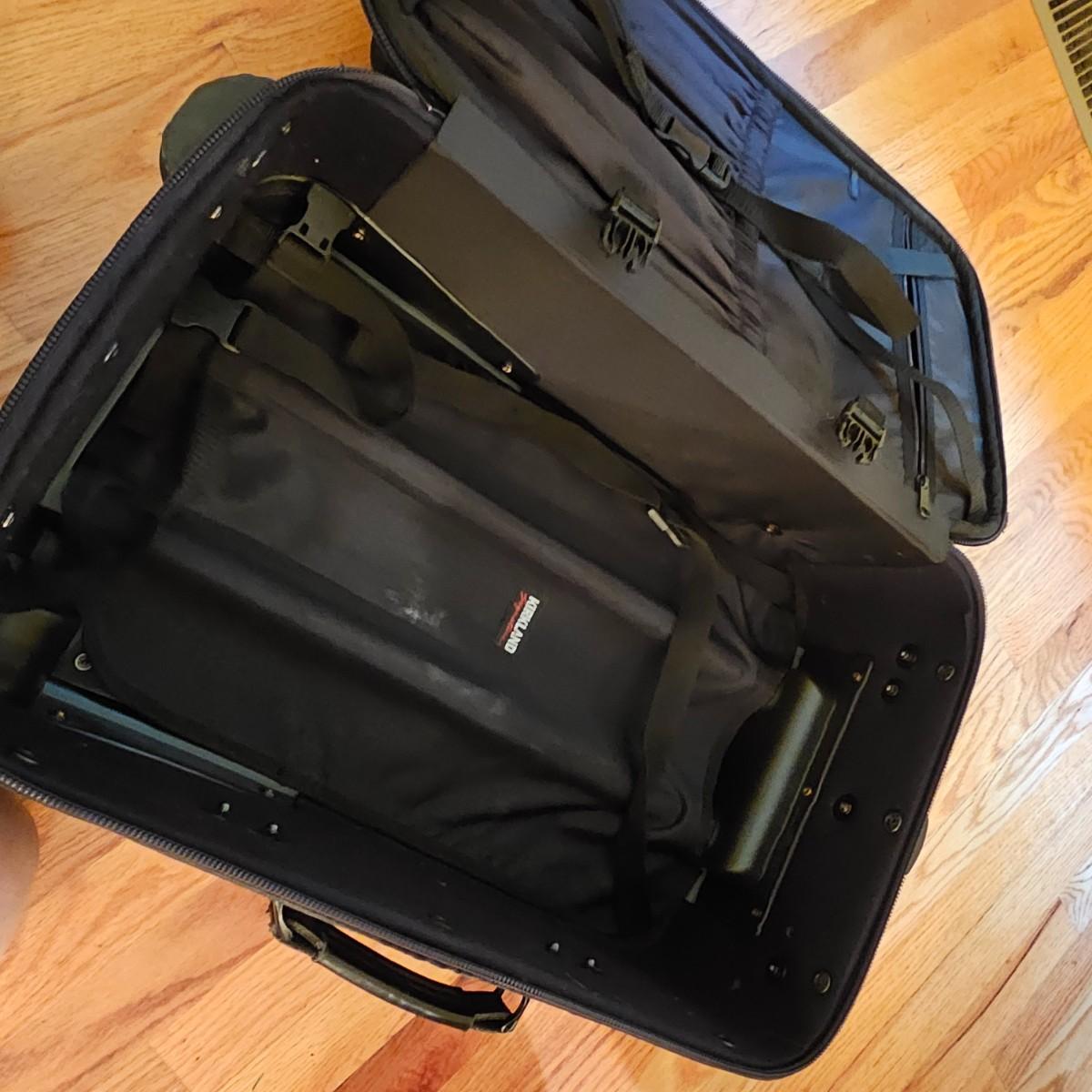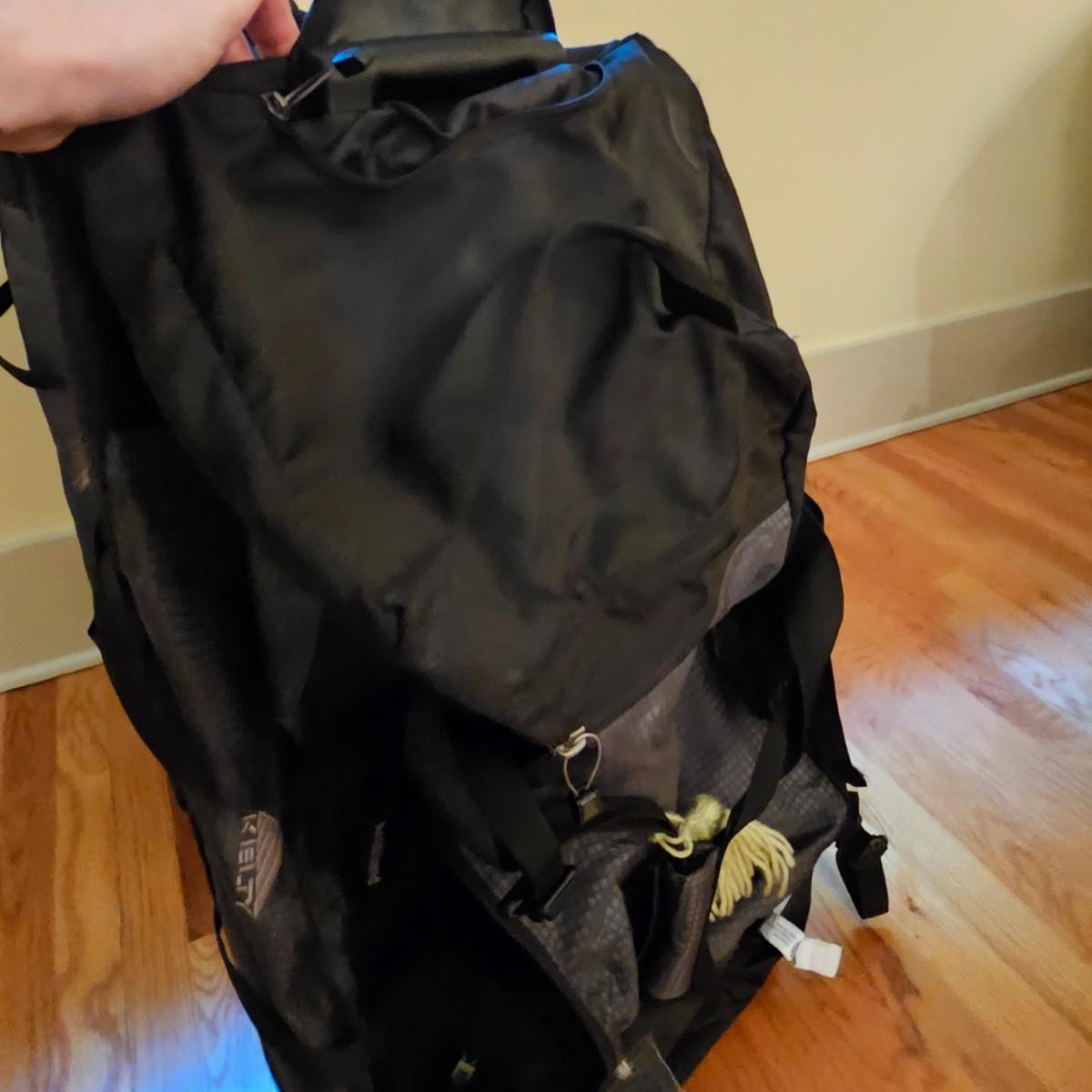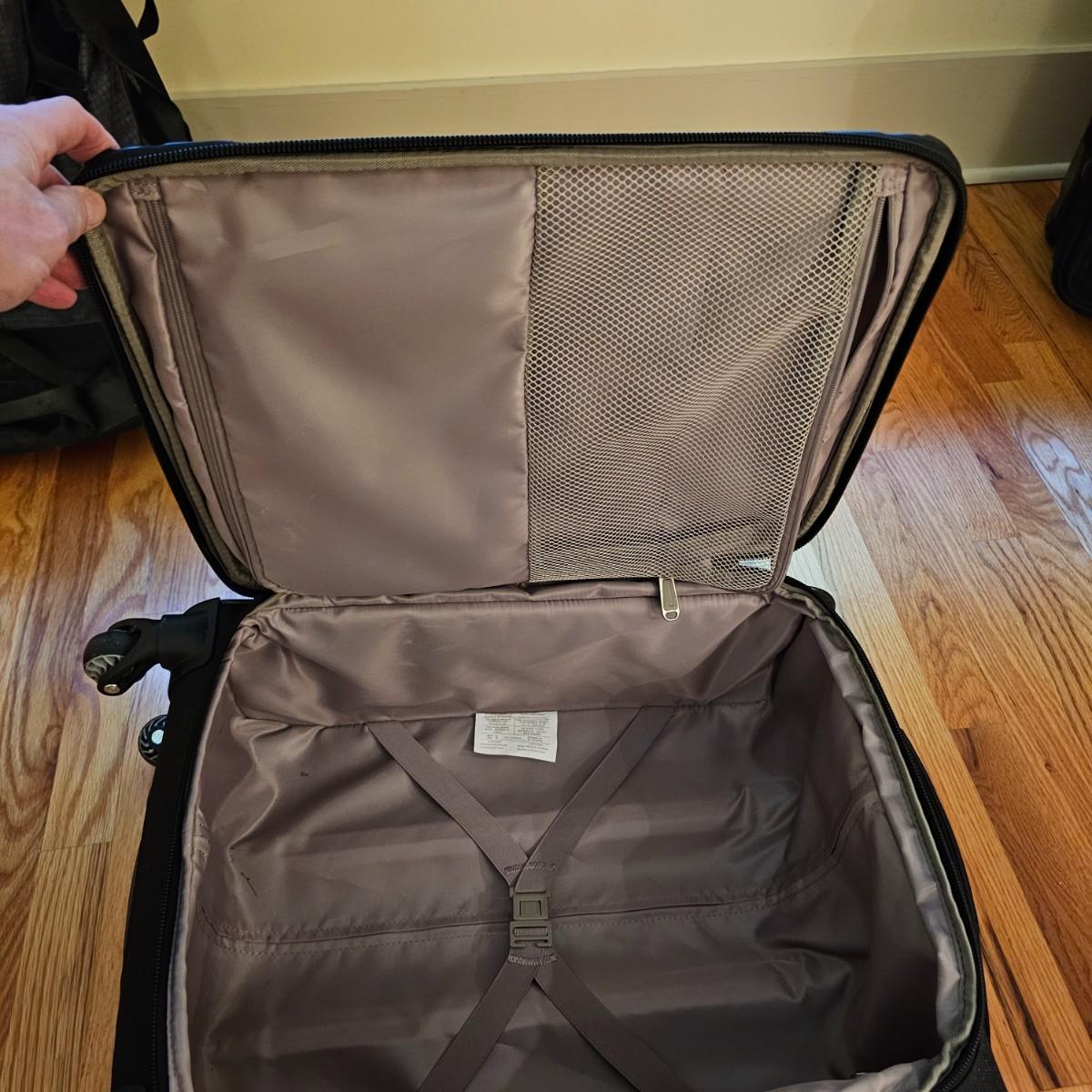 Seven pieces of luggage/travel gear. Two matching pieces of Samsonite luggage, large is 19" x 12" x 31"H, small is 16" x 11" x 24"H. Rolling wheels, extendable handles, multi pockets. One Kirkland small luggage, 14" x 9" x 24"H. Wheels and handle. One Ricardo hanging garment bag, 24" x 42" with carry handle. One Kelty large duffel style bag, 34" x 16". Two Kelty rolling cart/luggage combos, 17" x 9" x 31"H. Extendable handles and wheels. See photos for details. Local pickup only.