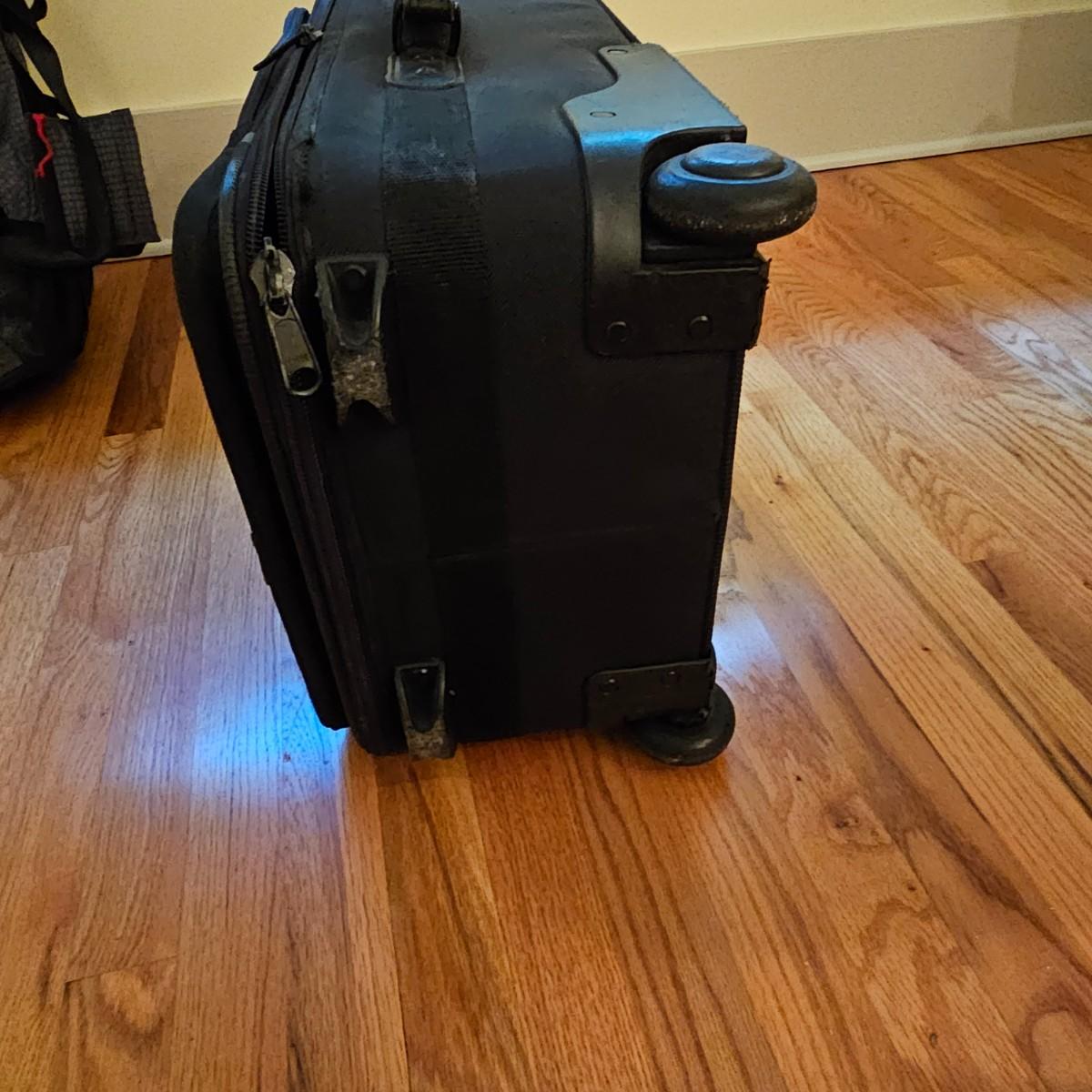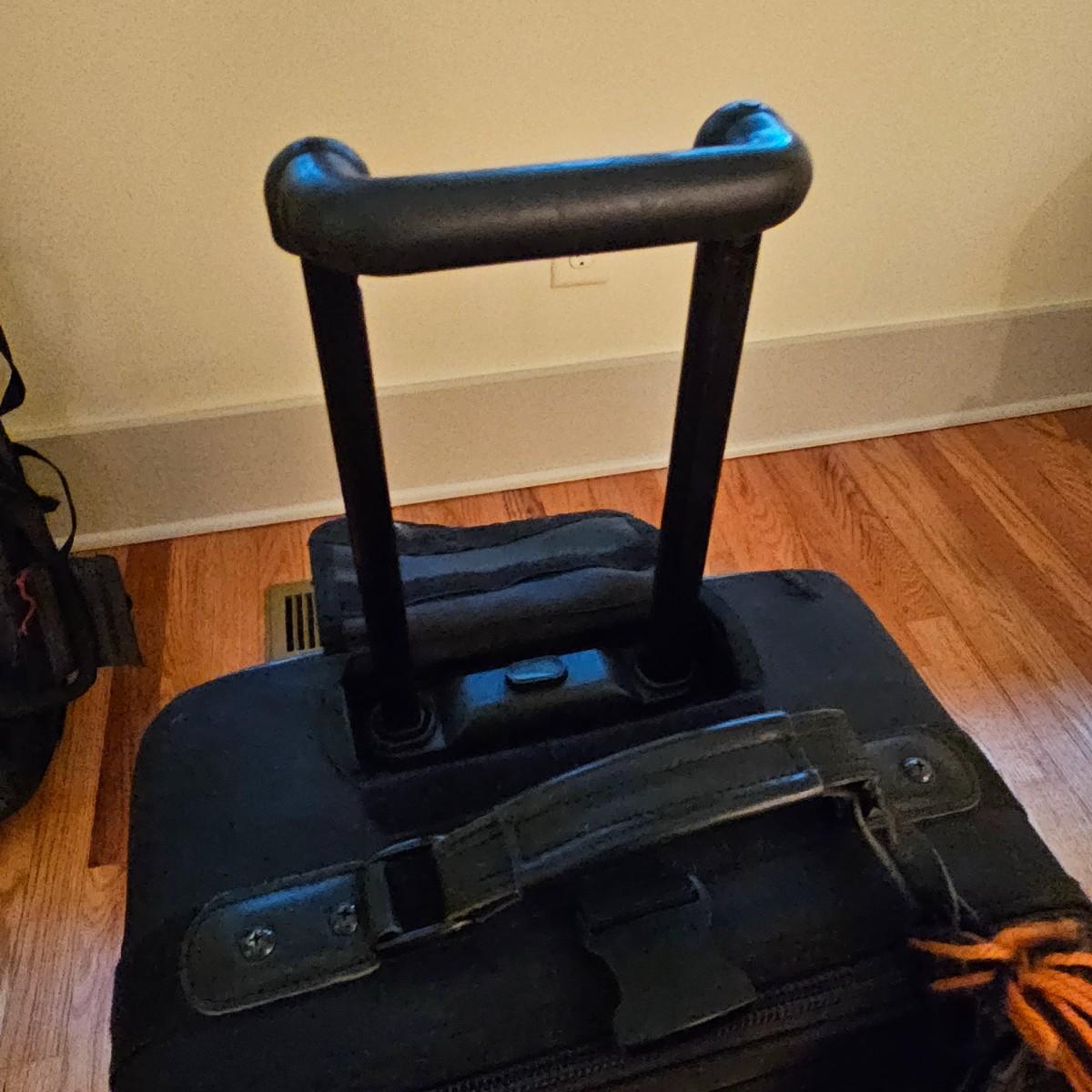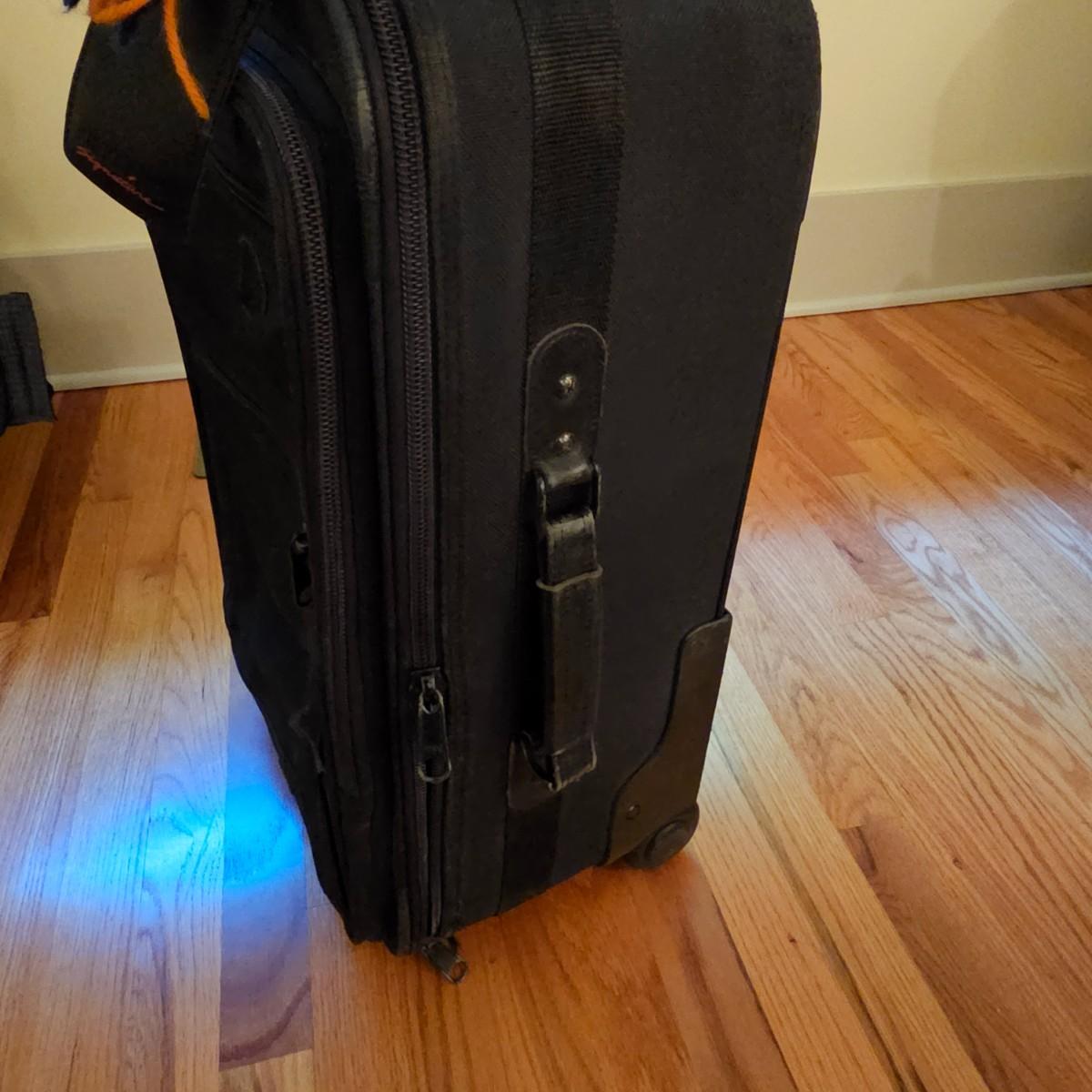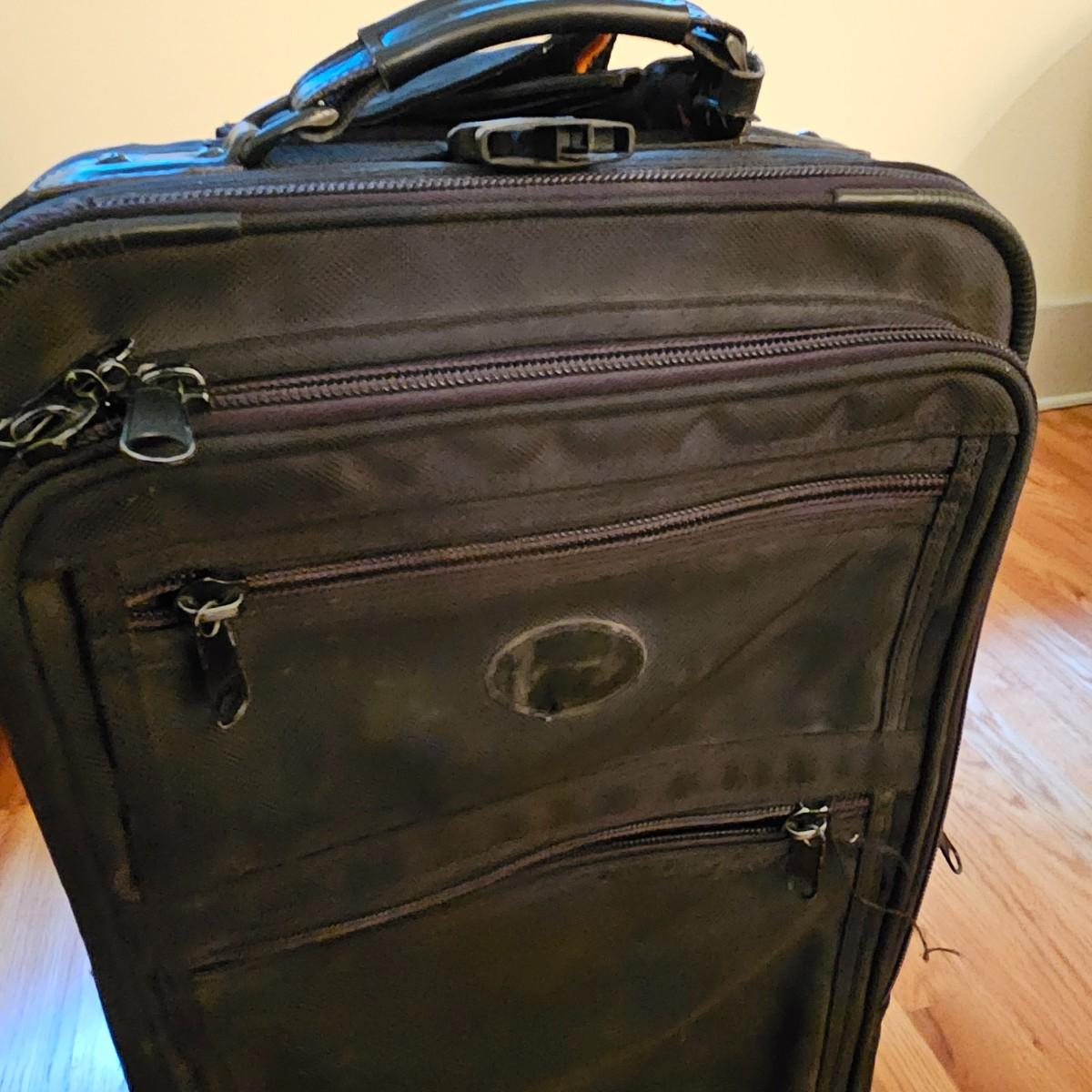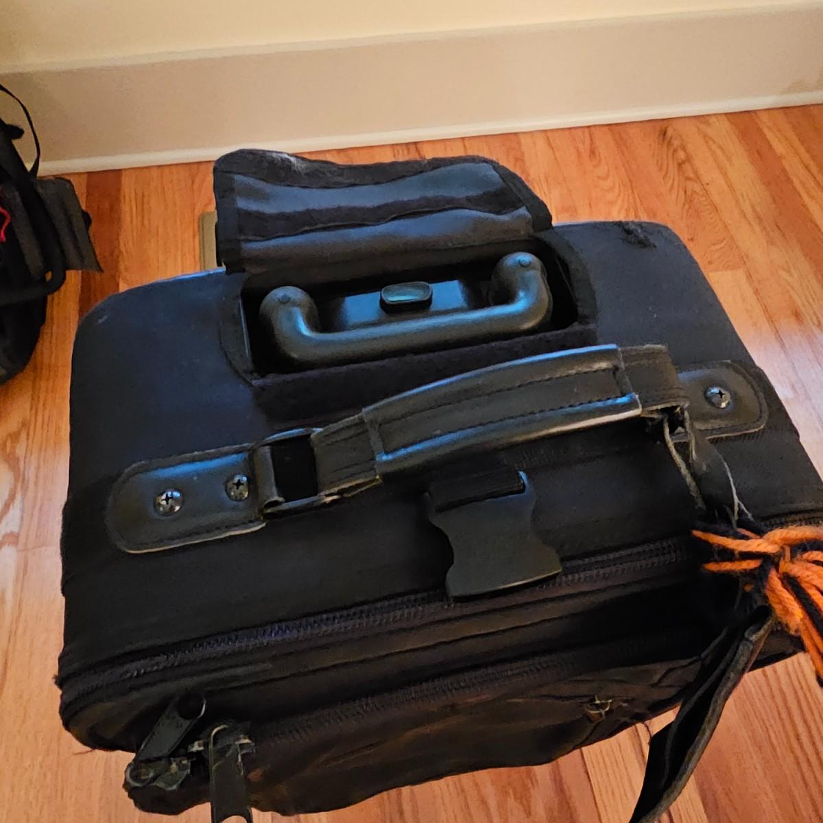 Seven pieces of luggage/travel gear. Two matching pieces of Samsonite luggage, large is 19" x 12" x 31"H, small is 16" x 11" x 24"H. Rolling wheels, extendable handles, multi pockets. One Kirkland small luggage, 14" x 9" x 24"H. Wheels and handle. One Ricardo hanging garment bag, 24" x 42" with carry handle. One Kelty large duffel style bag, 34" x 16". Two Kelty rolling cart/luggage combos, 17" x 9" x 31"H. Extendable handles and wheels. See photos for details. Local pickup only.