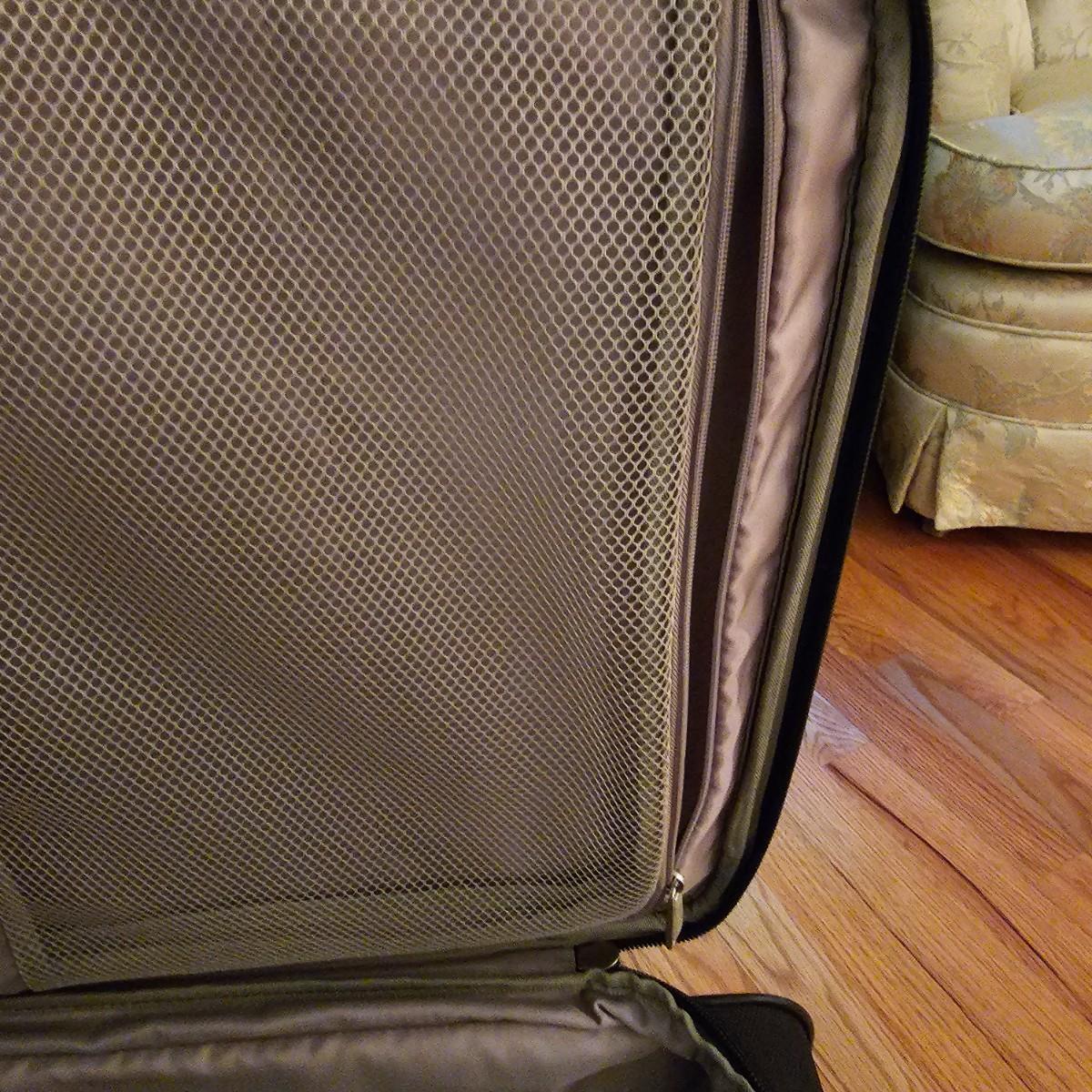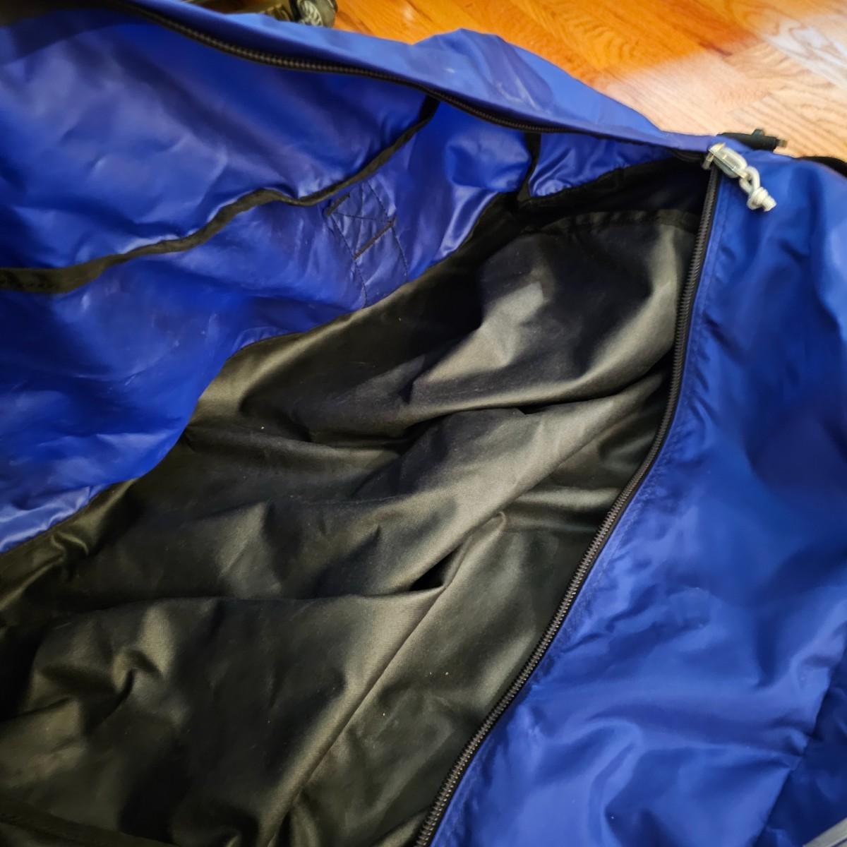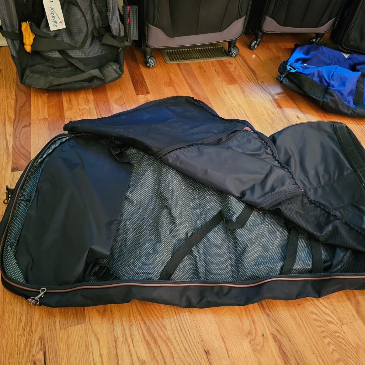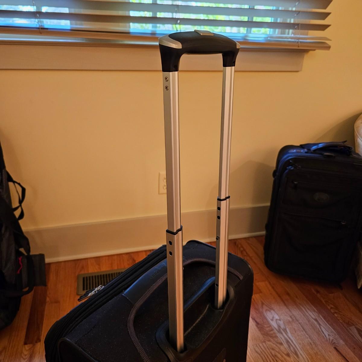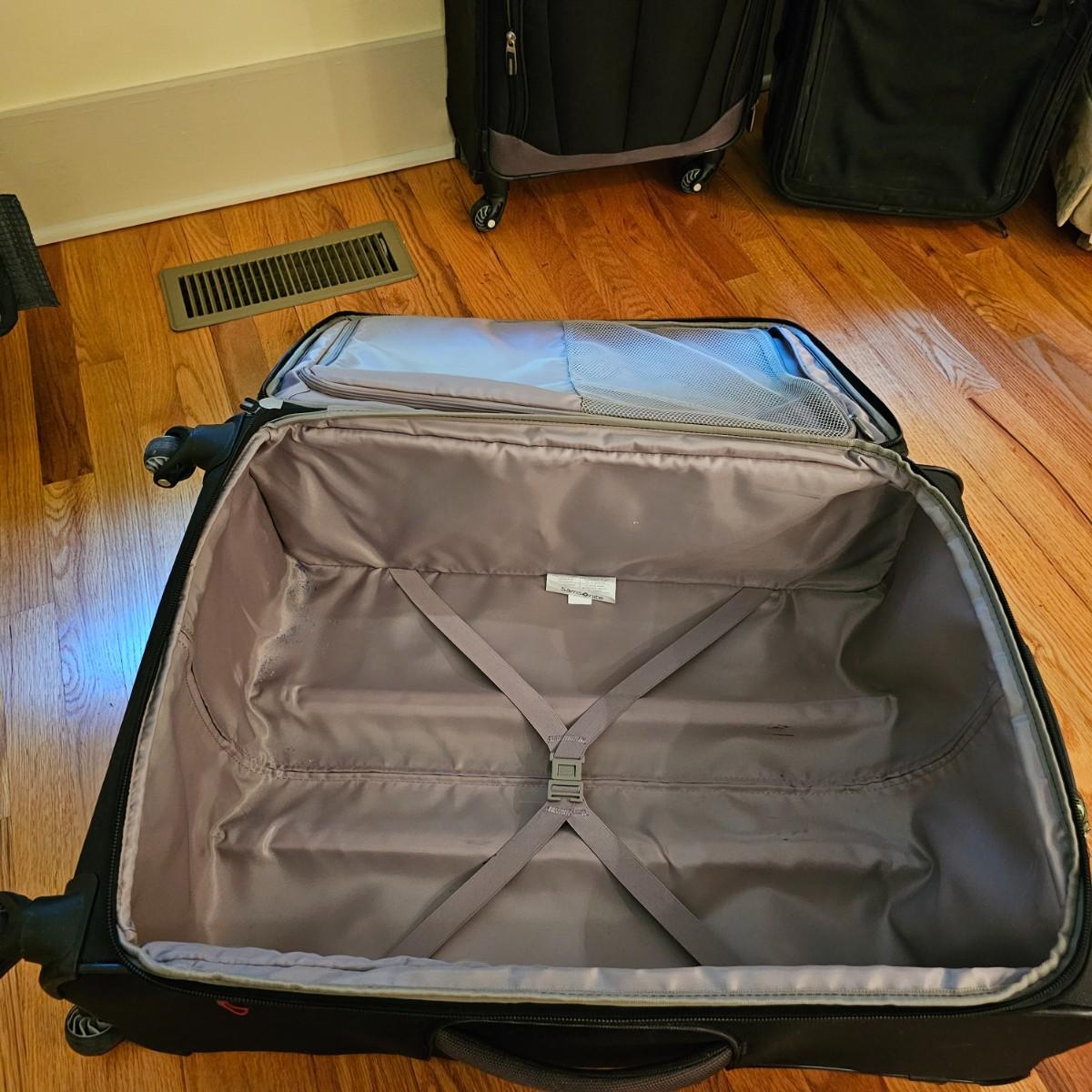 Seven pieces of luggage/travel gear. Two matching pieces of Samsonite luggage, large is 19" x 12" x 31"H, small is 16" x 11" x 24"H. Rolling wheels, extendable handles, multi pockets. One Kirkland small luggage, 14" x 9" x 24"H. Wheels and handle. One Ricardo hanging garment bag, 24" x 42" with carry handle. One Kelty large duffel style bag, 34" x 16". Two Kelty rolling cart/luggage combos, 17" x 9" x 31"H. Extendable handles and wheels. See photos for details. Local pickup only.