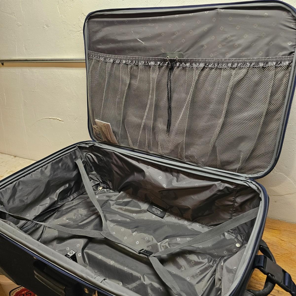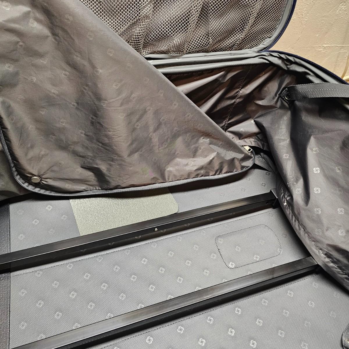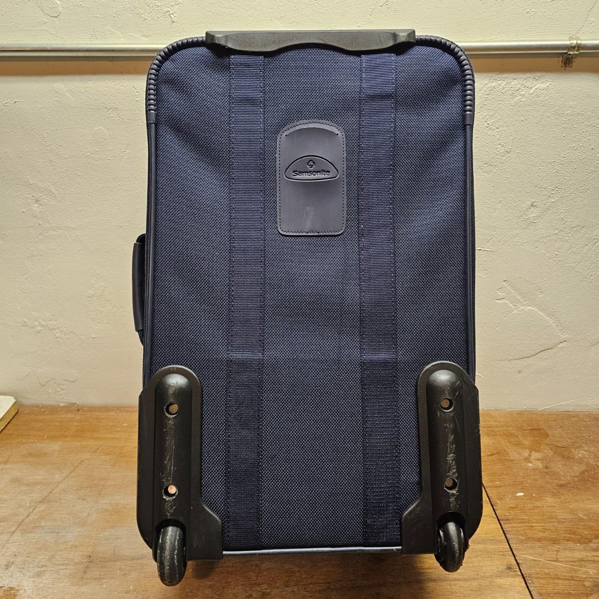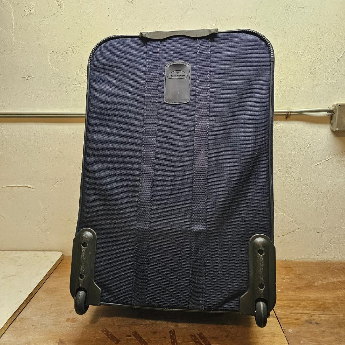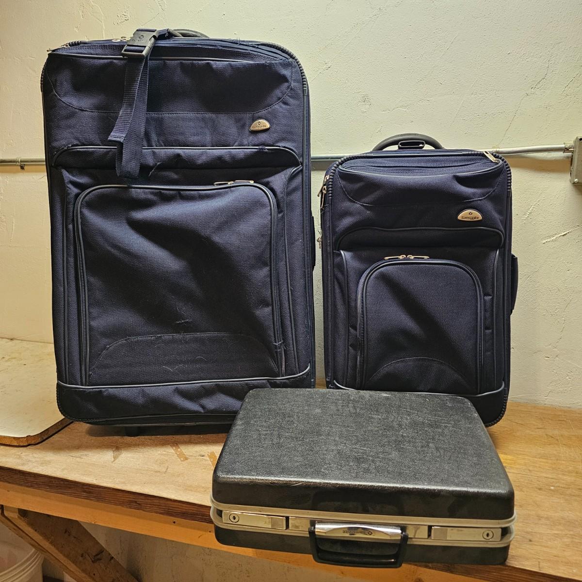 A matching set of dark blue Samsonite travel luggage and also a Samsonite hardshell briefcase. Larger suitcase has two outside compartments, extendable pull handle, wheels and more. Webbing strap inside to hold items securely. Measures 22" x 13" x 35"H. Has a few small pull spots on exterior. Smaller suitcase has same features as larger, measures 16" x 10" x 26"H. Briefcase has folder spots in lid but is otherwise open inside. Measures 18" x 14" x 5"H. See photos for details. Local pickup only.