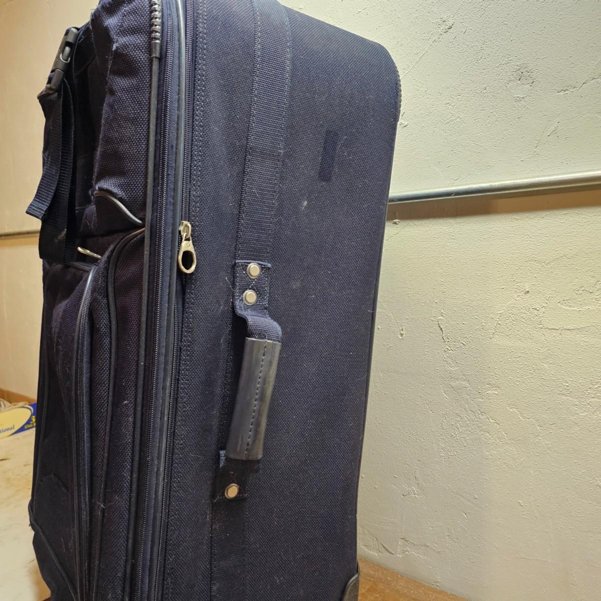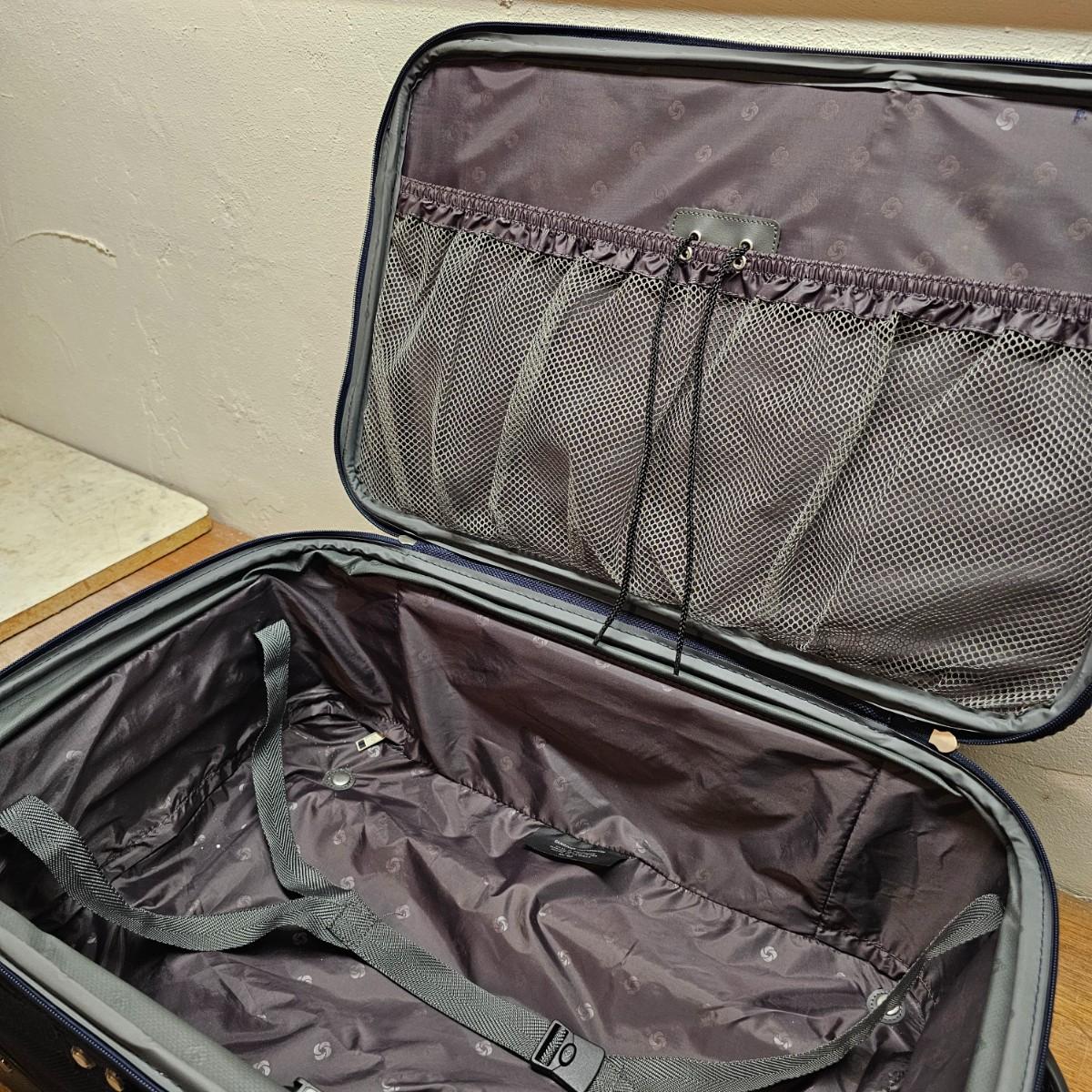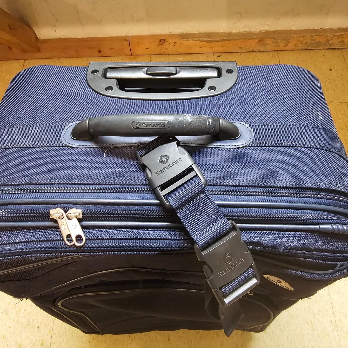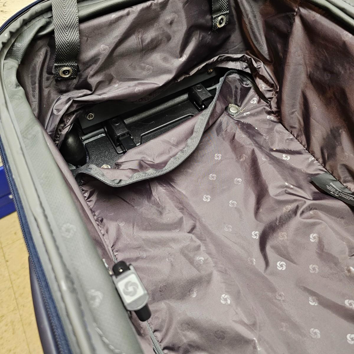 A matching set of dark blue Samsonite travel luggage and also a Samsonite hardshell briefcase. Larger suitcase has two outside compartments, extendable pull handle, wheels and more. Webbing strap inside to hold items securely. Measures 22" x 13" x 35"H. Has a few small pull spots on exterior. Smaller suitcase has same features as larger, measures 16" x 10" x 26"H. Briefcase has folder spots in lid but is otherwise open inside. Measures 18" x 14" x 5"H. See photos for details. Local pickup only.