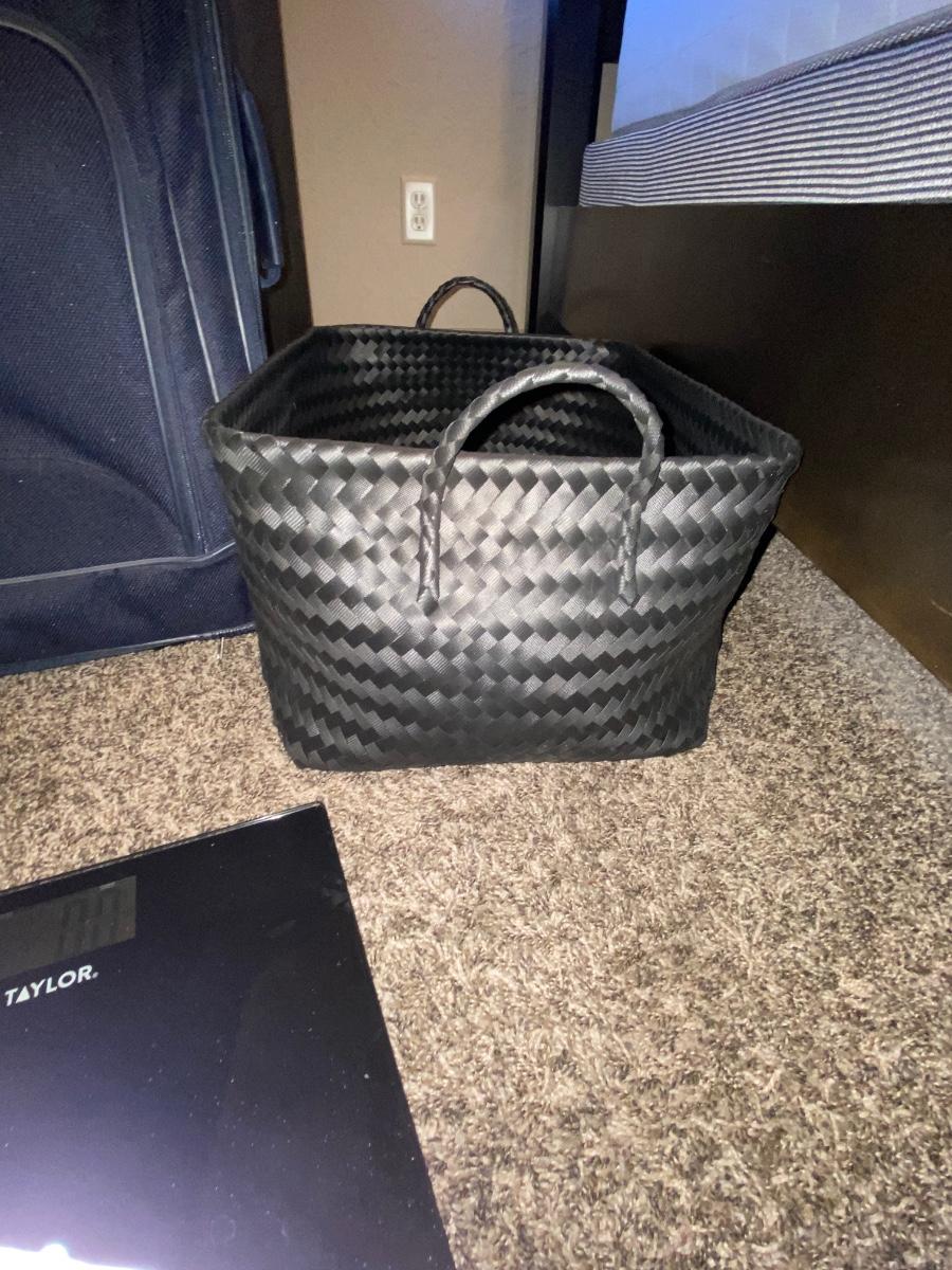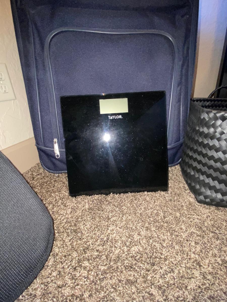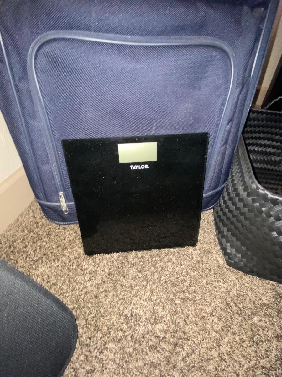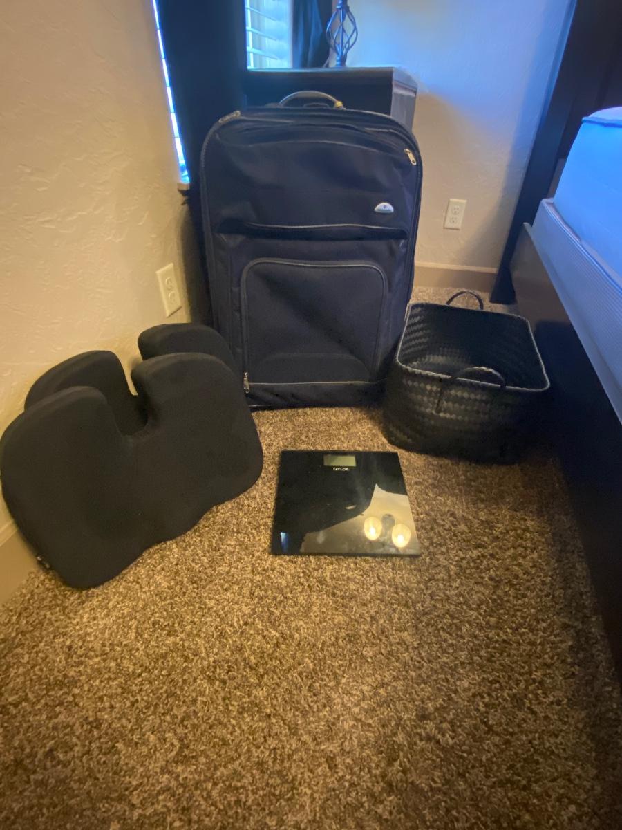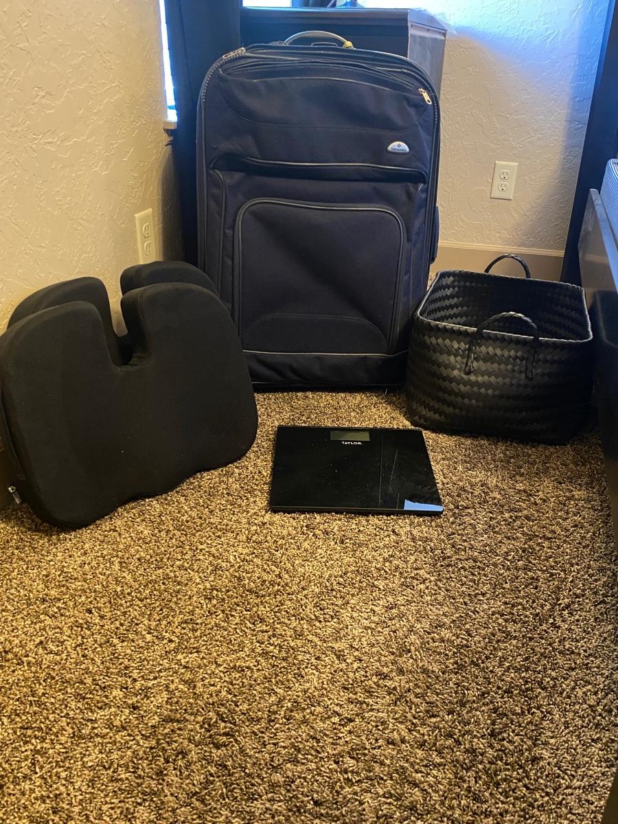 SAMSONITE SUITCASE, TAYLOR SCALE, SEAT CUSHIONS, WEAVED BASKET
