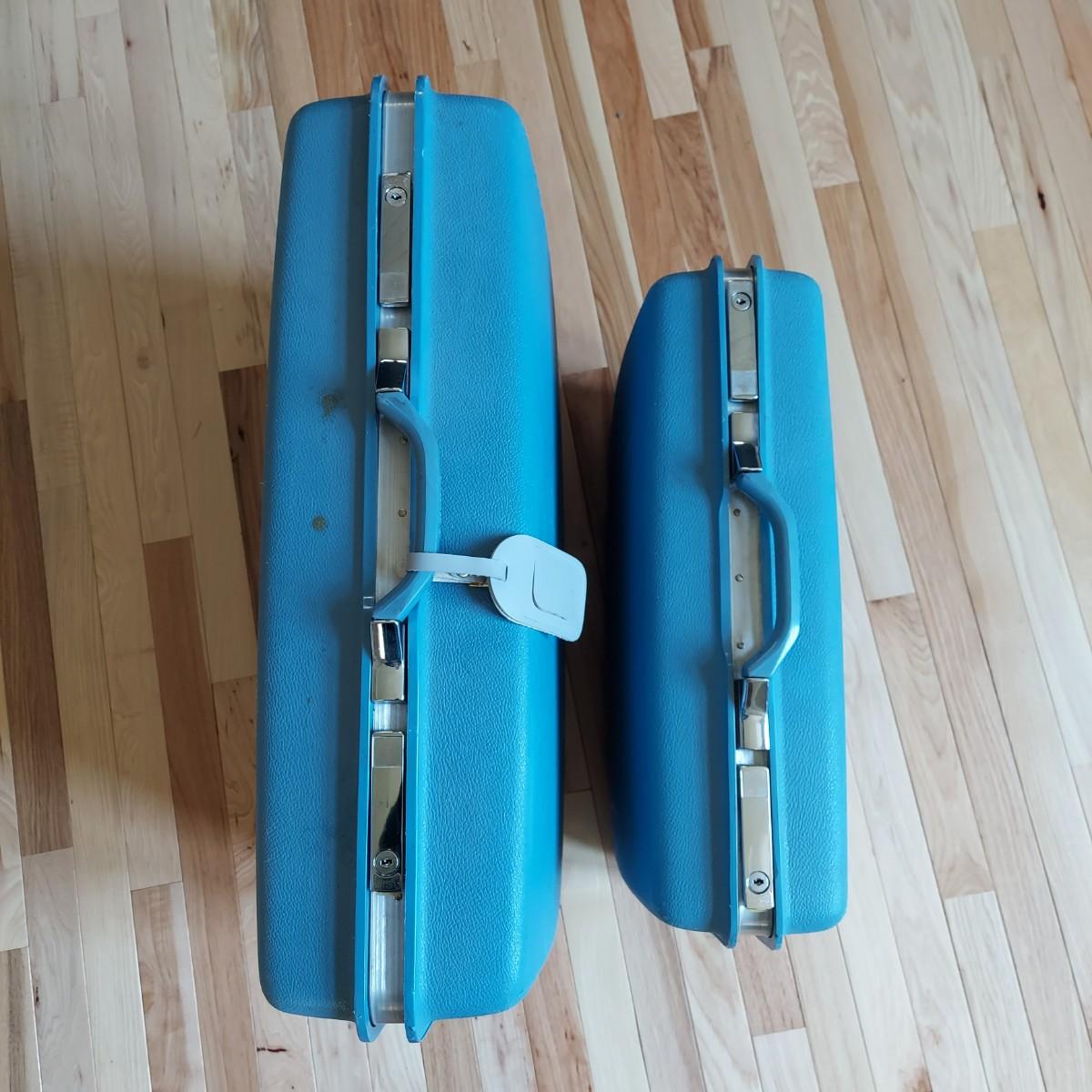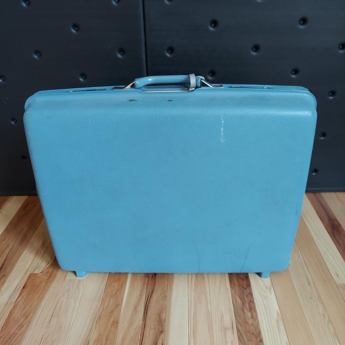 Two blue Samsonite hard body suitcases. Samsonite Montbello II style. Small luggage measures approximately 21 x 6 x 16"H. Large piece measures approximately 26 x 7 x 20"H. Local Pickup Only.