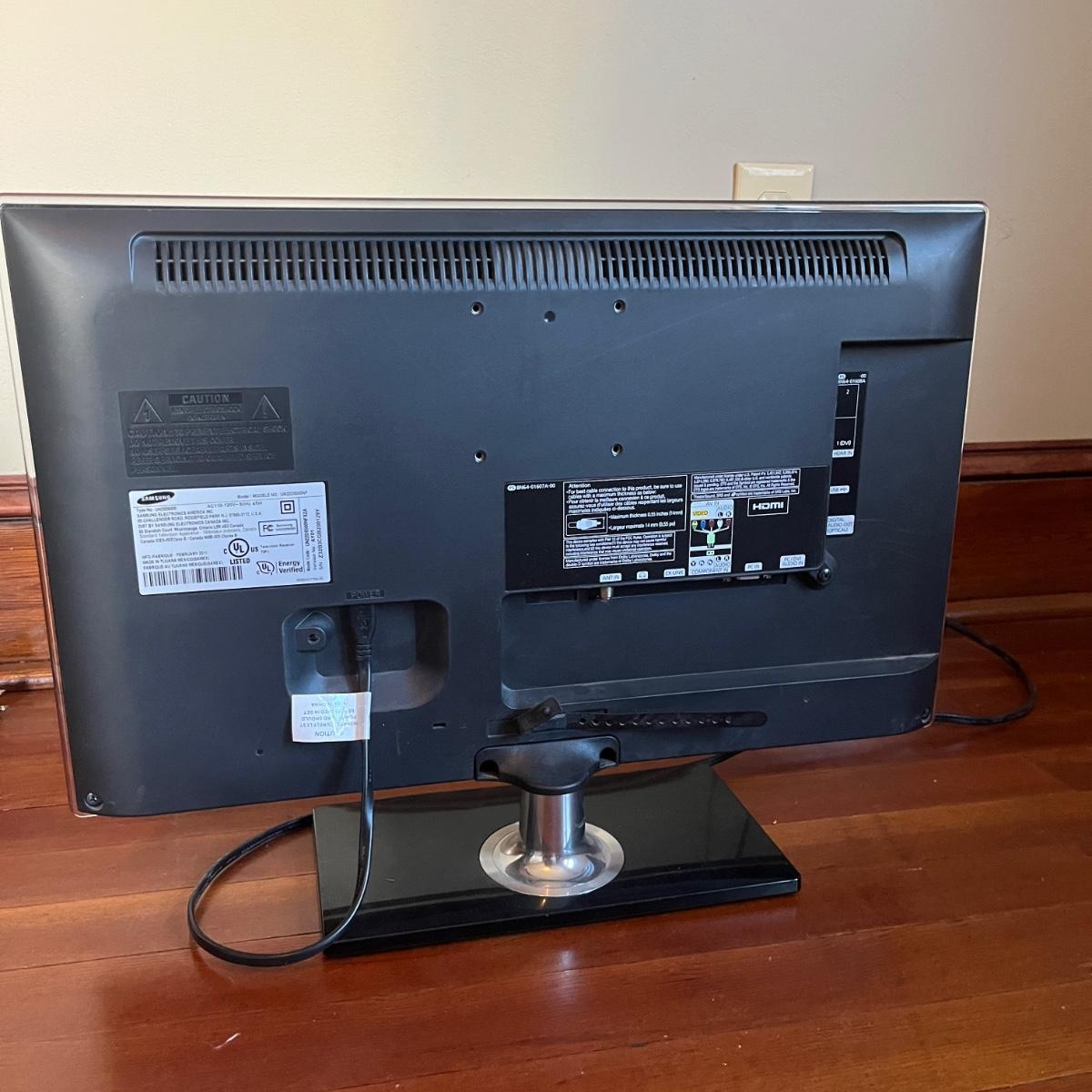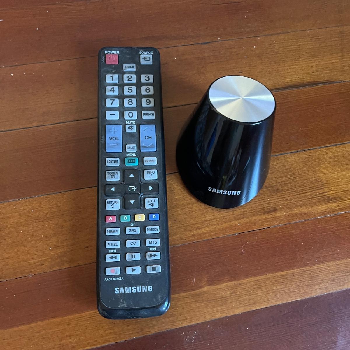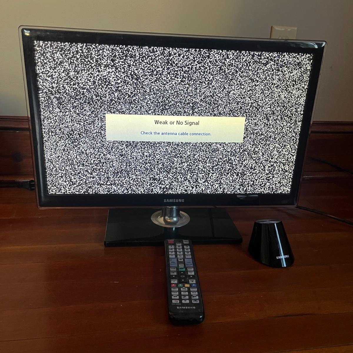 Lot includes a Samsung 22” TV with remote and a Samsung Infrared blaster. The blaster takes four AA batteries. The blaster was not tested. TV powered on when plugged in.