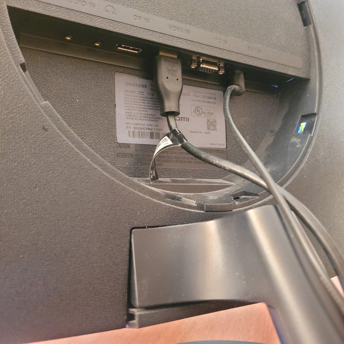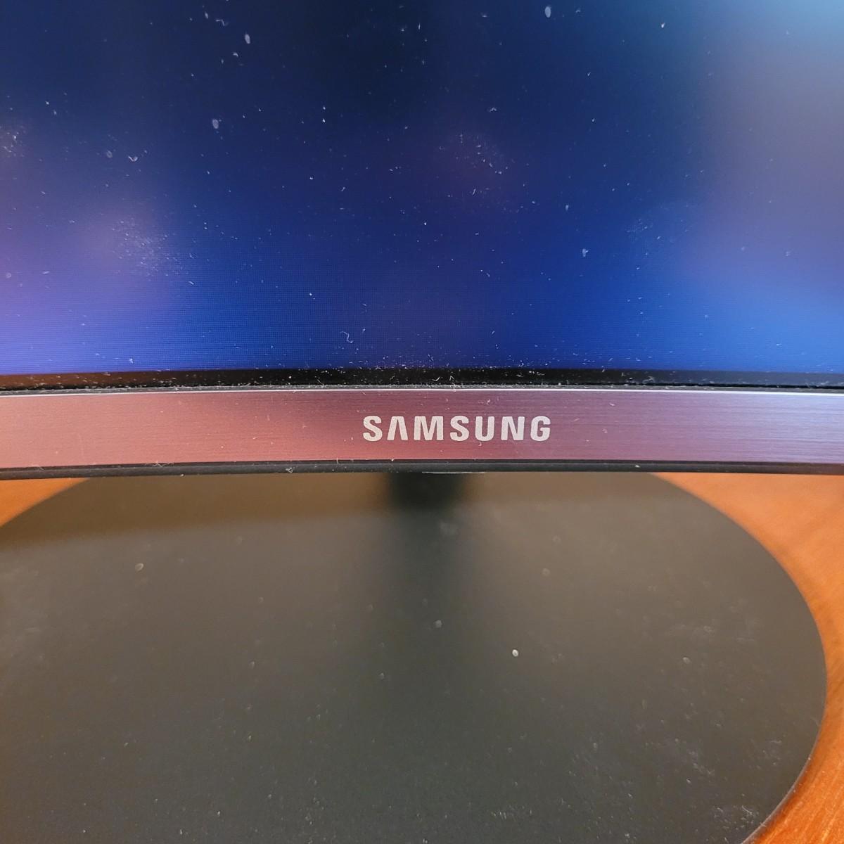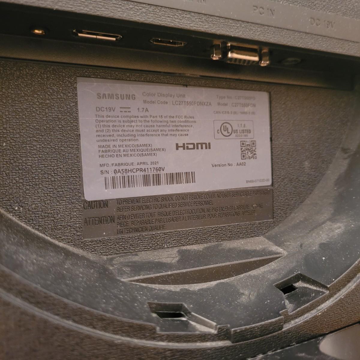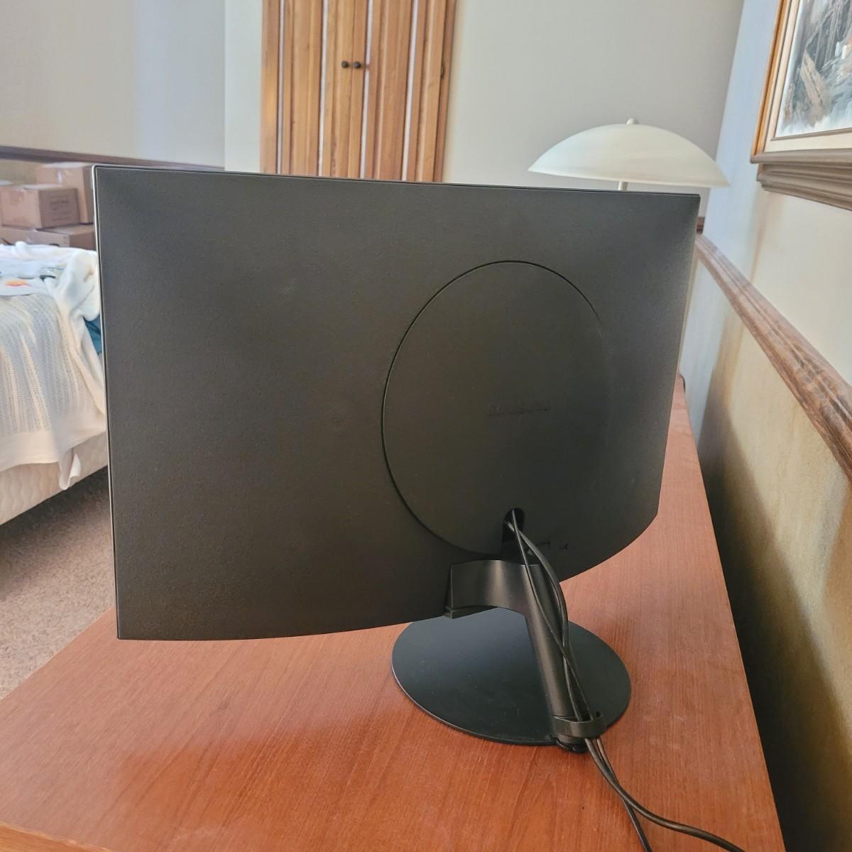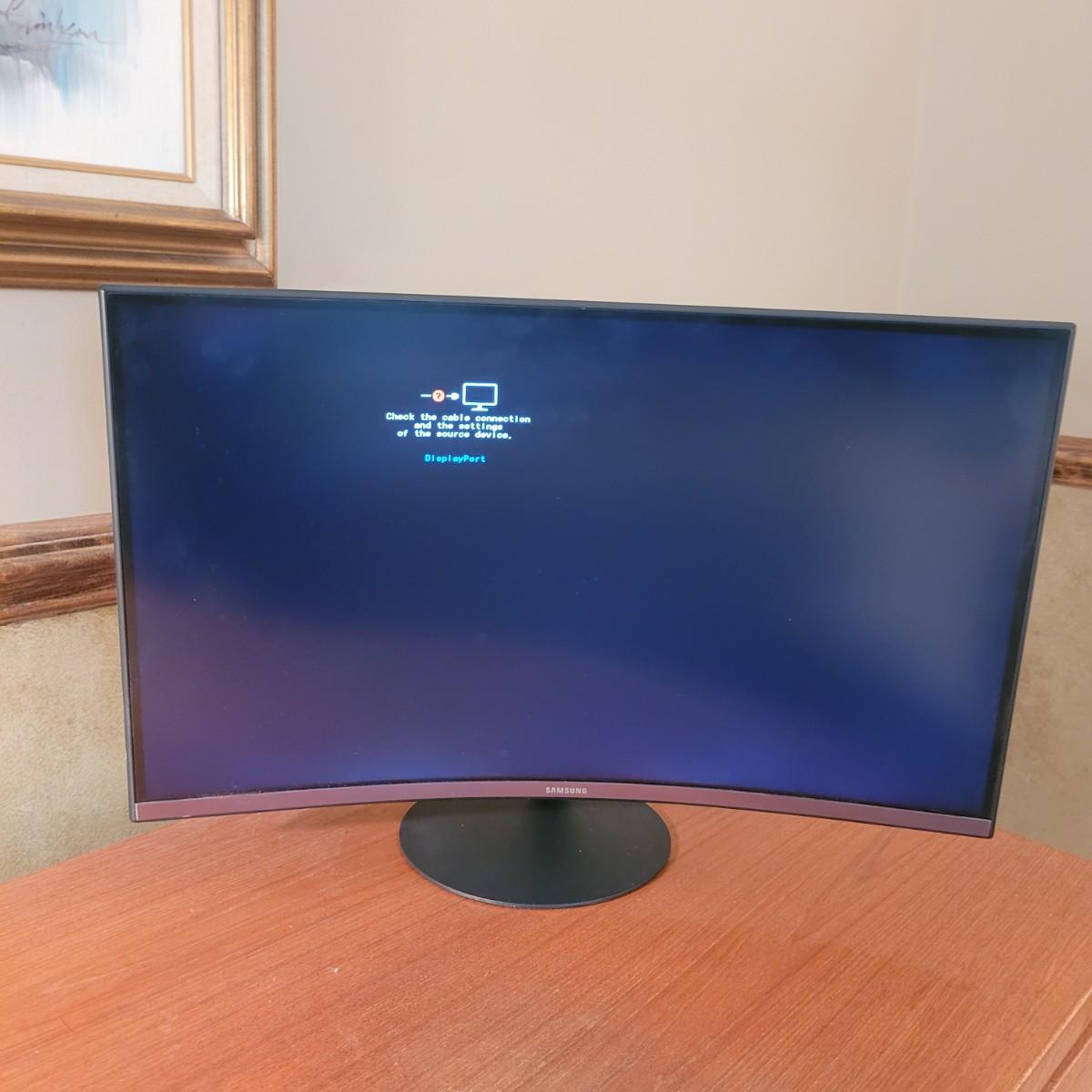This sleek Samsung 27” HDMI monitor has a slim, curved shape that takes up very little space on the desk. Item powered on when plugged in. Shipping available.