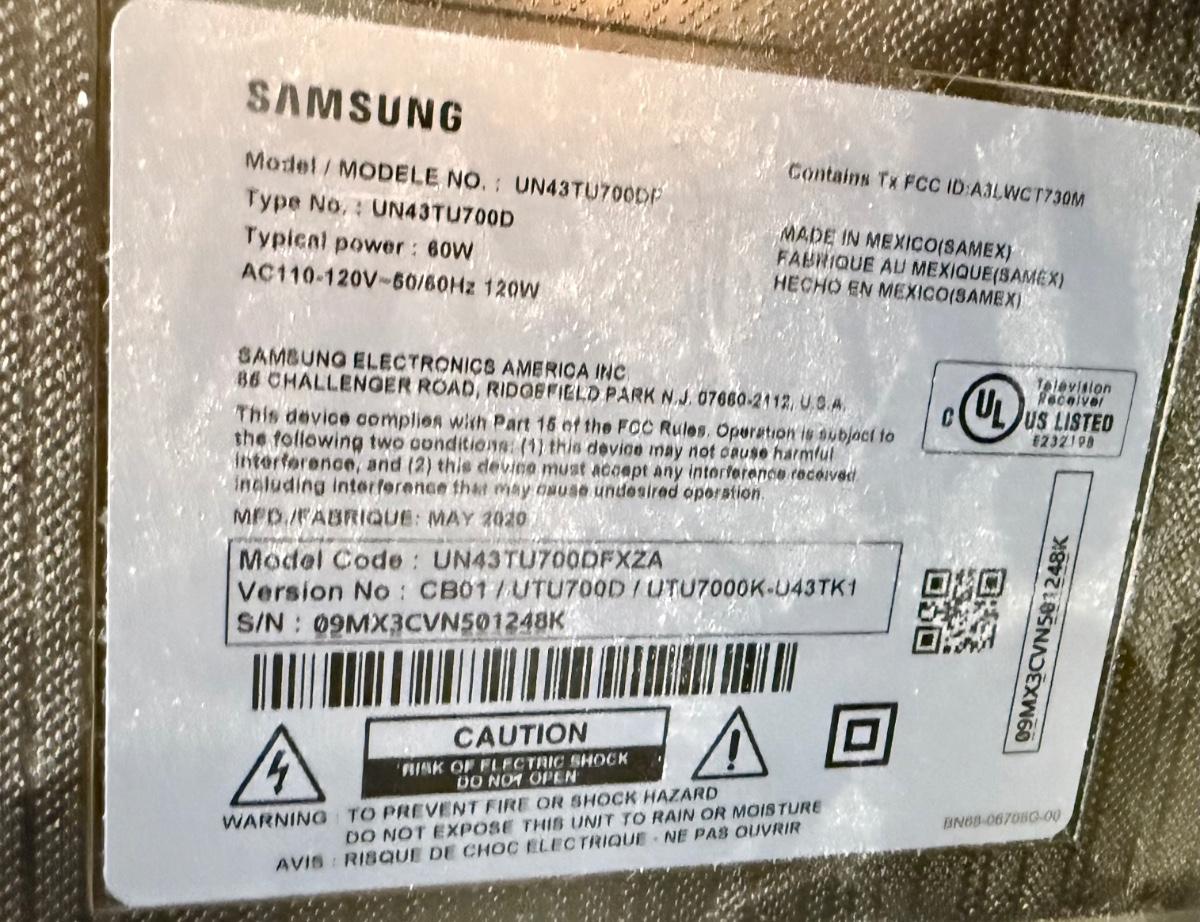 Model UN43TU700D, from 2020. Tested, works as expected. Includes 2 remotes.