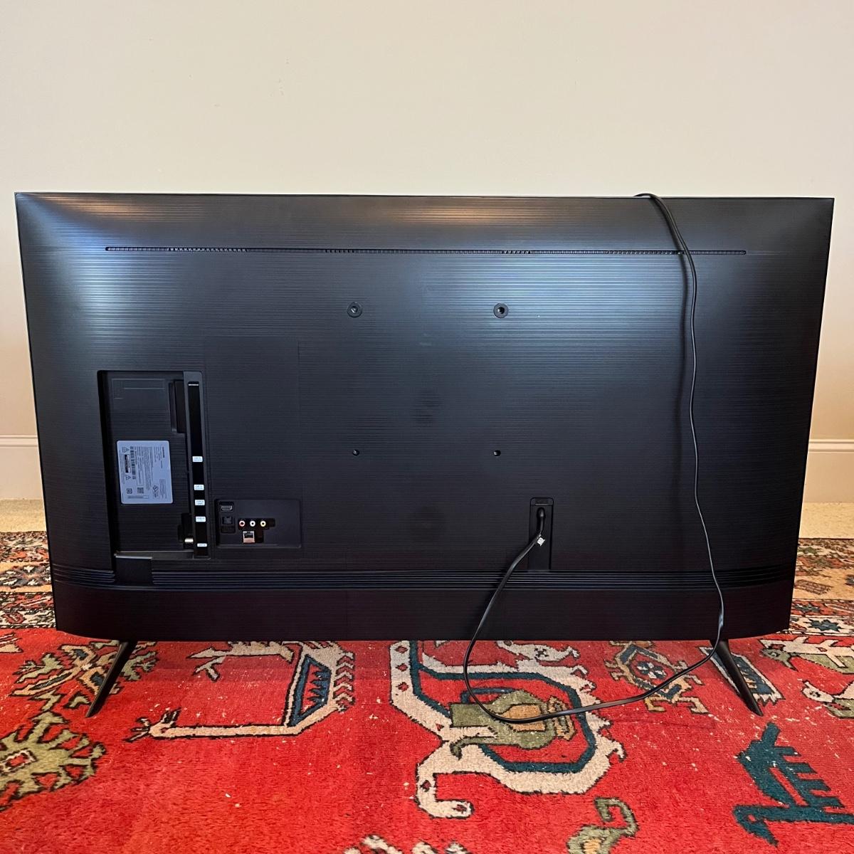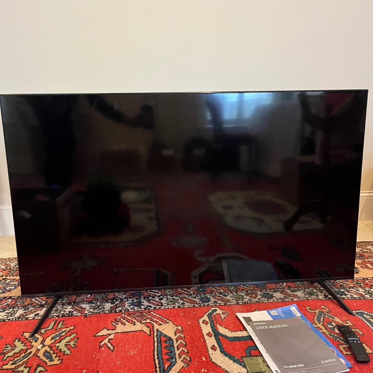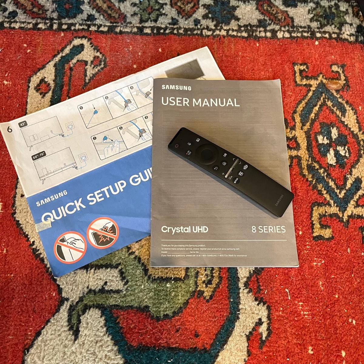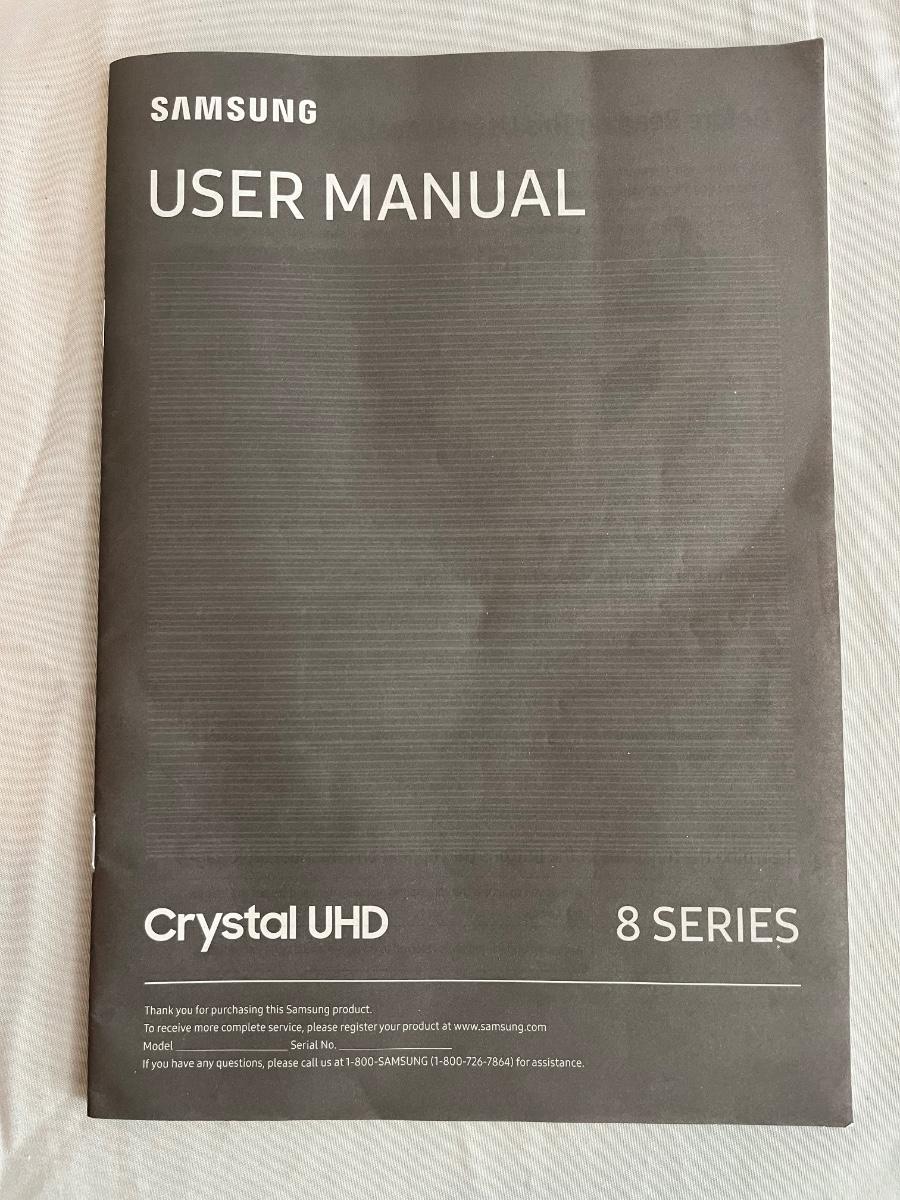 Samsung 50” Crystal UHD smart tv mounted on two stand legs, with owners manual and remote control.