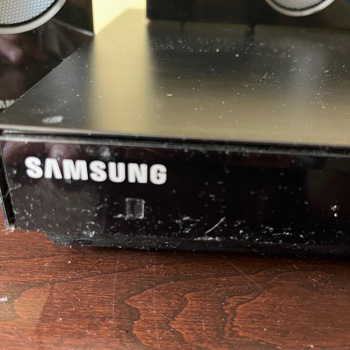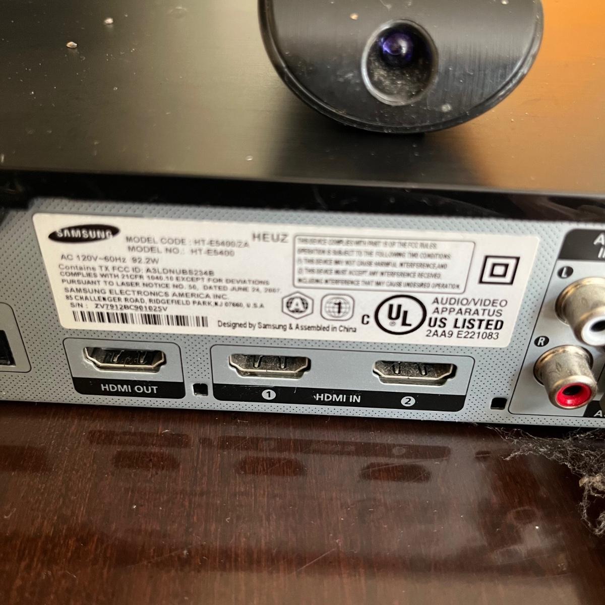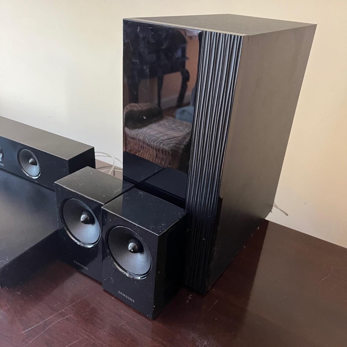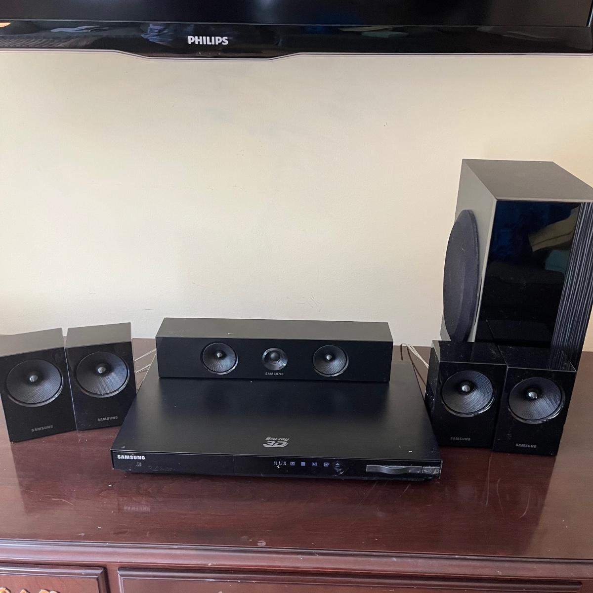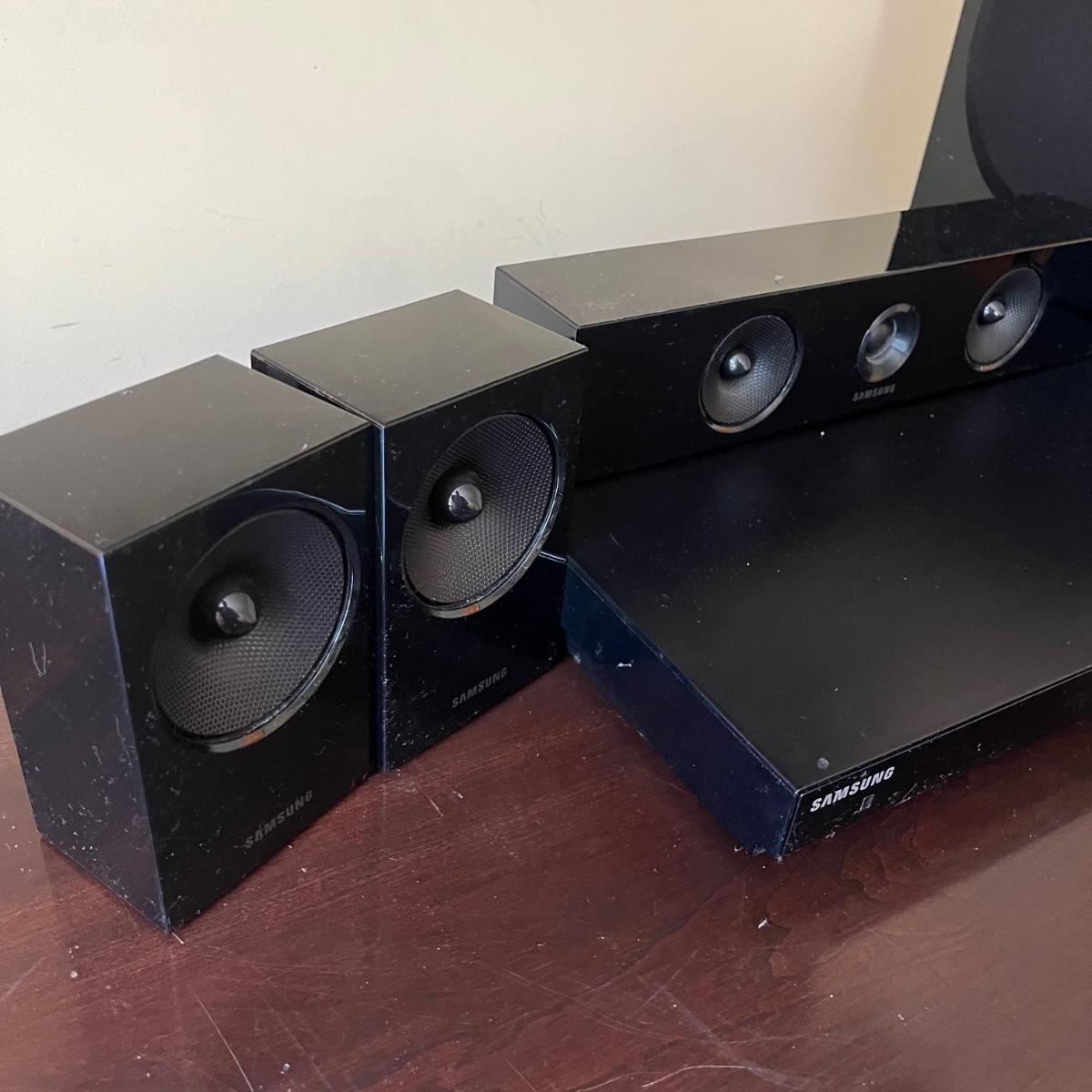 Lot includes a Samsung 5.1 channel Blu Ray home entertainment system model # HT-E5400. System includes center speaker, two front and two rear speakers with subwoofer and built in Blu Ray player and remote. System powered on when tested.