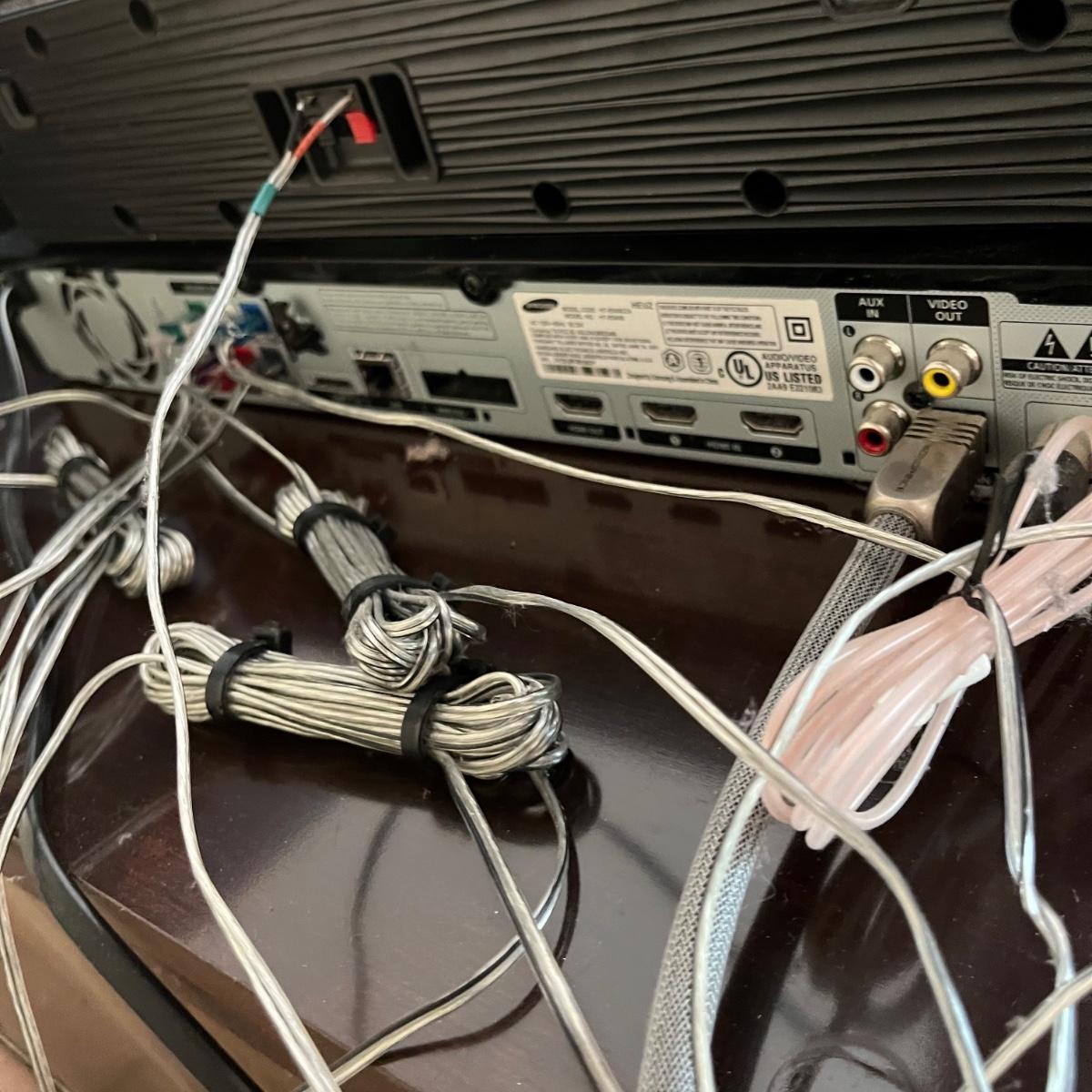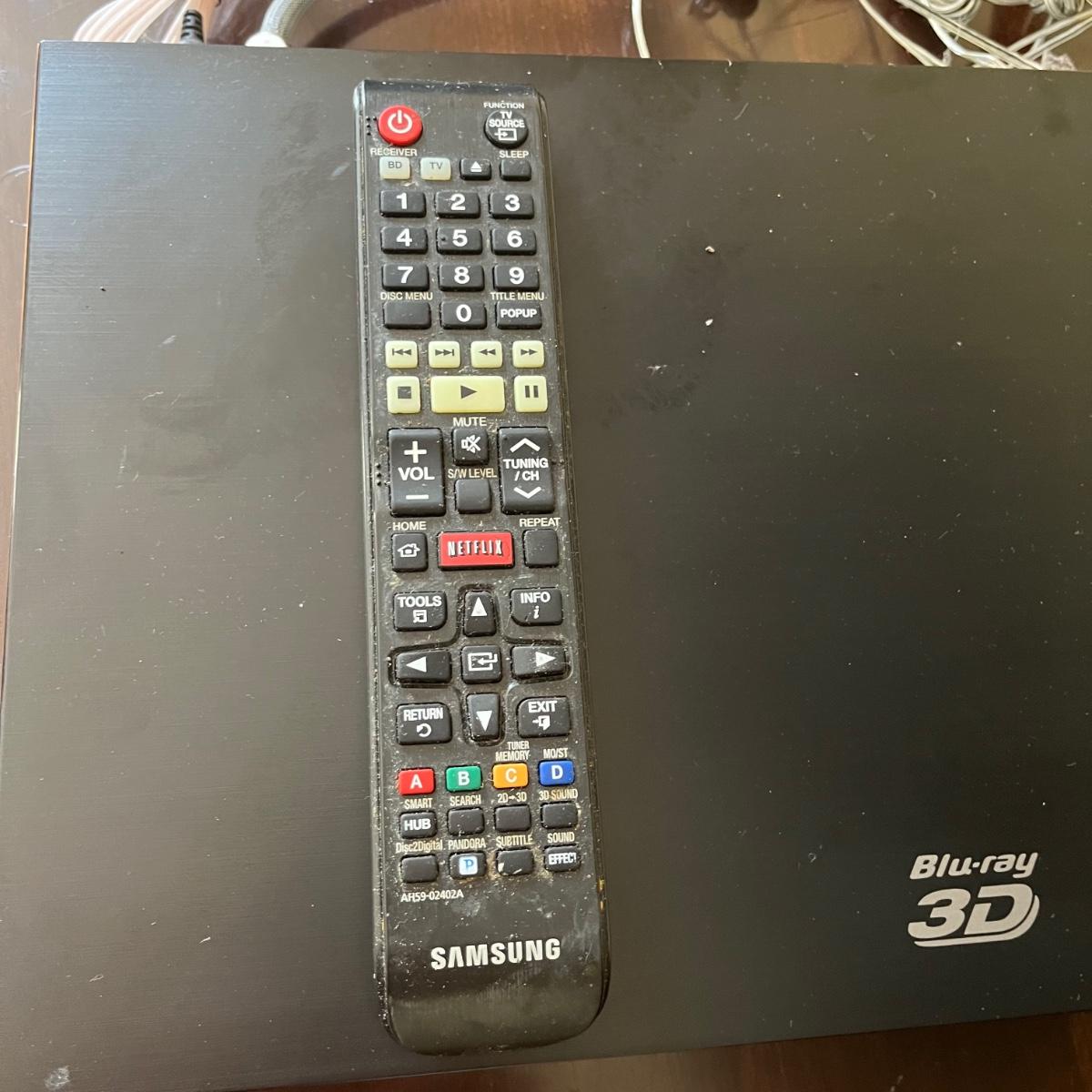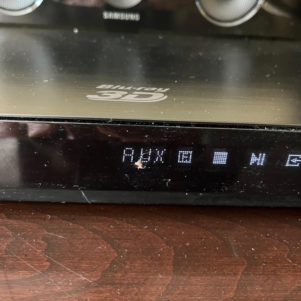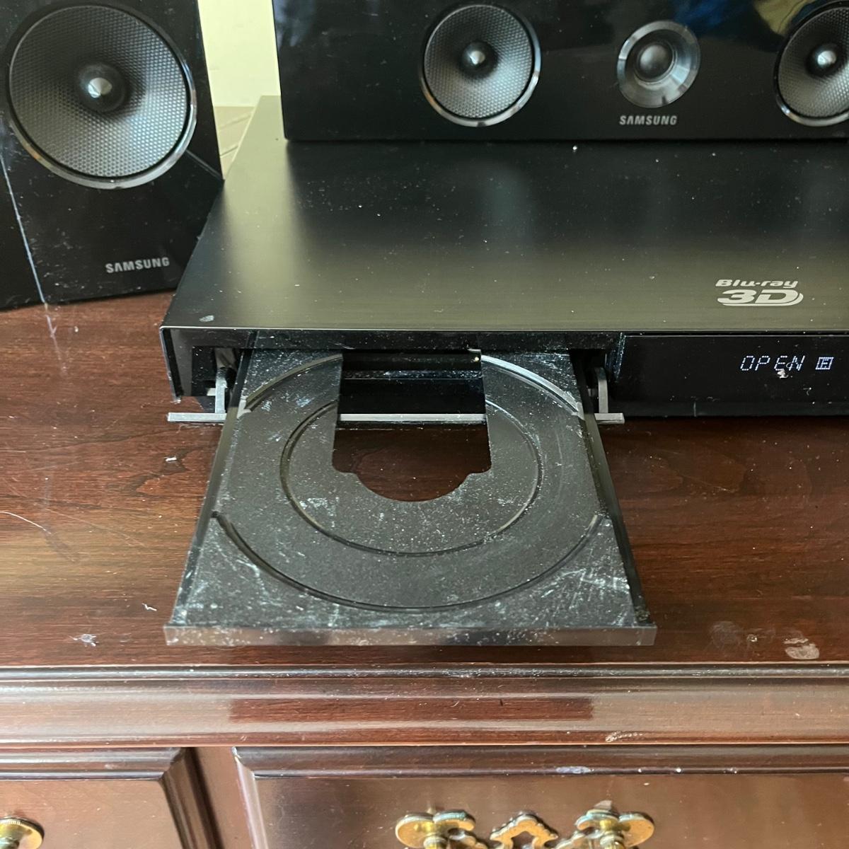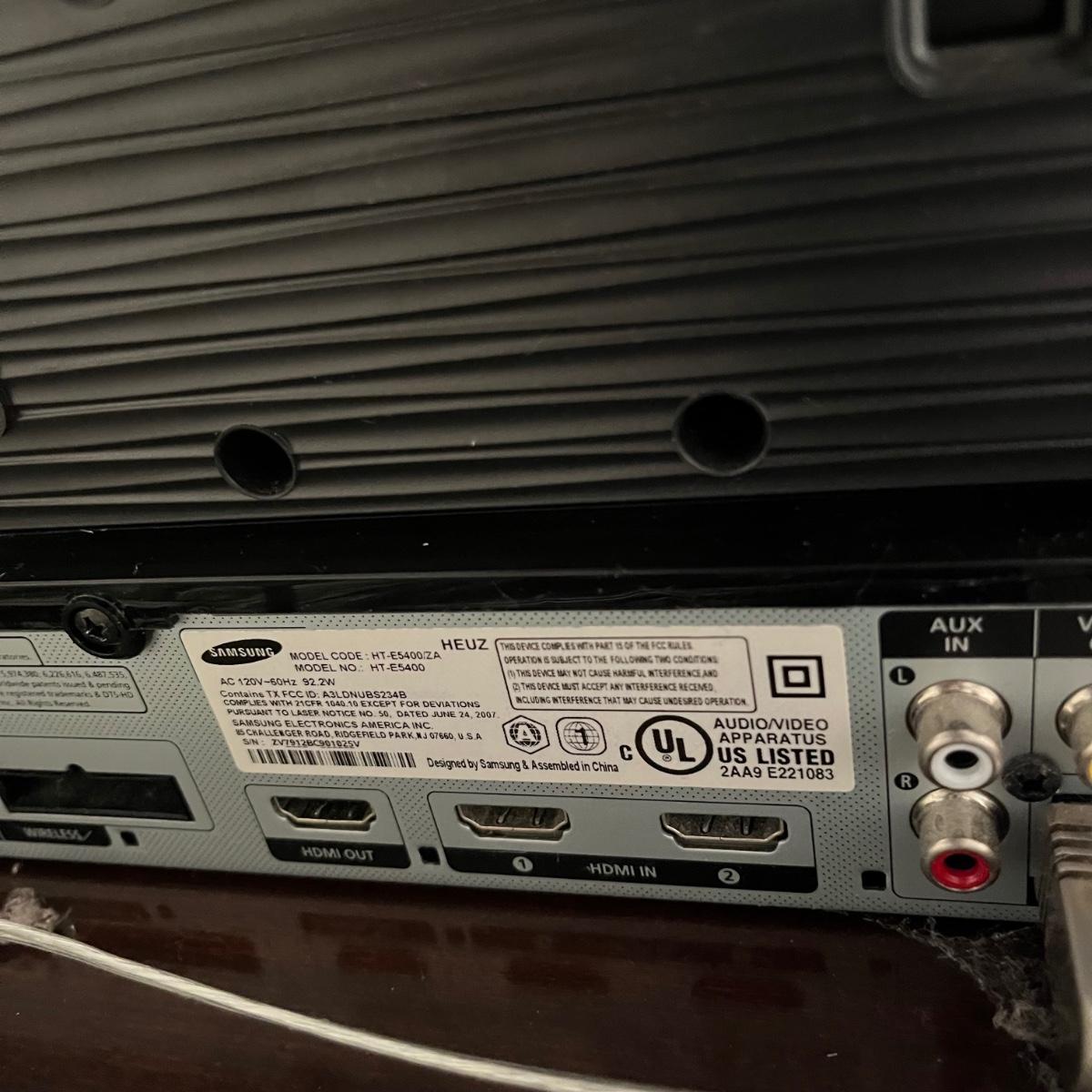 Lot includes a Samsung 5.1 channel Blu Ray home entertainment system model # HT-E5400. System includes center speaker, two front and two rear speakers with subwoofer and built in Blu Ray player and remote. System powered on when tested.
