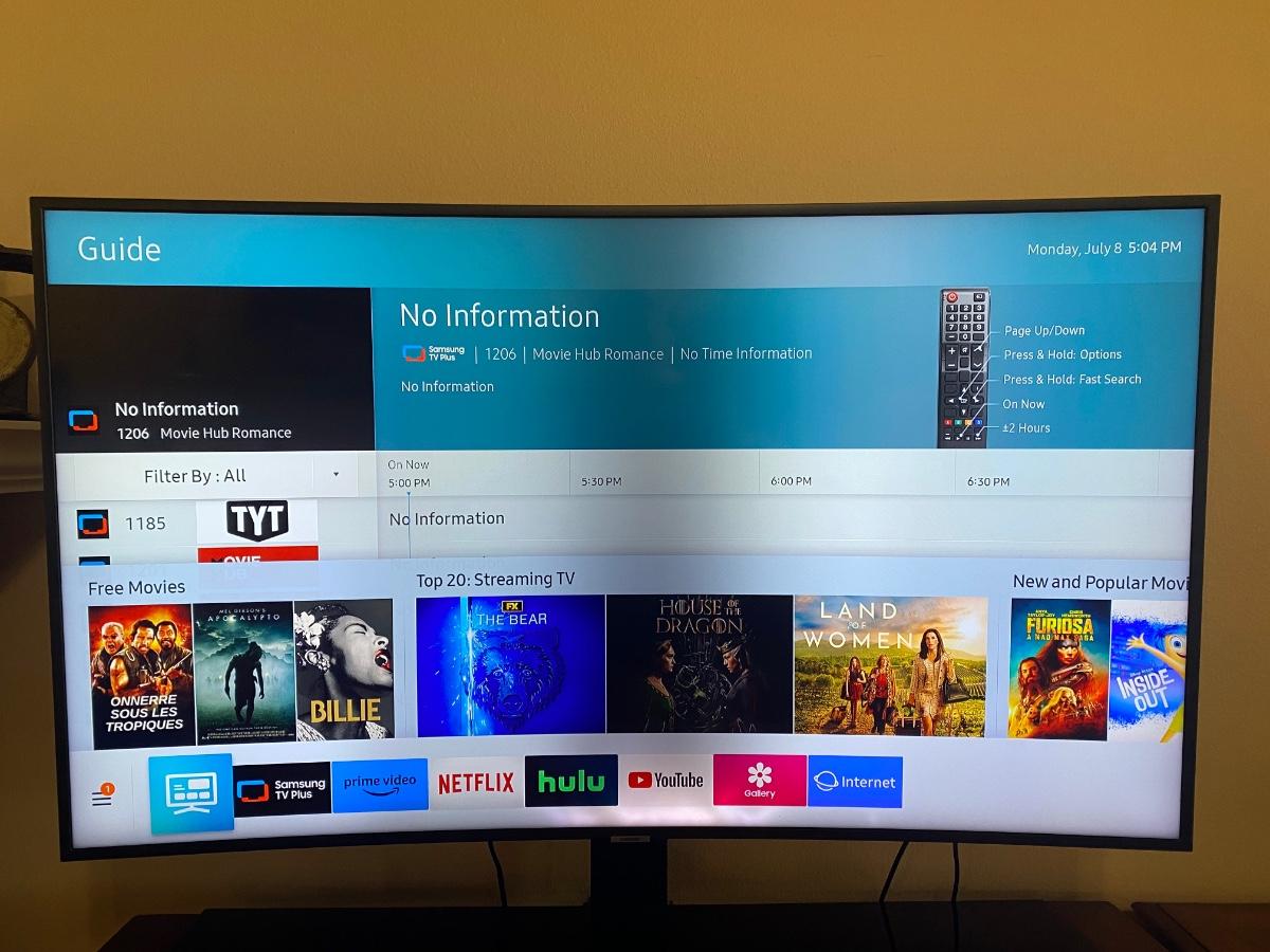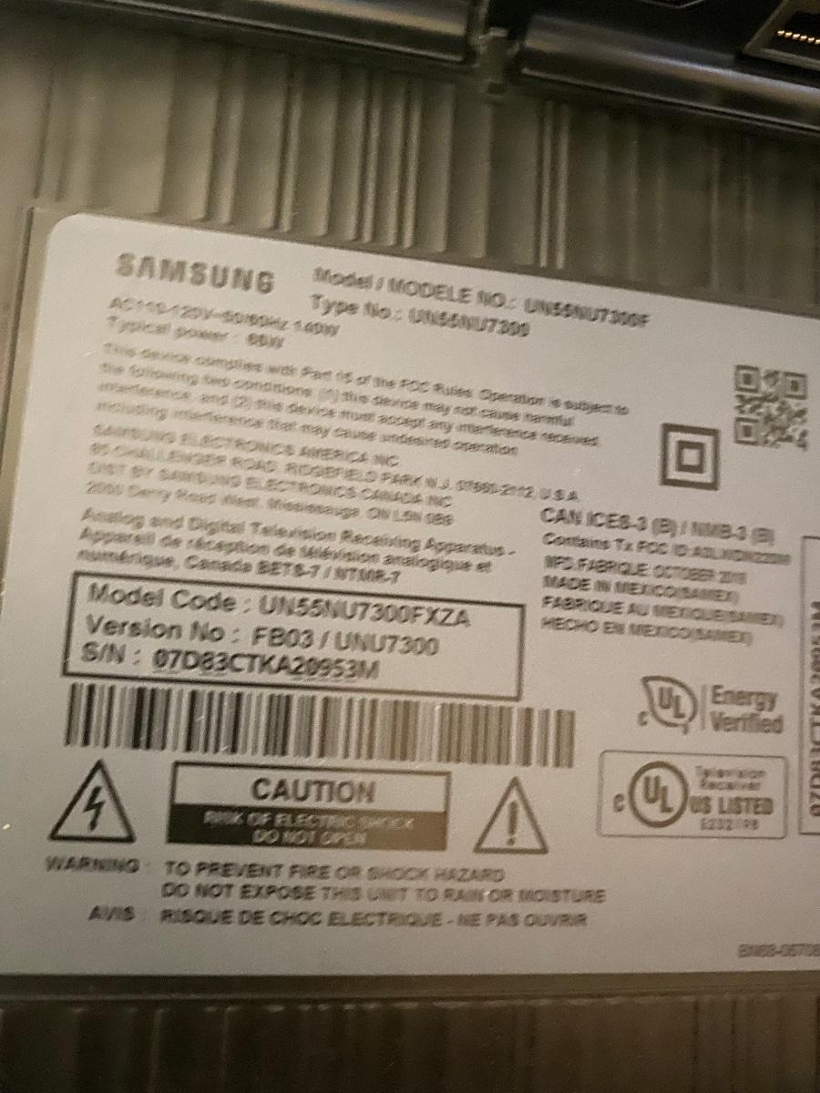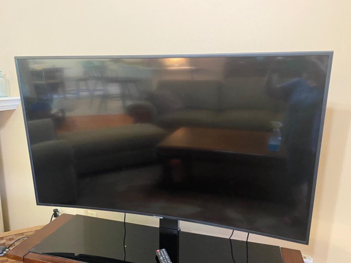 Samsung 55” curved screen smart tv w/remote & manual. Model #UN55NU7300FXZA. Screen has a few scratches but works great. 48w x 28h