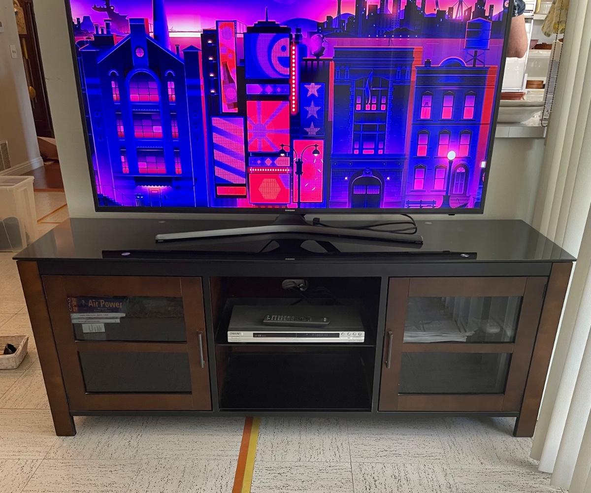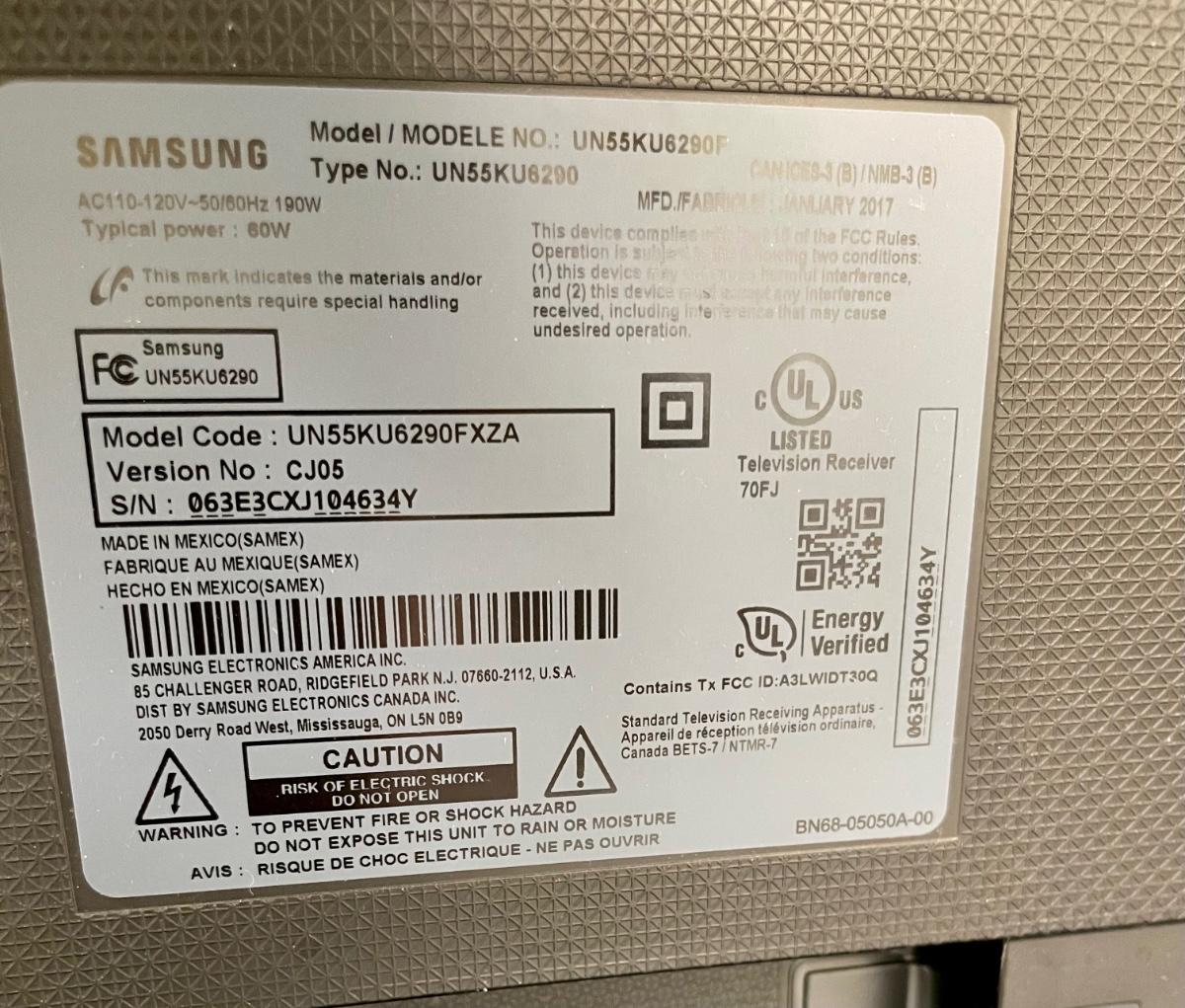Samsung 55” Series 6 model UN55KU6290FXZA 4K HDR Flatscreen. Made in 2017. Tested, works well. Has original remote.