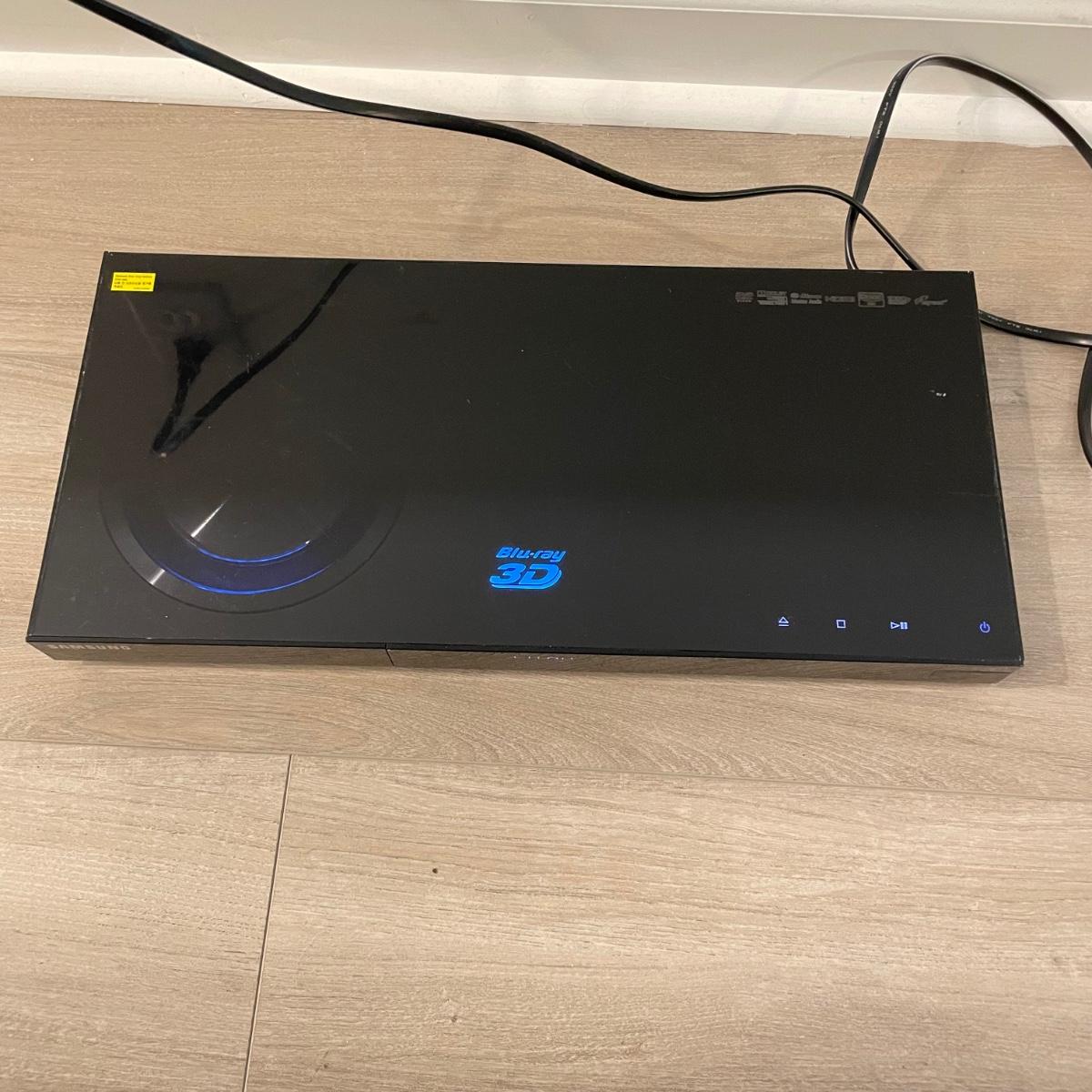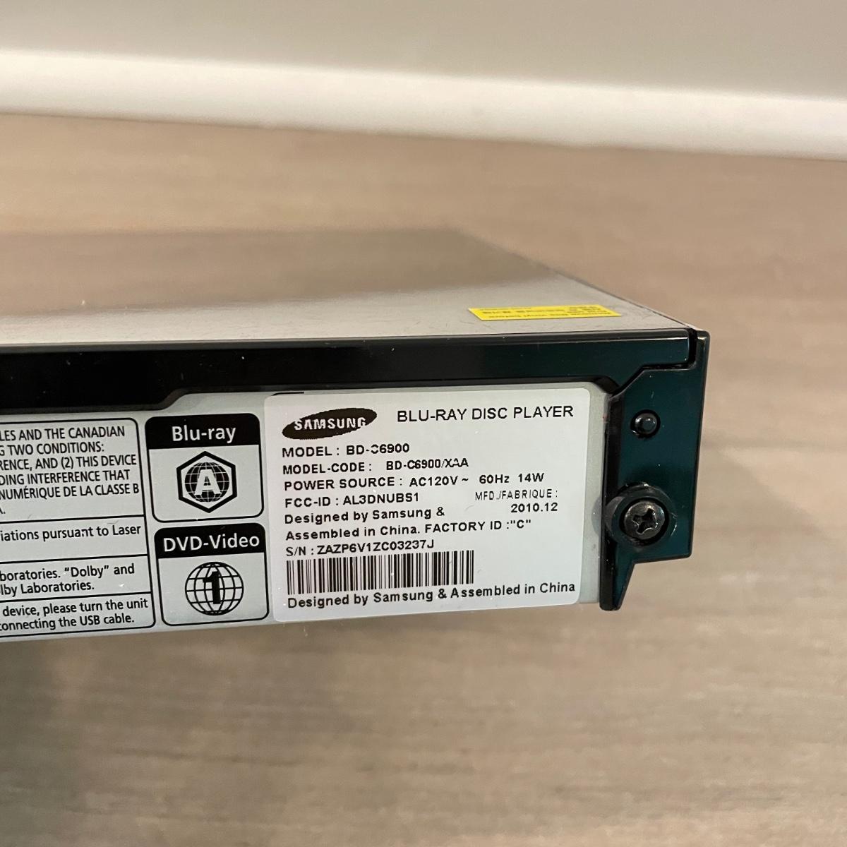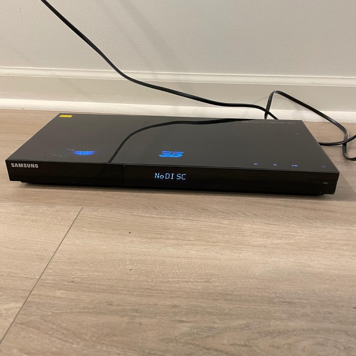 Samsung model BD-6900 Blu-ray Disc player. Player turned on when plugged in, remote opened the track when tested. See images. Piece measures 17” x 8” x 1.75”H. There are some minor scratches on the surface. Local pick up only.
