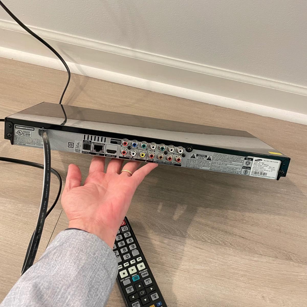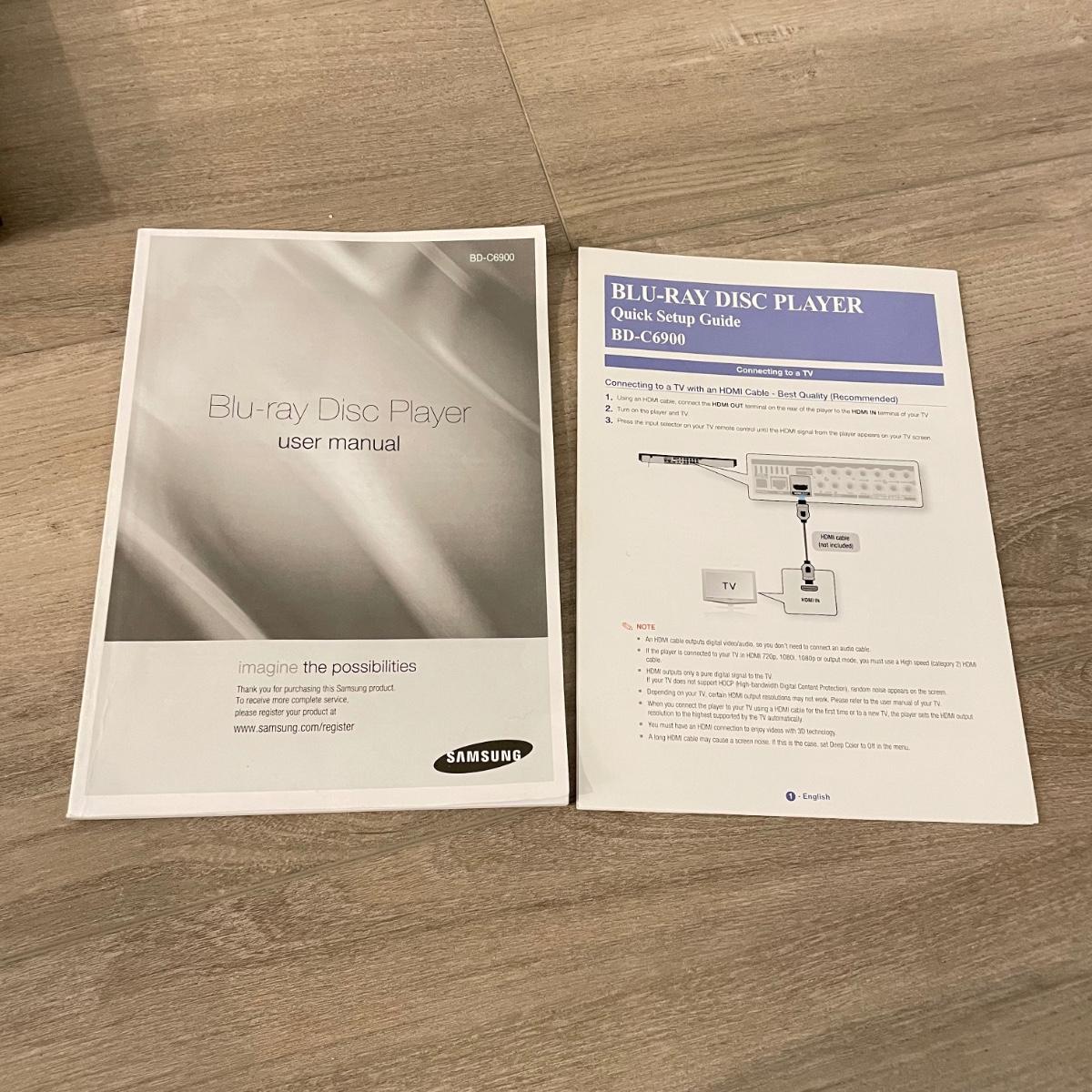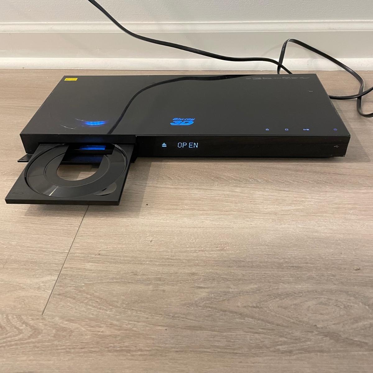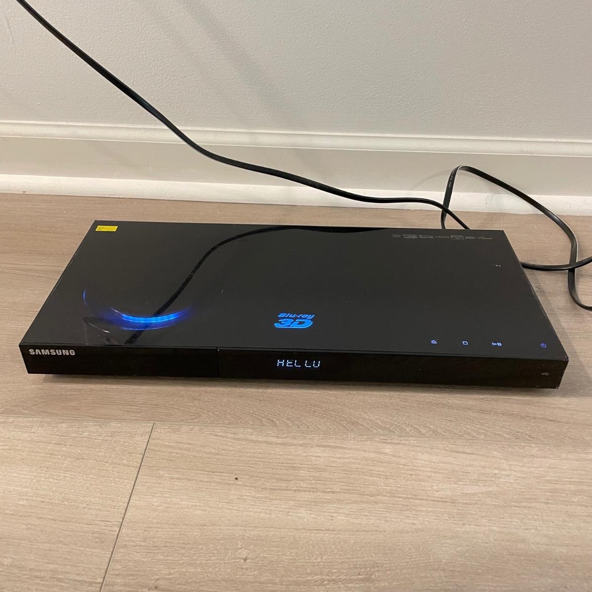Samsung model BD-6900 Blu-ray Disc player. Player turned on when plugged in, remote opened the track when tested. See images. Piece measures 17” x 8” x 1.75”H. There are some minor scratches on the surface. Local pick up only.
