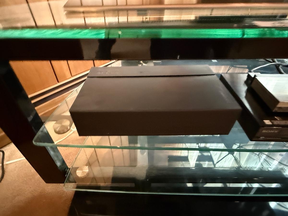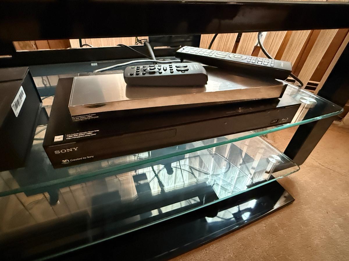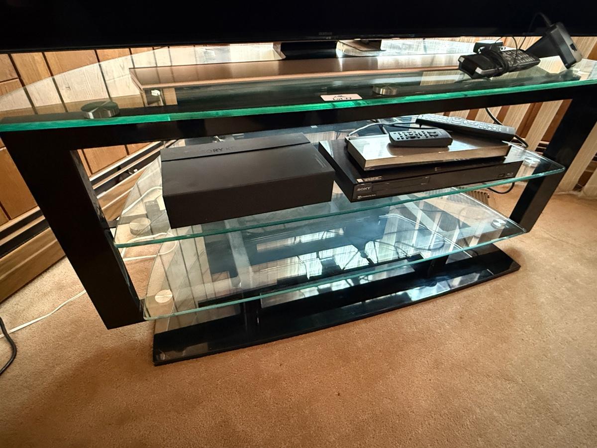 Nice working 4K TV w/Blu-Ray player, Nice Remote with charger stand, black & glass shelf TV Stand as shown and any other boxes/cords on the stand