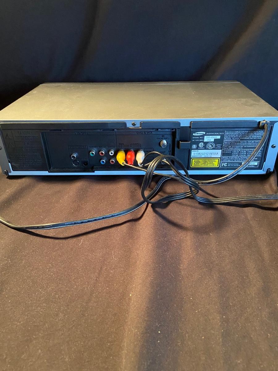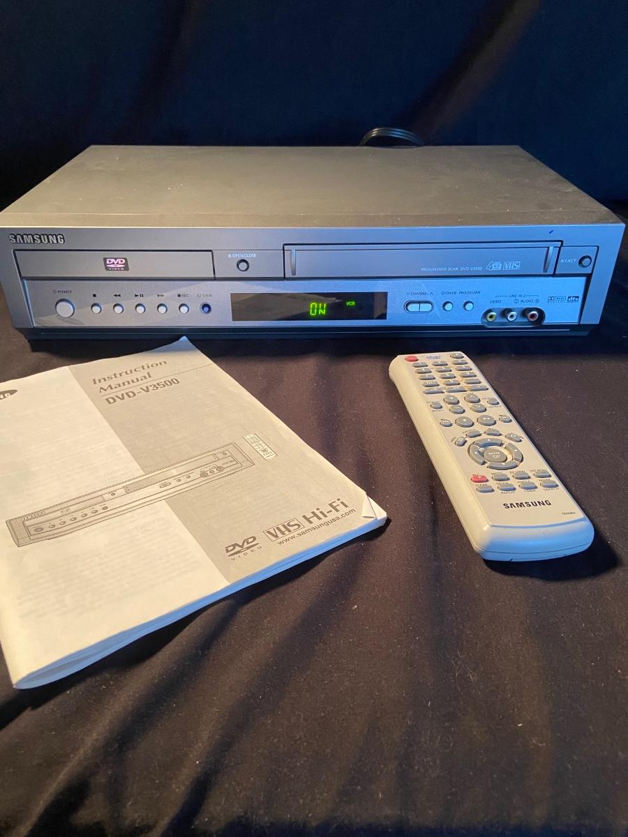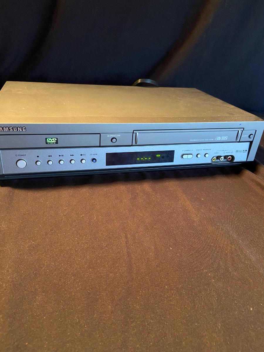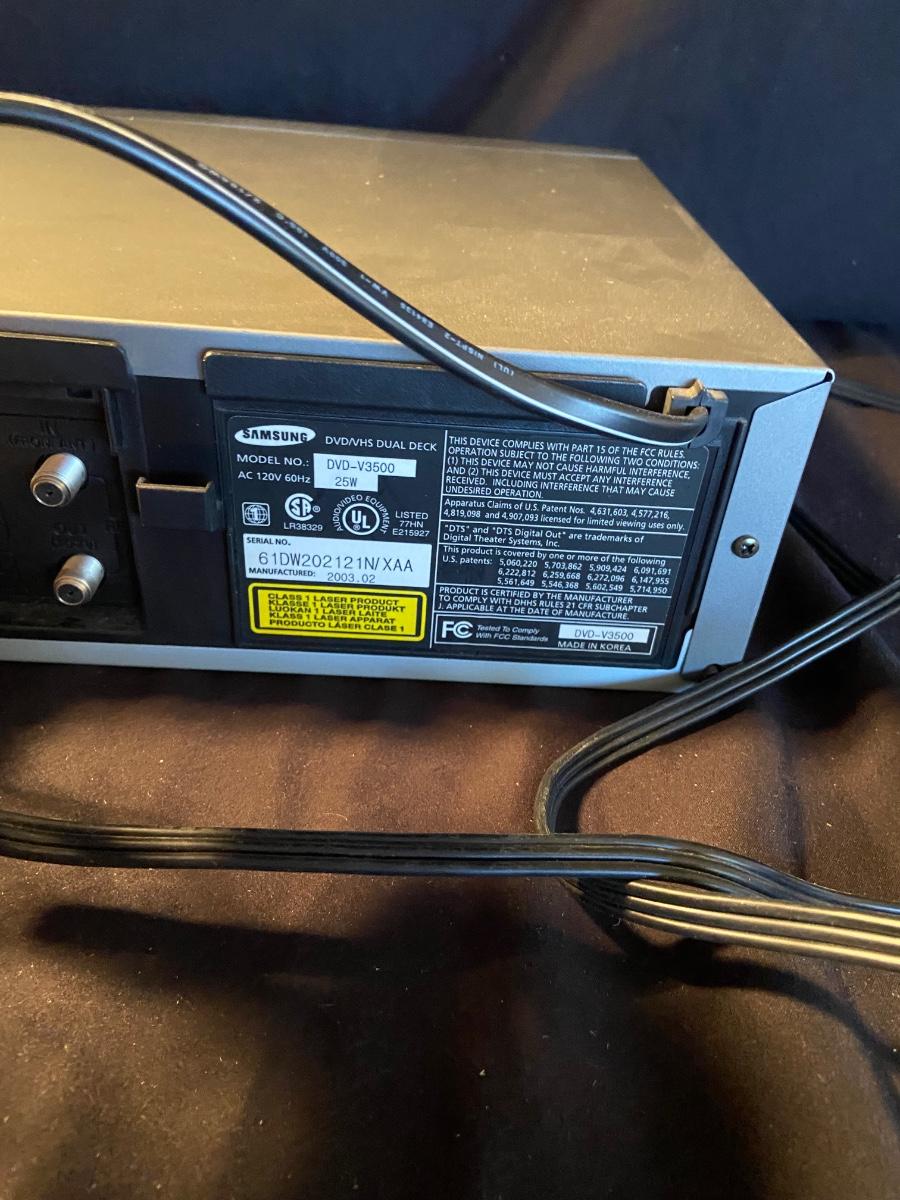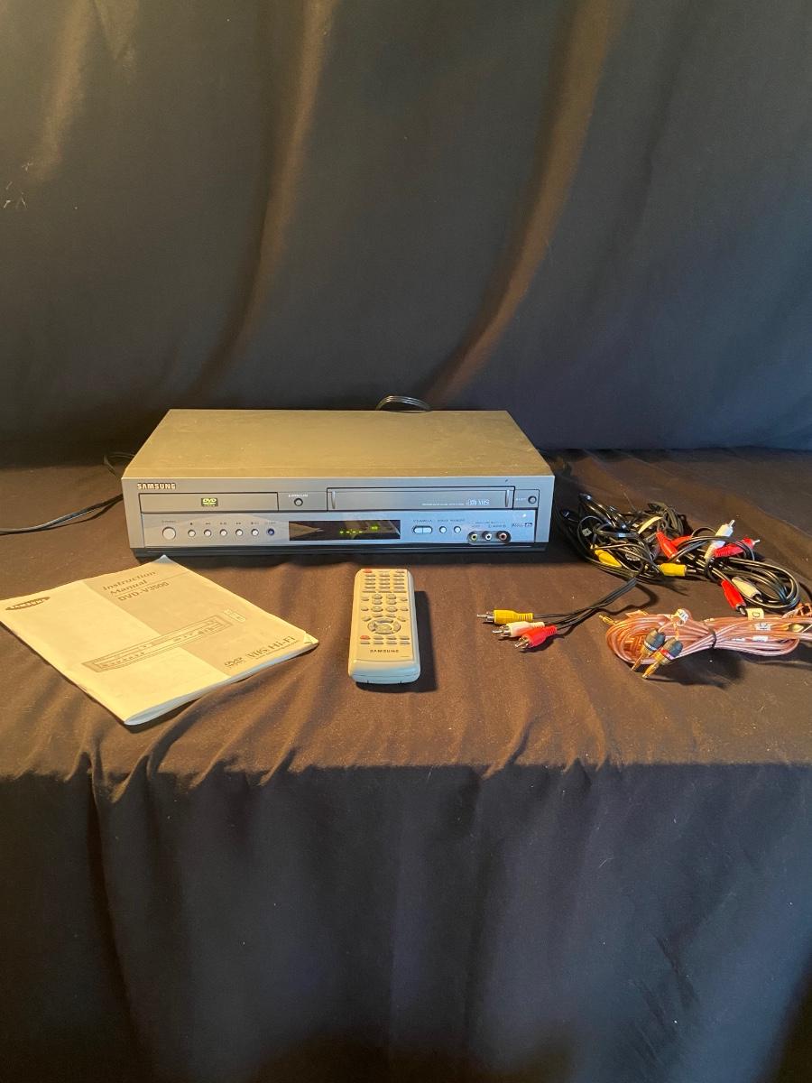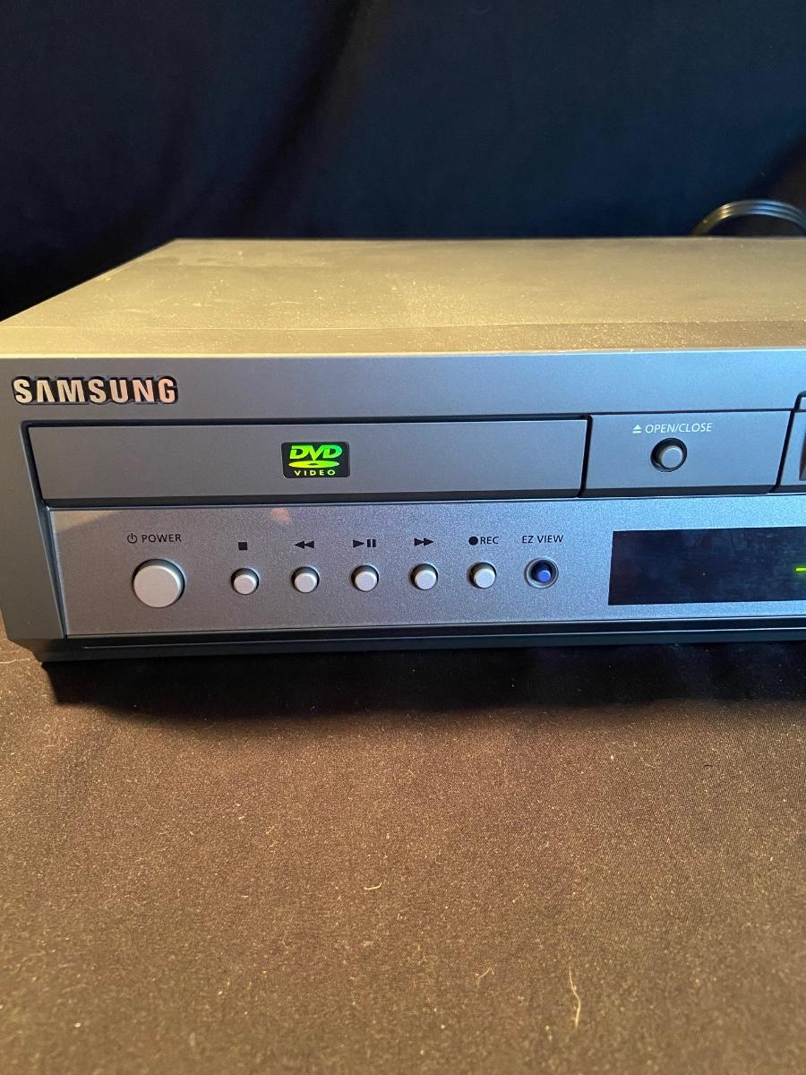 Samsung dual DVD and VHS player. It comes with its remote, instruction manual and various cables to connect to TV and speakers. Powered on when plugged in. It measures 17” x 10.5” x 3.75”H. See pictures for model number. Shipping available.