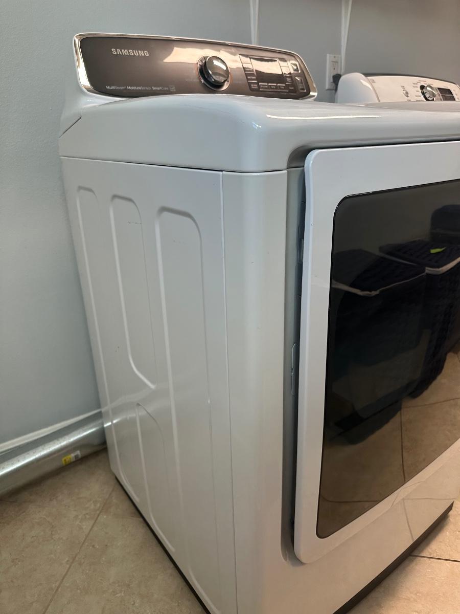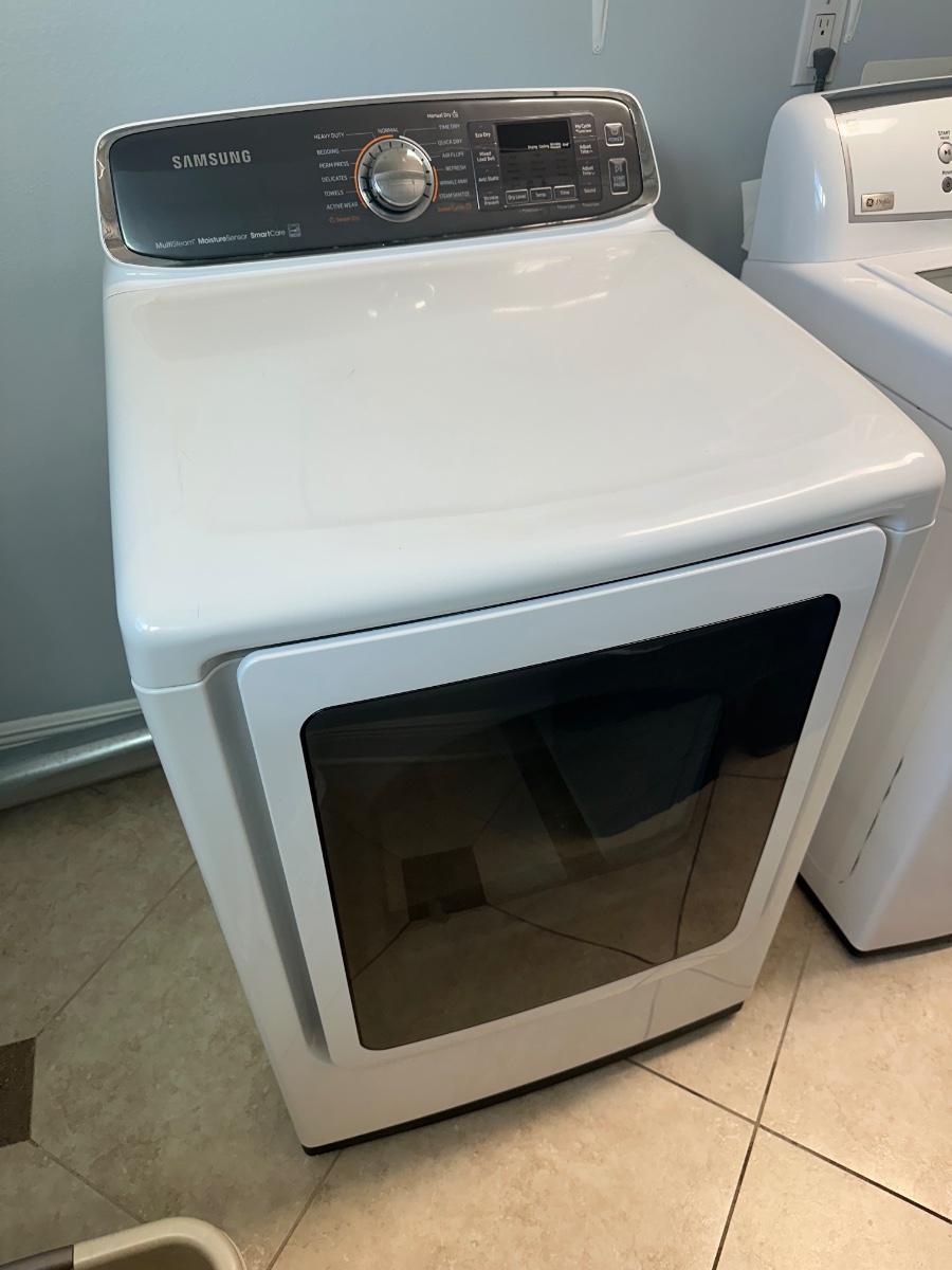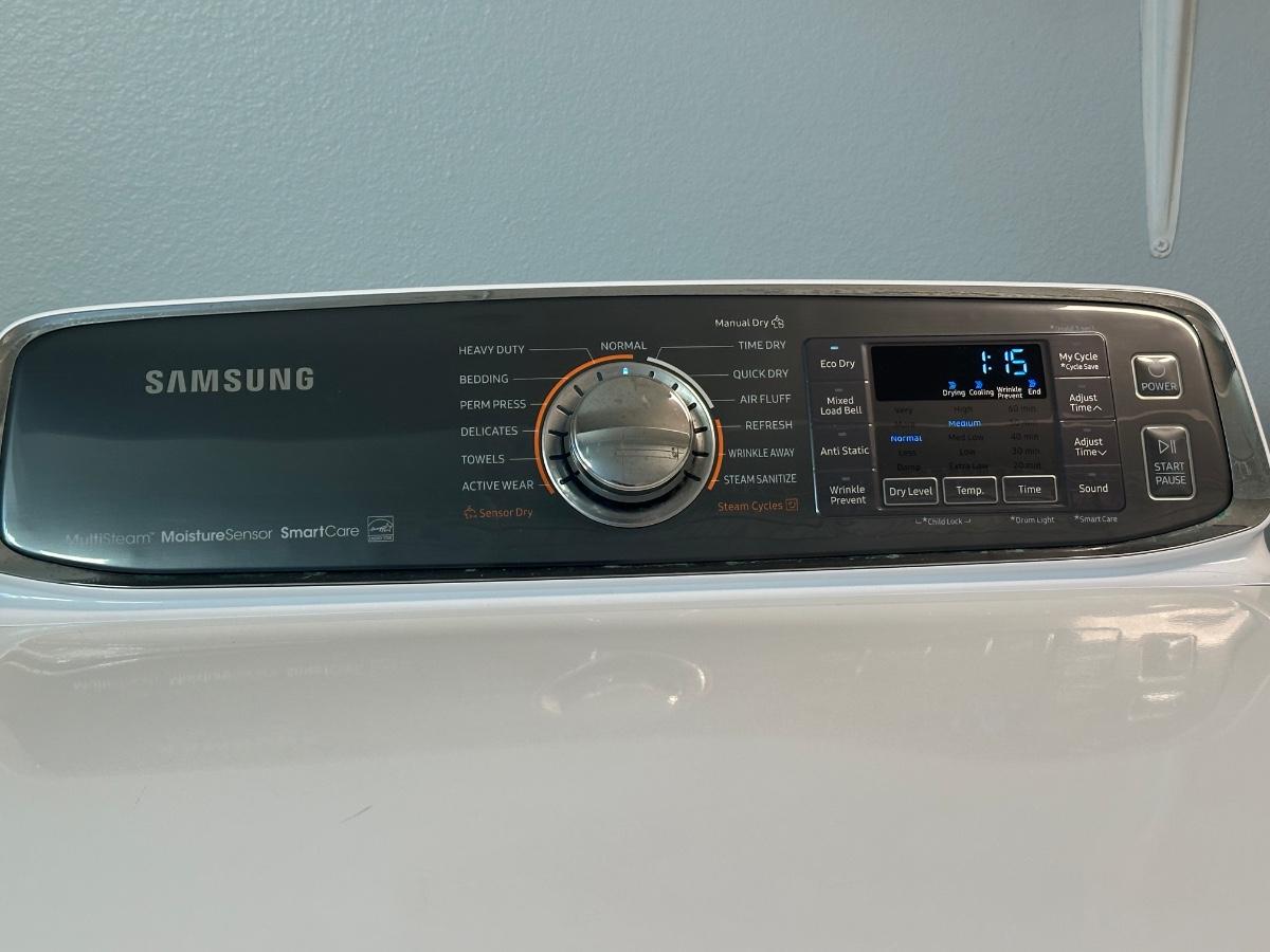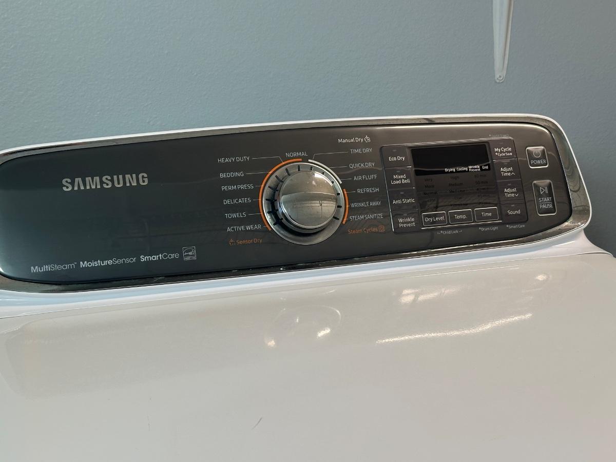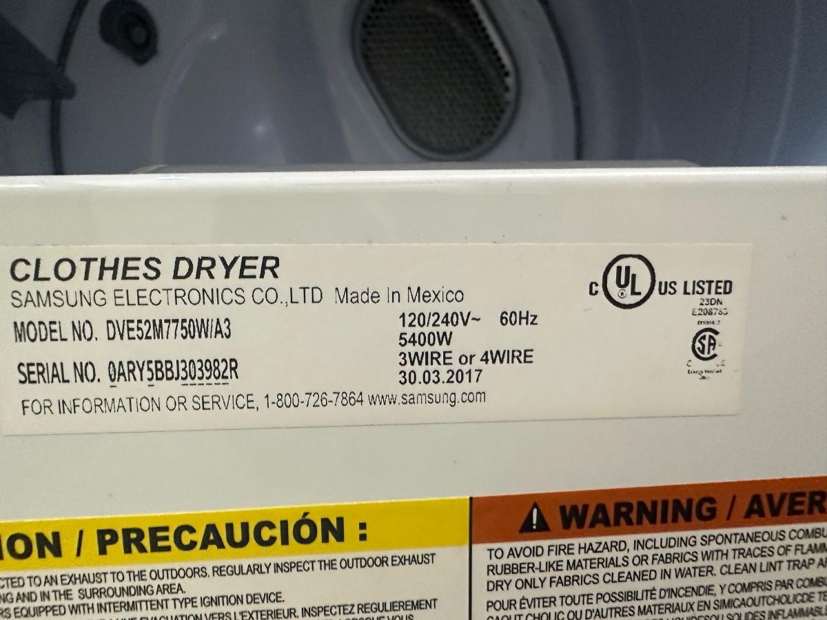 Samsung electric clothes dryer, model DVE52M7750W/A3, manufactured in 2017. Unit has been tested and is working well. Features include moisture sensor drying, steam cycles, and multiple preset programs. Clean condition with minor cosmetic wear from normal use.