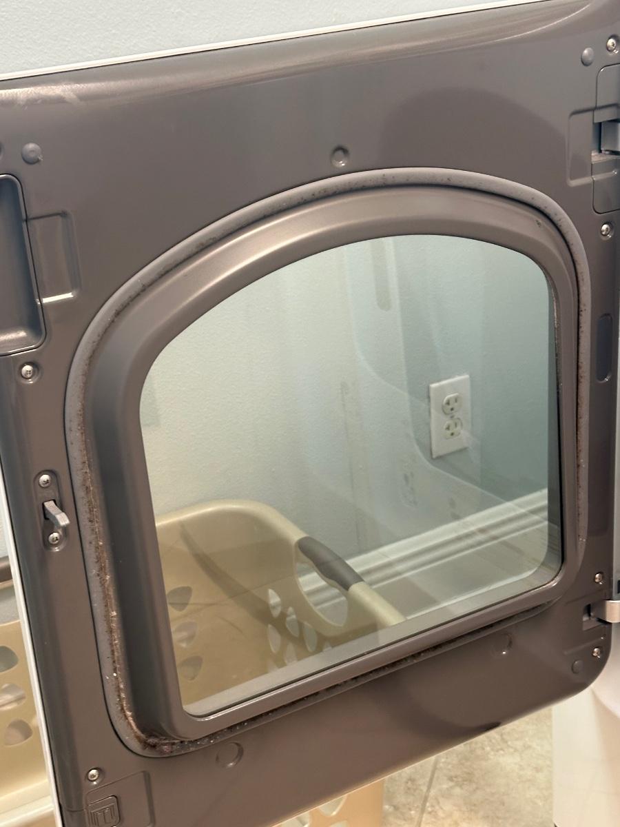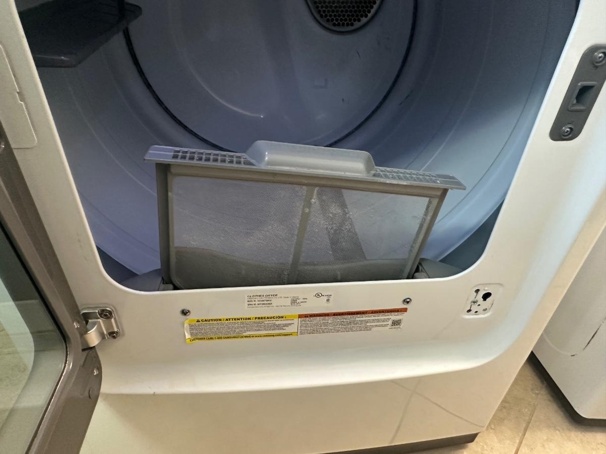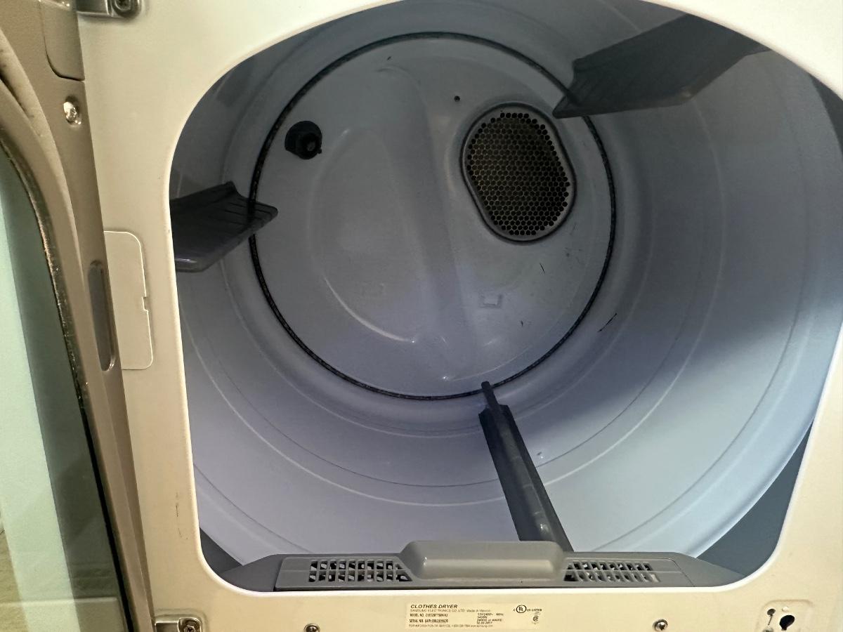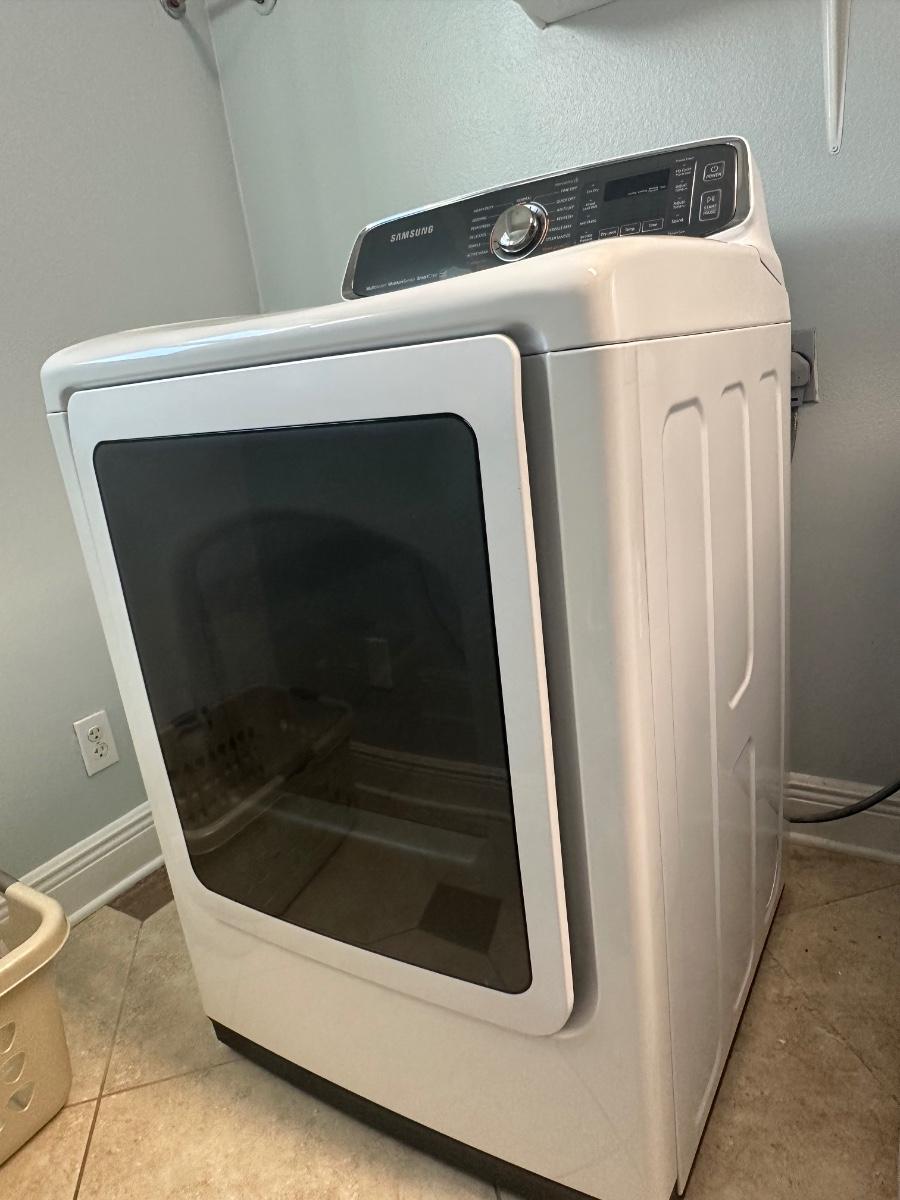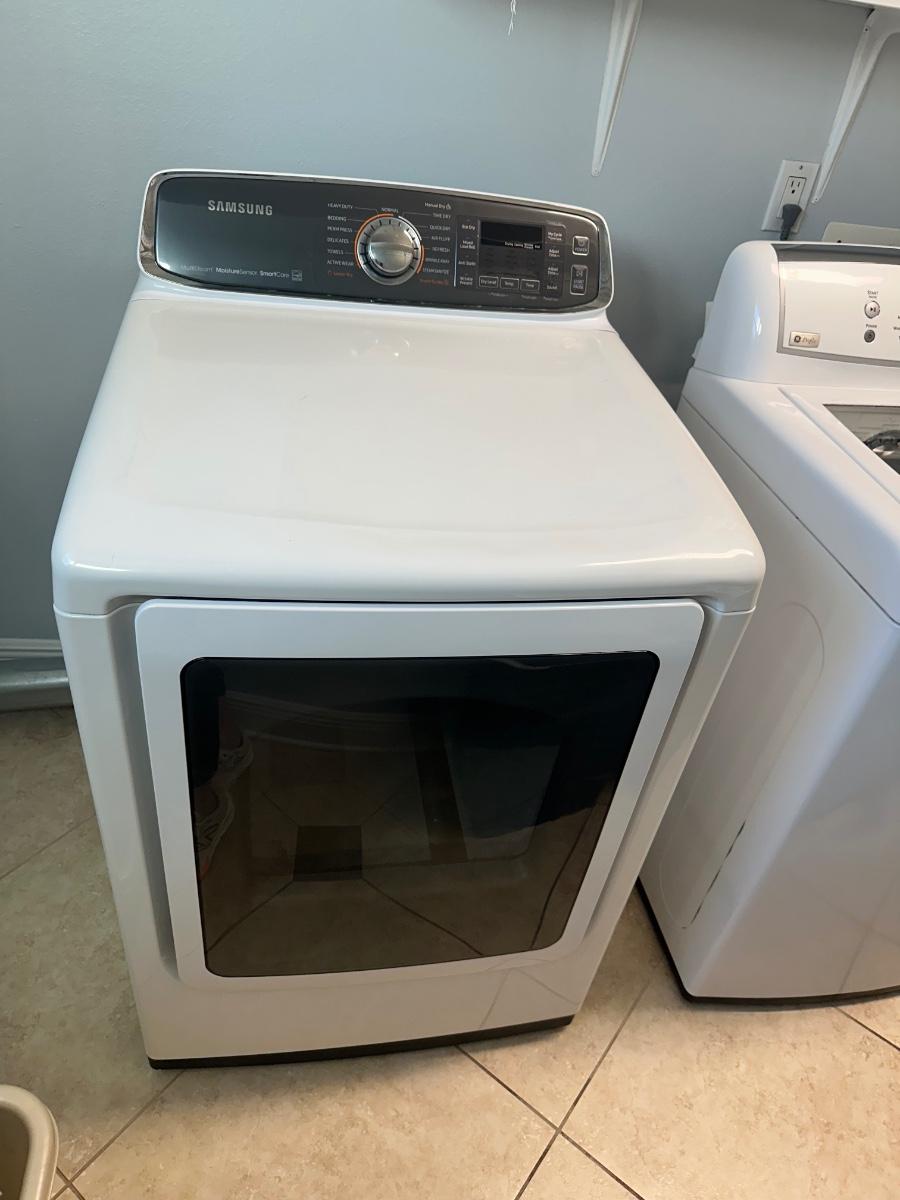 Samsung electric clothes dryer, model DVE52M7750W/A3, manufactured in 2017. Unit has been tested and is working well. Features include moisture sensor drying, steam cycles, and multiple preset programs. Clean condition with minor cosmetic wear from normal use.