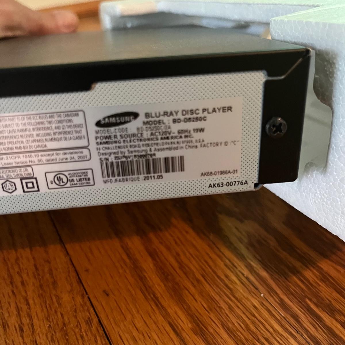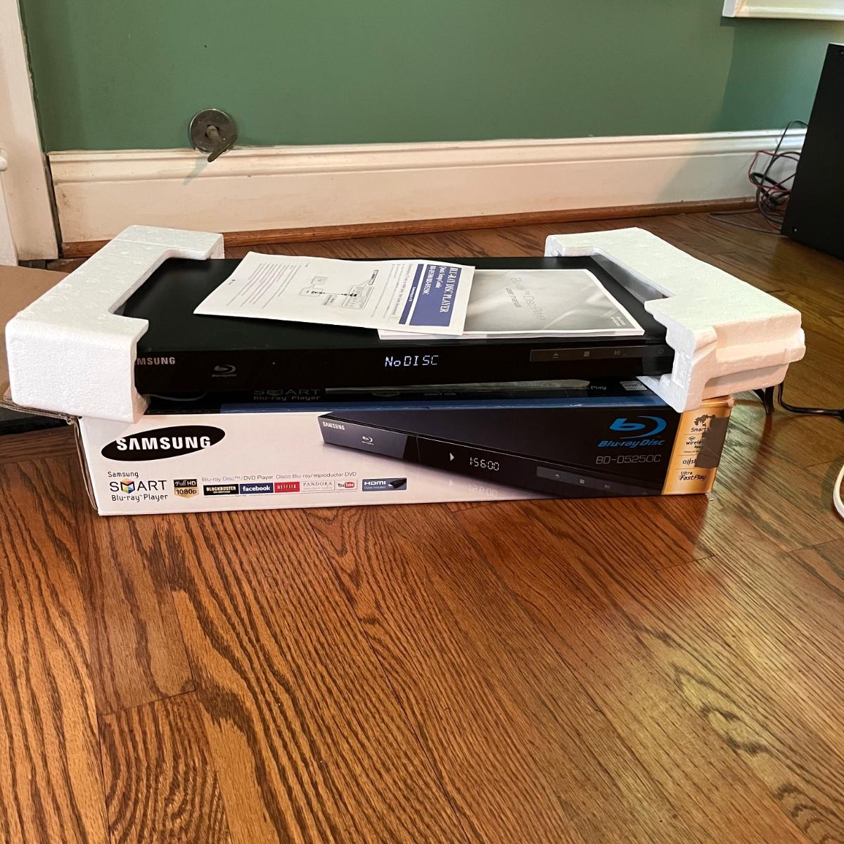 Lot includes a Samsung Smart Blu-Ray Player model # BD-D5250C and a Logitech remote model # 650. Blu-Ray player powered on when tested.