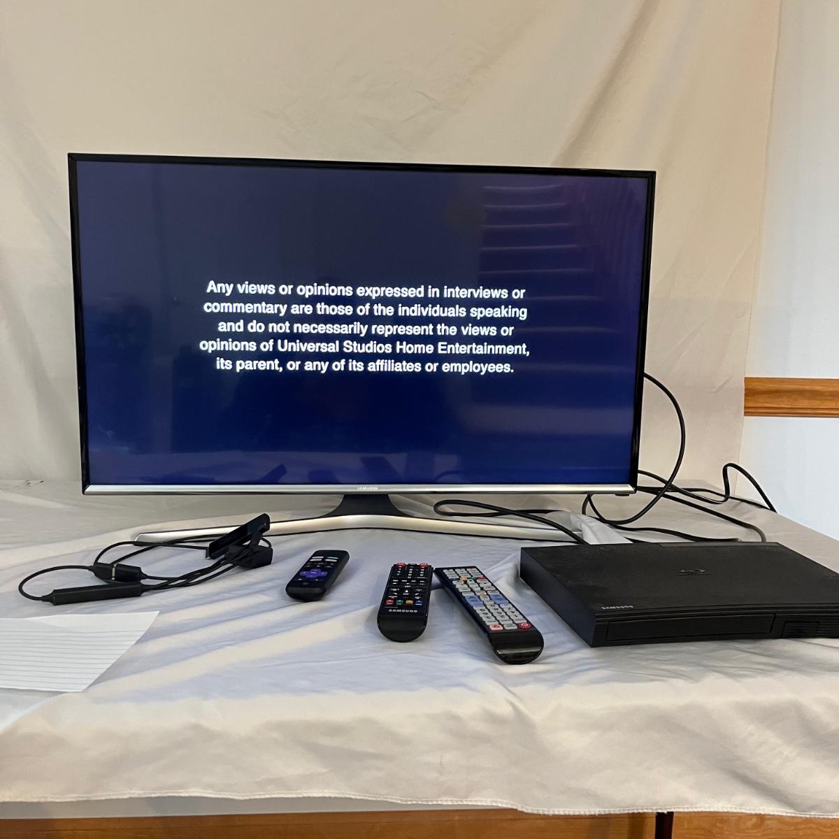 Lot includes a Samsung smart tv model # UN32J5500AF, Samsung Blu Ray player model # BD- J5100 and a Roku model # 3810X. All three worked when tested and includes remotes.