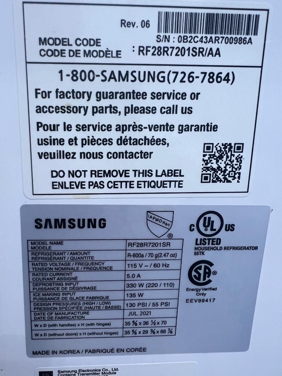 Samsung 28-cu ft 4-Door Smart French Door Refrigerator with Ice Maker, Water and Ice Dispenser (Stainless Steel) ENERGY STAR Item Model #RF28R7201SR Year July 2021. Measures 70 inches tall, 36 inches wide and approximately 35 inches deep to the front of handles.