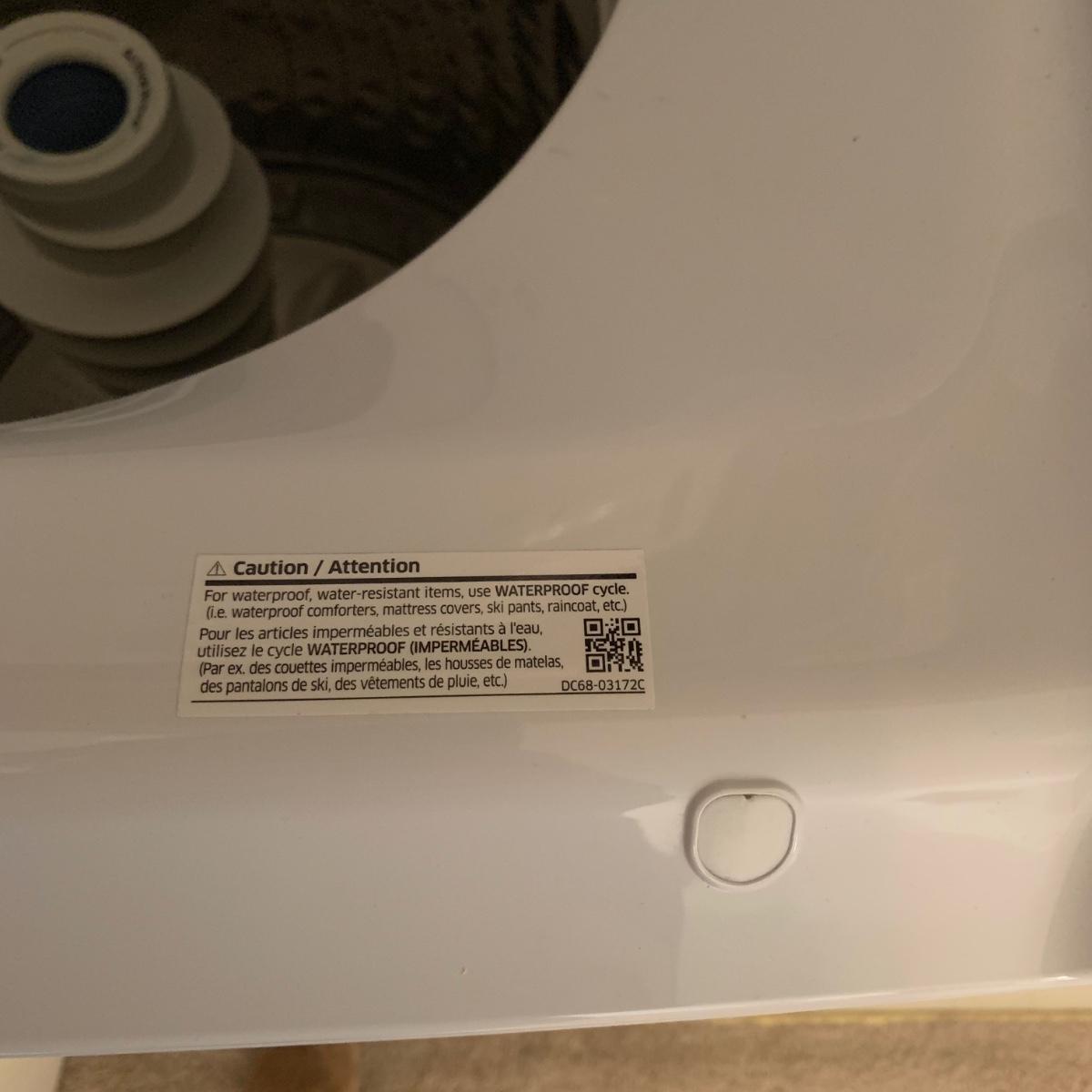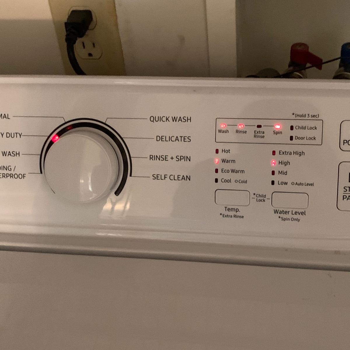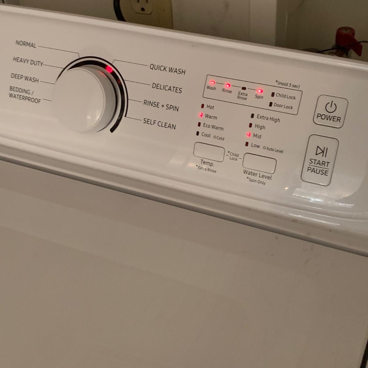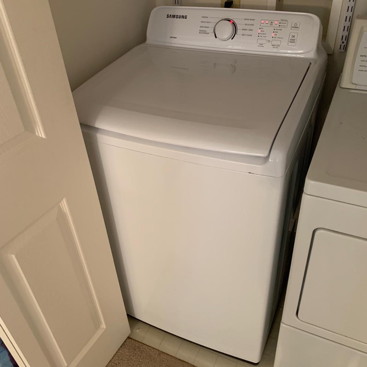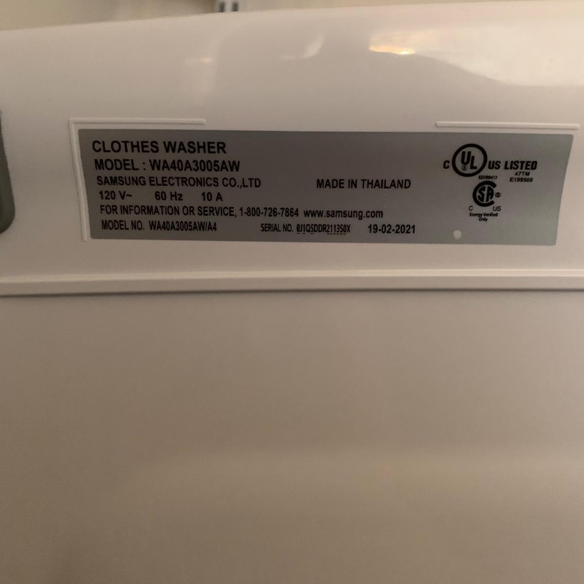 Samsung top load clothes washer. Measures 26.5” x 28” x 43”H. Washer is very clean and appears to be quite new. It powered on when power button was pushed. Please see photos for model number.