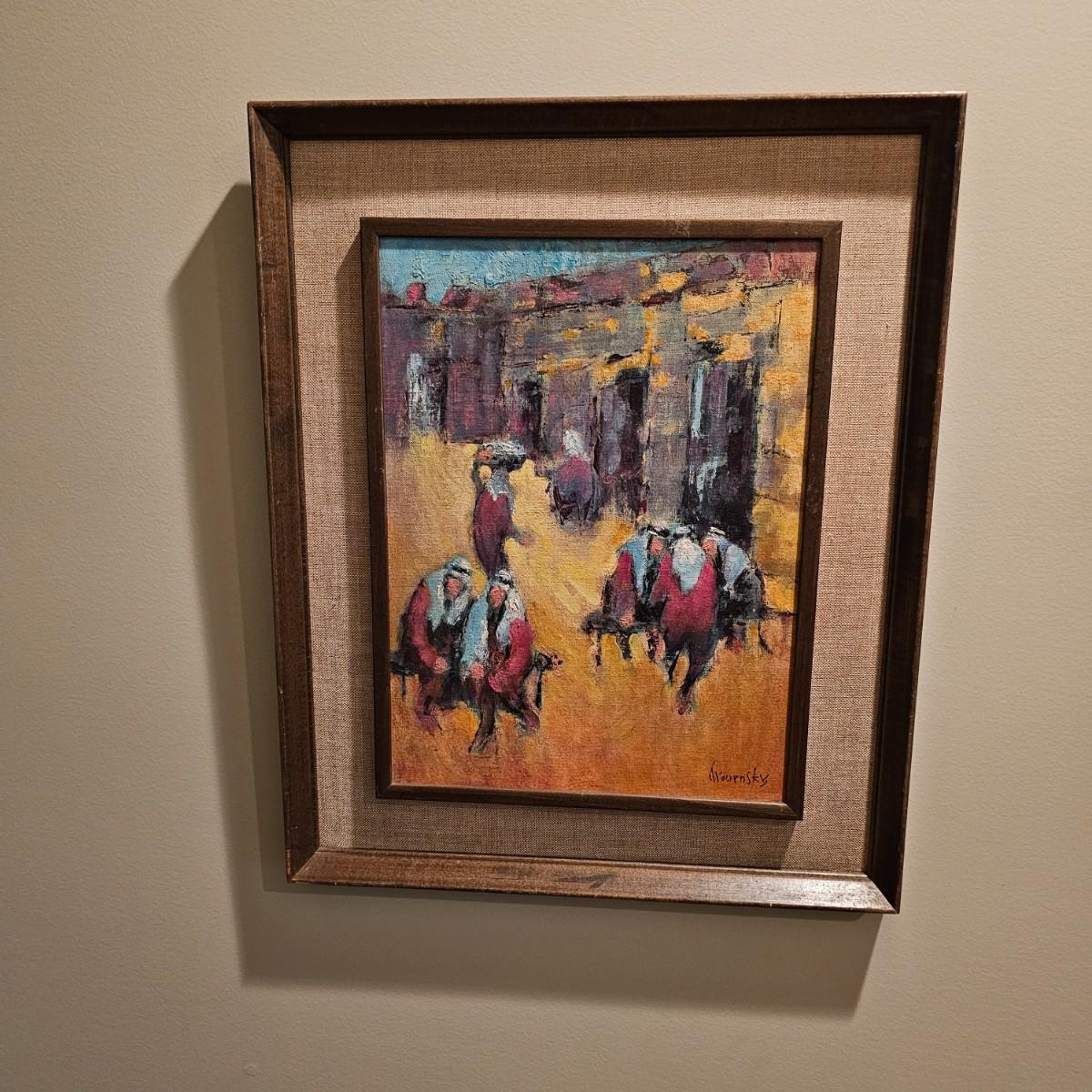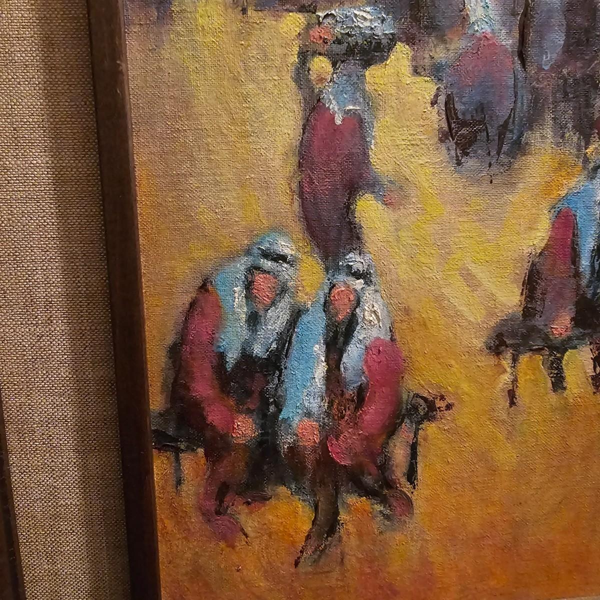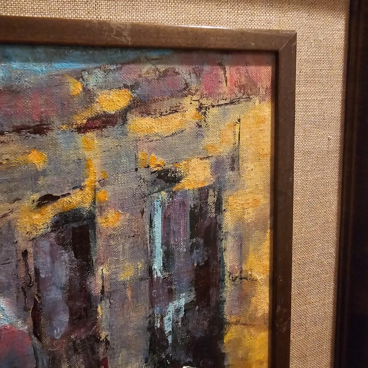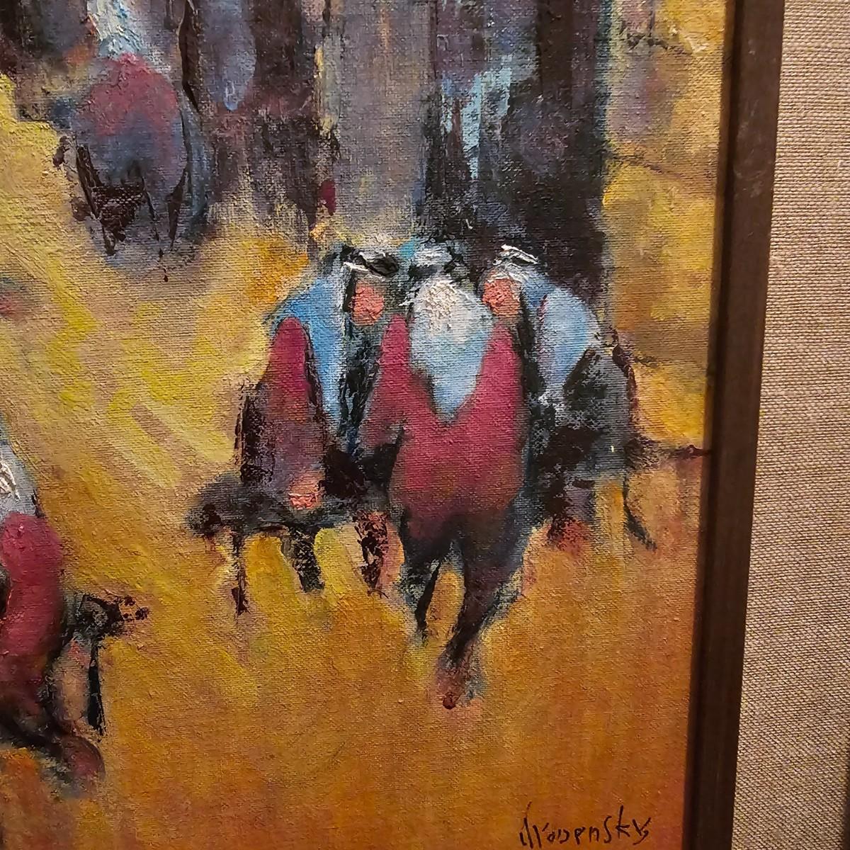 This art appears to be an impressionist oil painting by Samuel Grodensky in his signature style. Many of his works were based on his Jewish background and memories growing up in New York. The painting measures 18" x 22", has a date in marker on the back of 1968. Wood frame has cloth inner background. See photos for details. Shipping available. Shipping can be costly. We suggest contacting our preferred local shipping provider, Postage Express, with dimensions and getting an estimate before bidding: (828) 255-9250 or shipping@postageexpressnc.com.