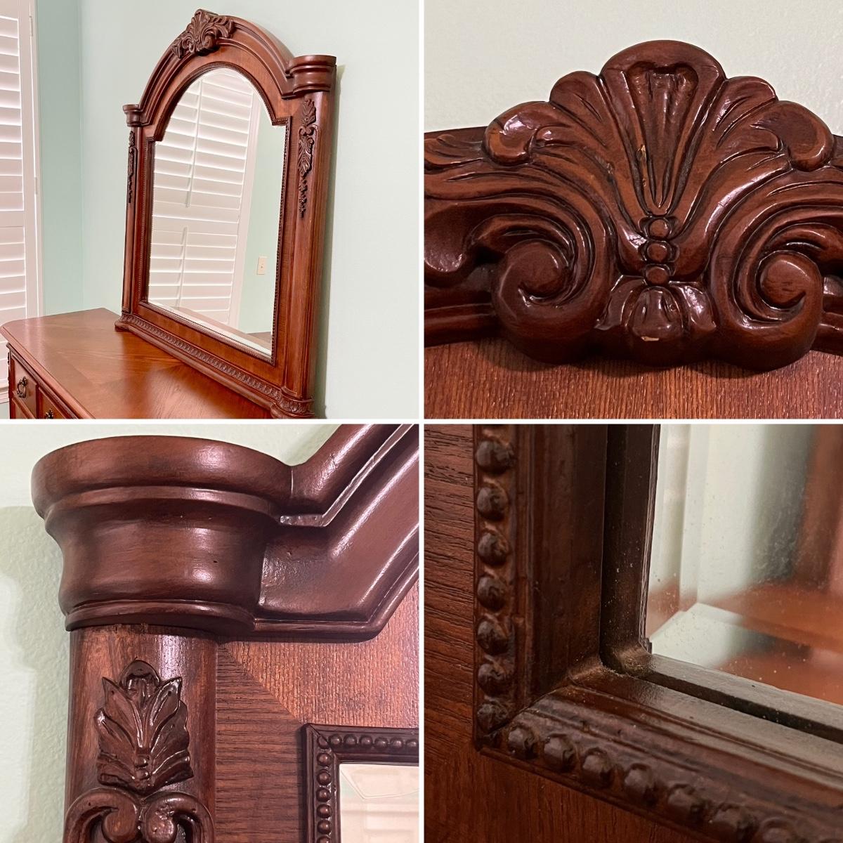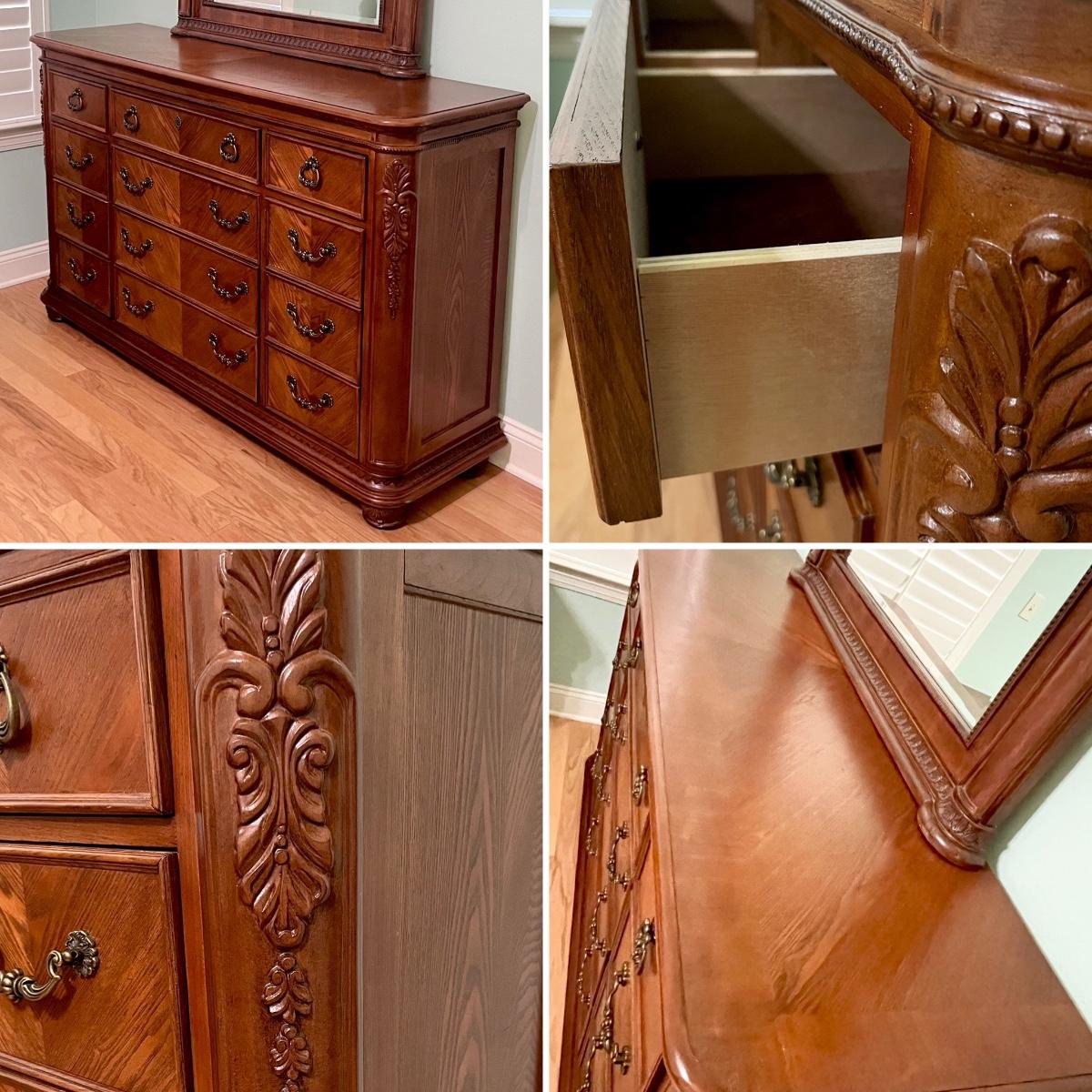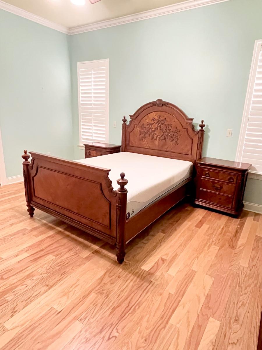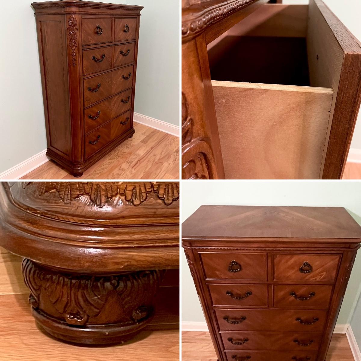 Includes = (1) Queen bed 66” H ~ (2) 3 Drawer Nightstands 30” H x 28.5” W x 17” D ~ (1) 5 Drawer chest of drawers 58” H x 41” W x 18” D ~ (1) 12 Drawer Dresser 39” H x 64” W x 18 “ D ~ (1) Mirror 42” H ~ Sleep number Mattress & Base sold separately ~ One nightstand has a broken handle as seen in photo ~ The bed does not have slats ~ Top drawers of all drawers & nightstands are lined with felt ~ All drawers slide easily