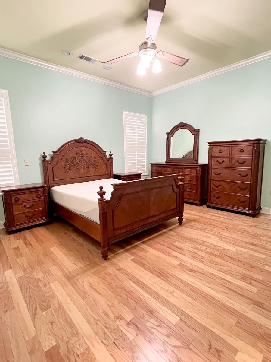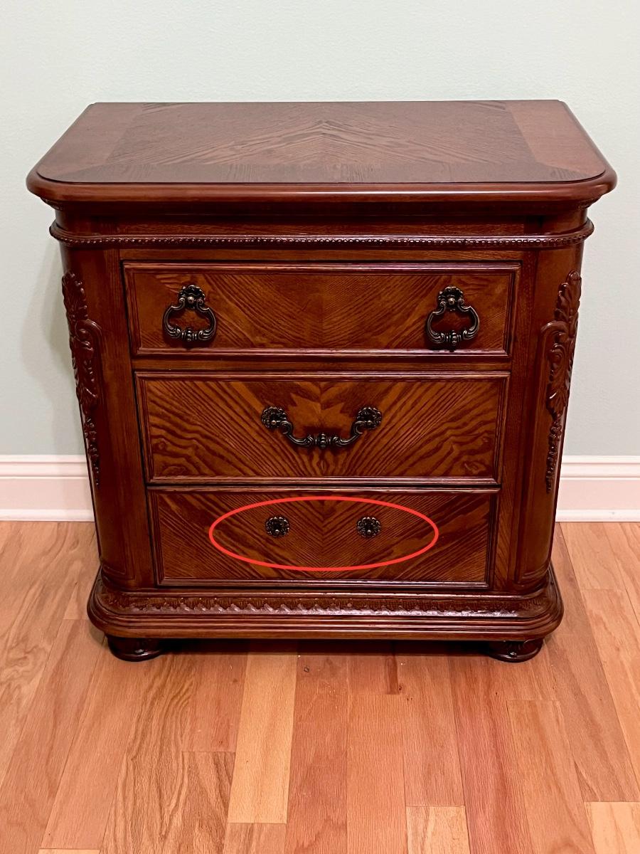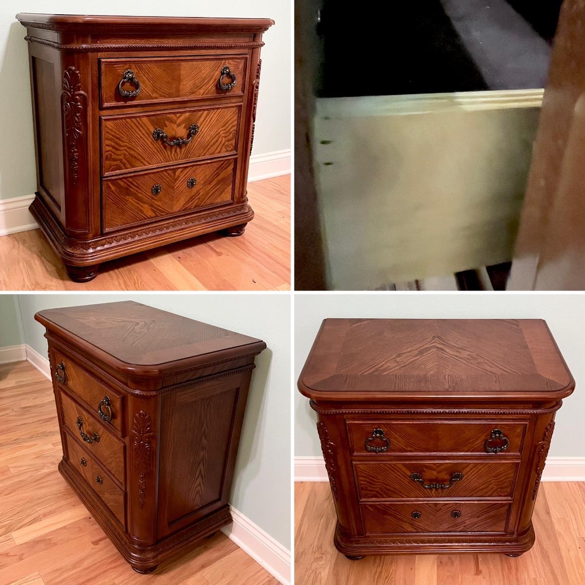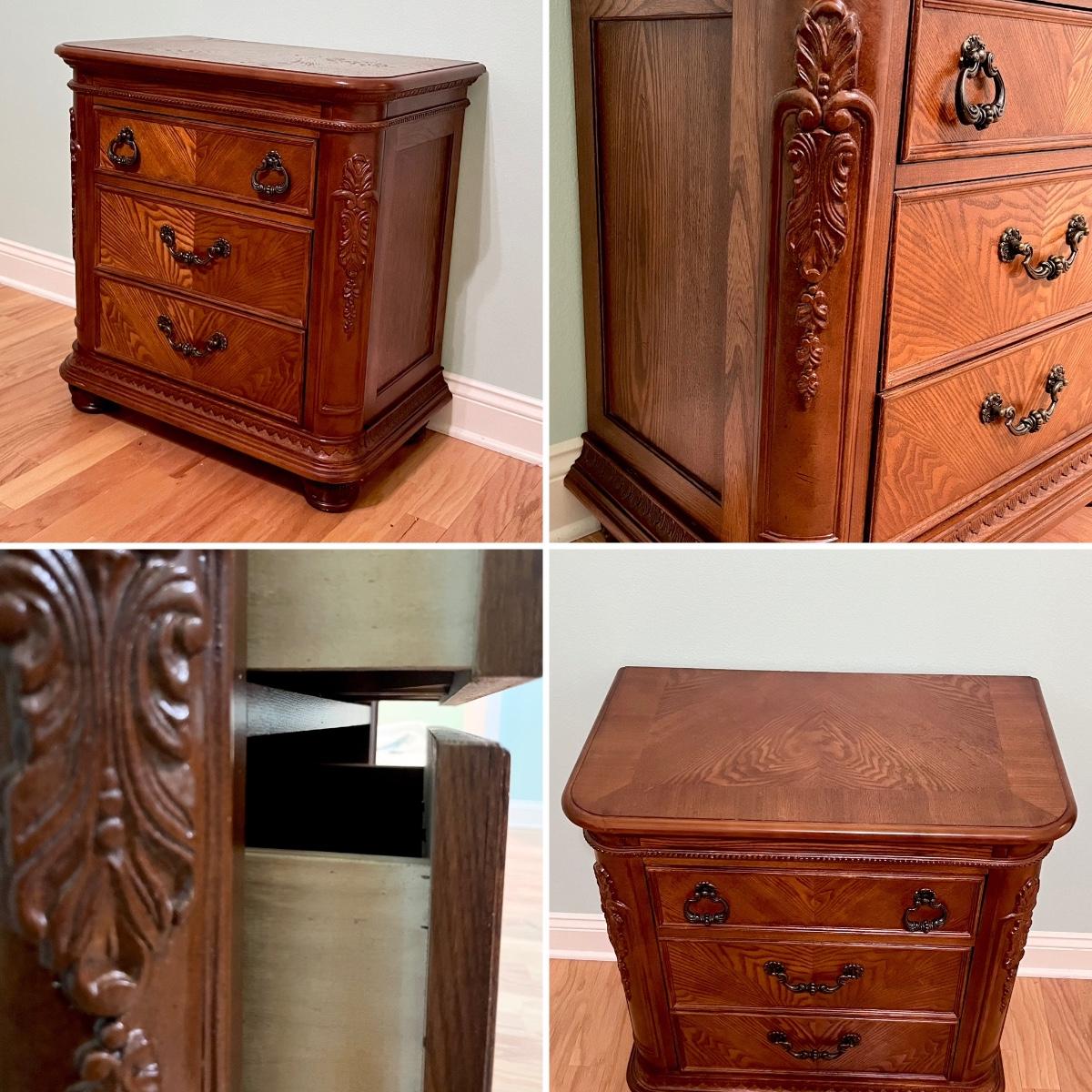 Includes = (1) Queen bed 66” H ~ (2) 3 Drawer Nightstands 30” H x 28.5” W x 17” D ~ (1) 5 Drawer chest of drawers 58” H x 41” W x 18” D ~ (1) 12 Drawer Dresser 39” H x 64” W x 18 “ D ~ (1) Mirror 42” H ~ Sleep number Mattress & Base sold separately ~ One nightstand has a broken handle as seen in photo ~ The bed does not have slats ~ Top drawers of all drawers & nightstands are lined with felt ~ All drawers slide easily