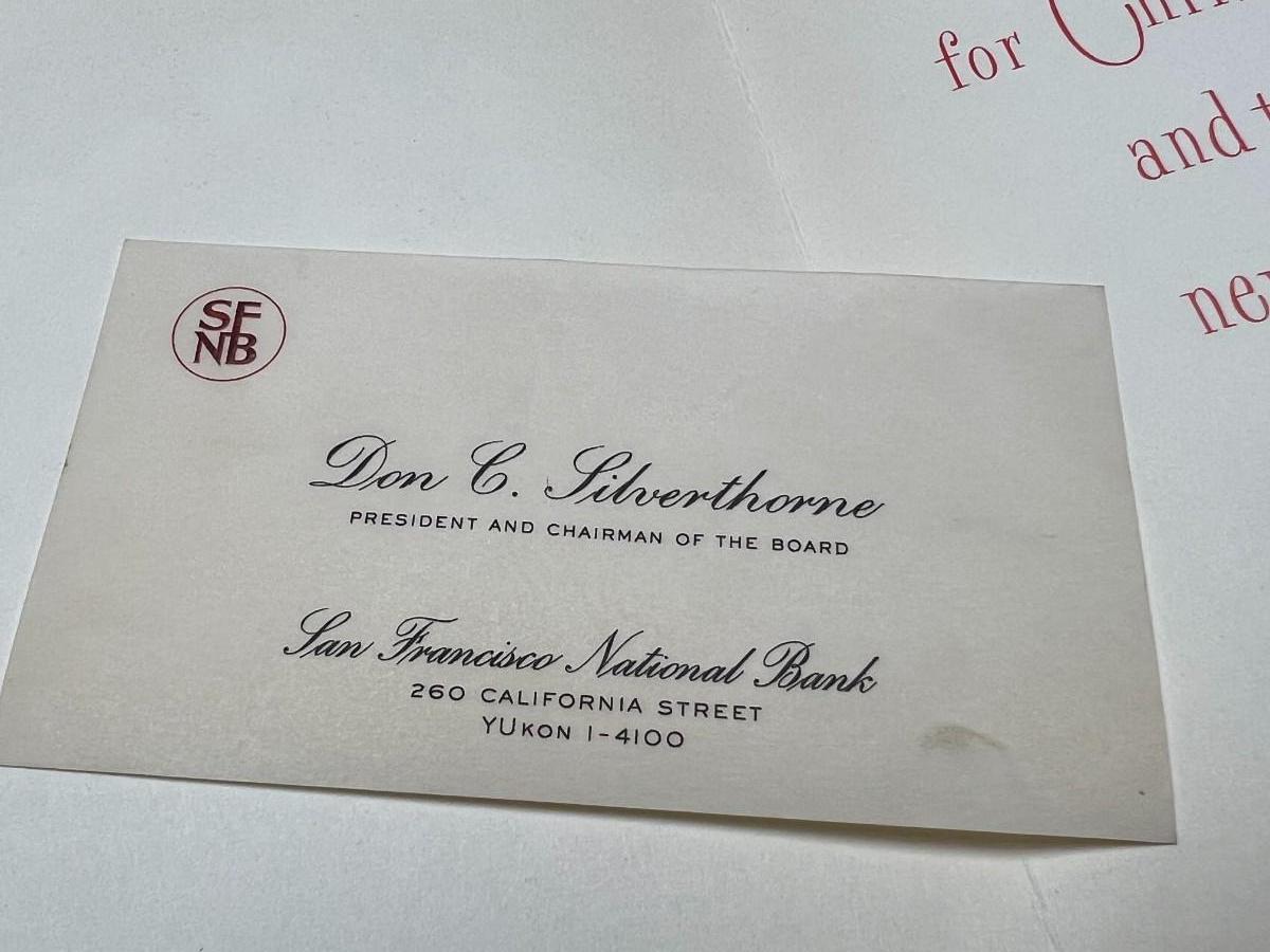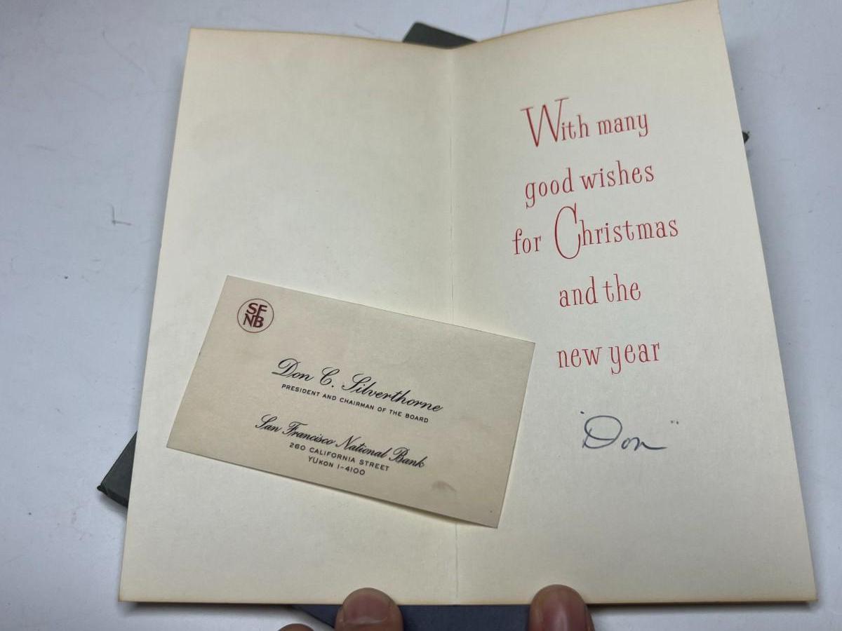 In Good Condition for age. Don Silverthorne, author of The San Francisco Story & President of San Francisco National Bank signed Christmas card with business card included.