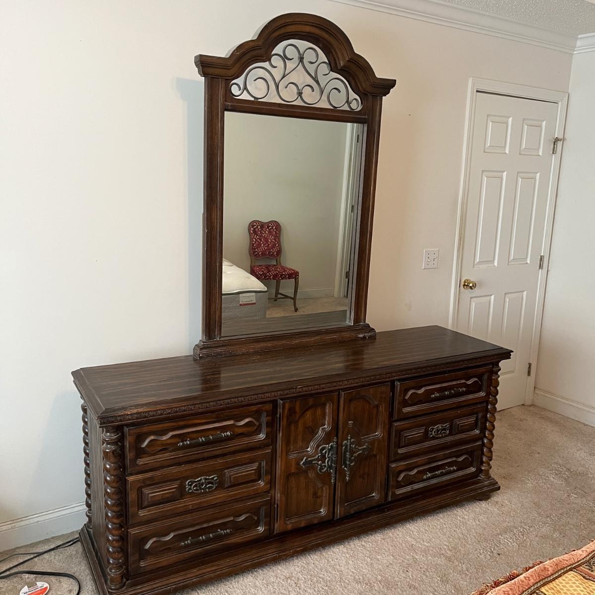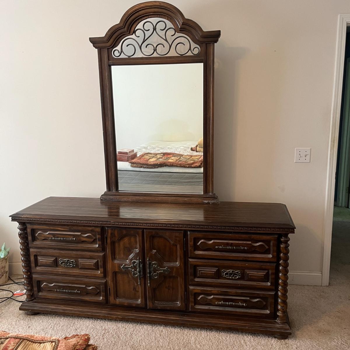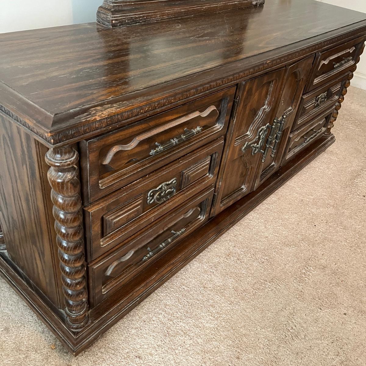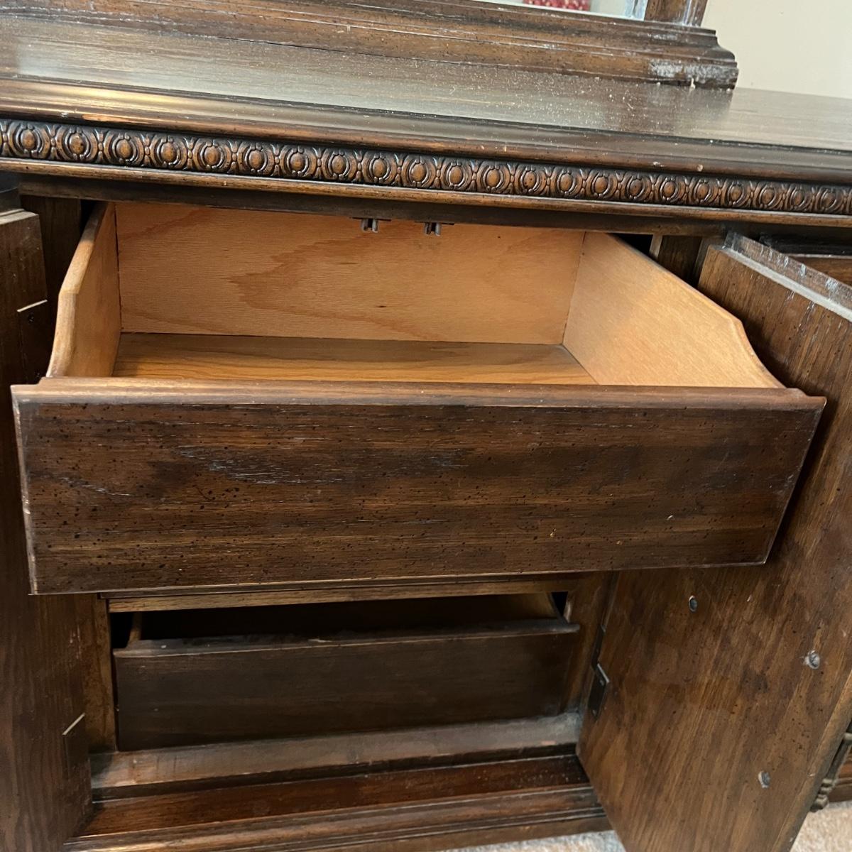 This San Marco dresser has nine drawers with three of them behind two doors. Dresser measures 20” x 75” x 31”H and mirror measures 37” x 55”H. Mirror appears to come apart from dresser, also mirror backing has come loose, see pictures. Dresser is up one flight of stairs.