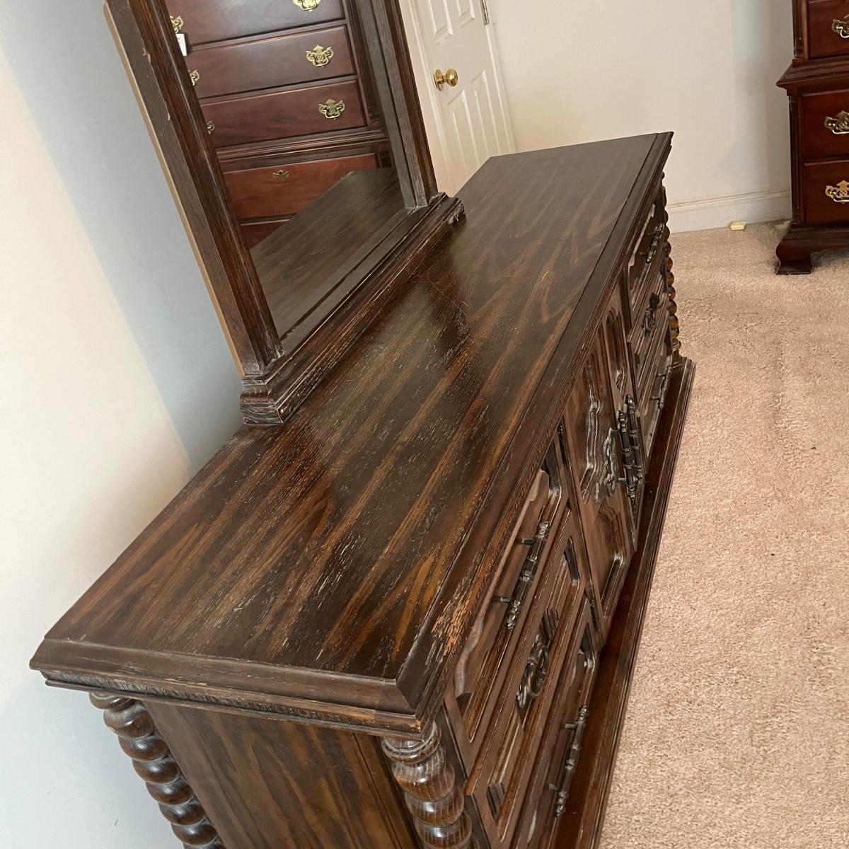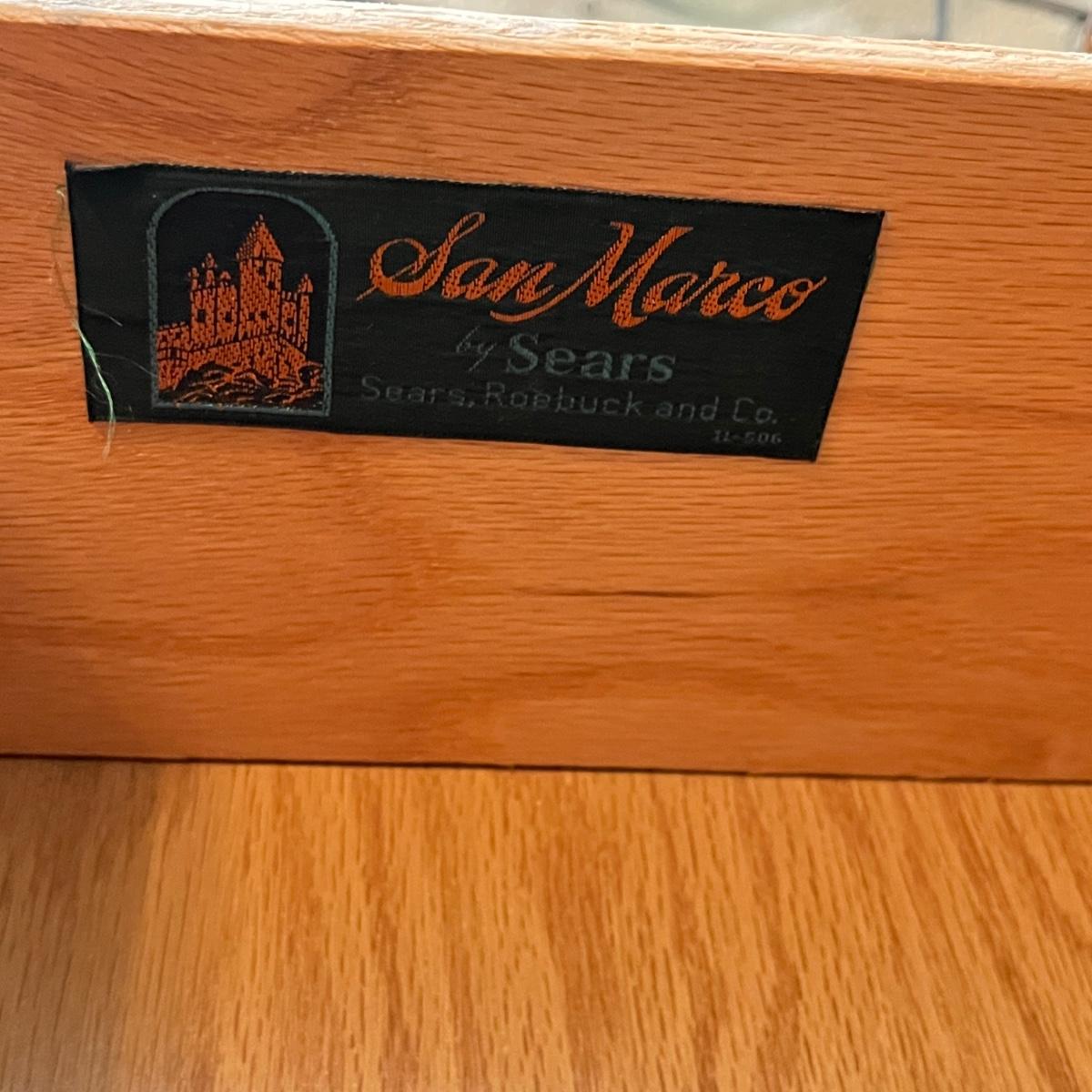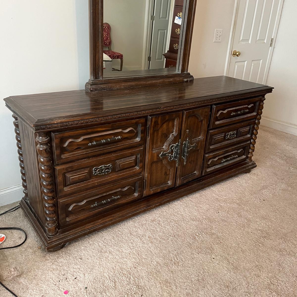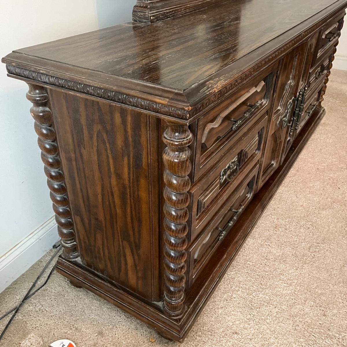 This San Marco dresser has nine drawers with three of them behind two doors. Dresser measures 20” x 75” x 31”H and mirror measures 37” x 55”H. Mirror appears to come apart from dresser, also mirror backing has come loose, see pictures. Dresser is up one flight of stairs.