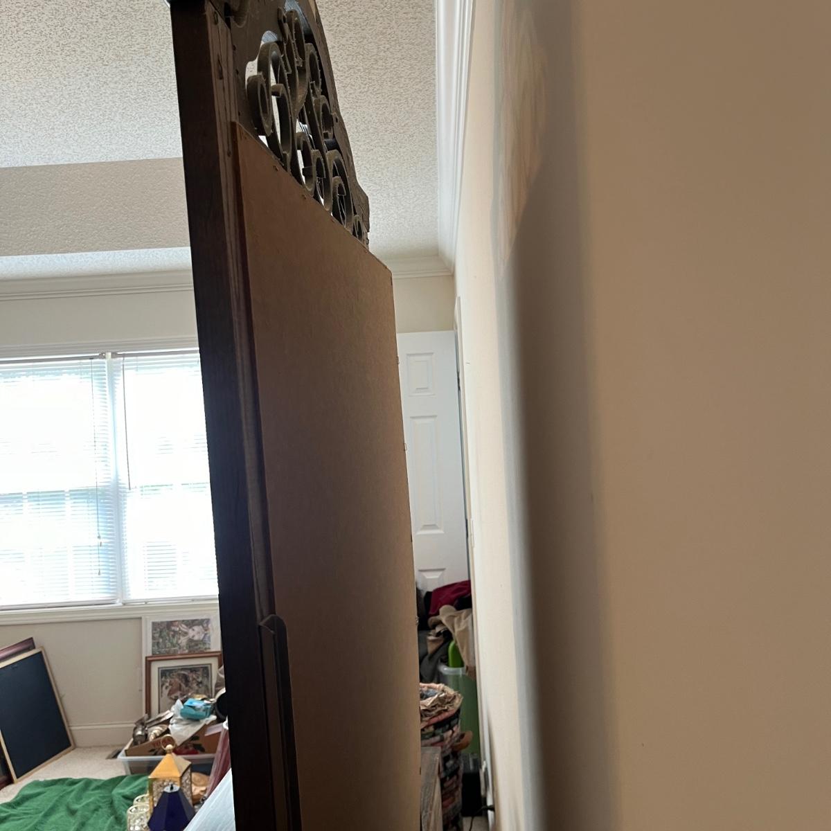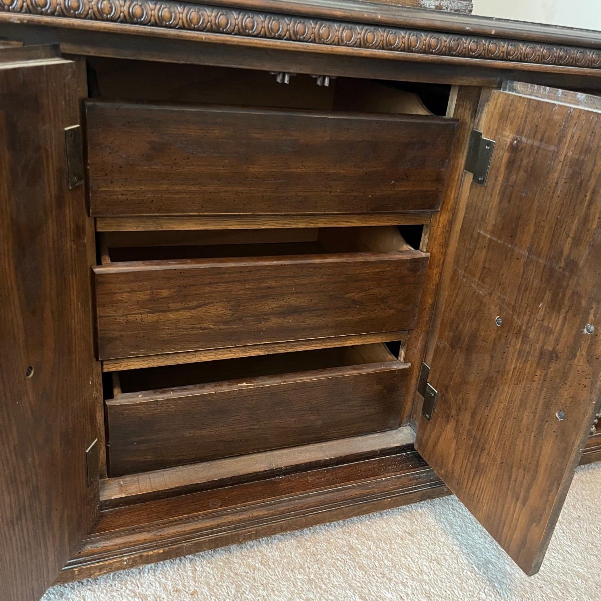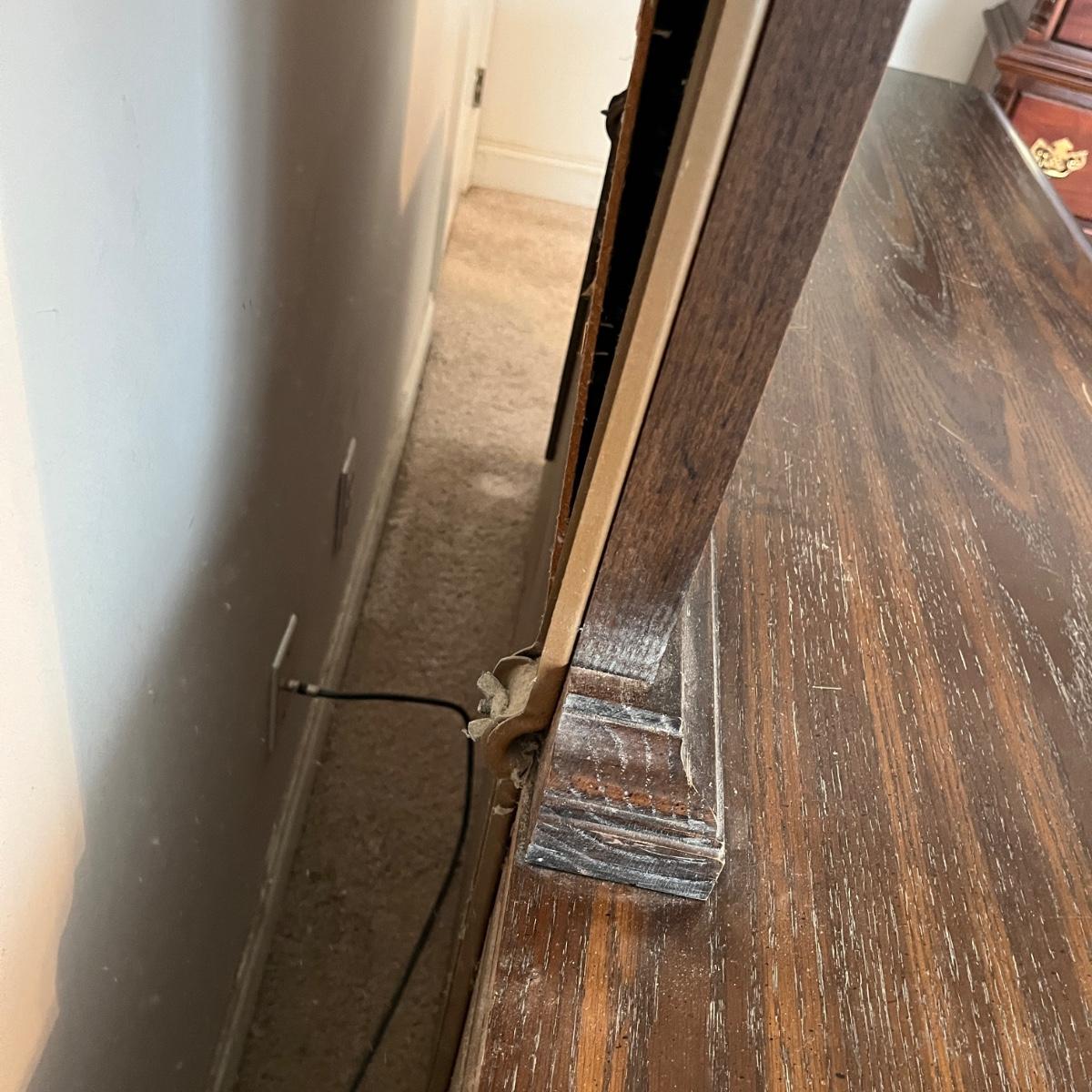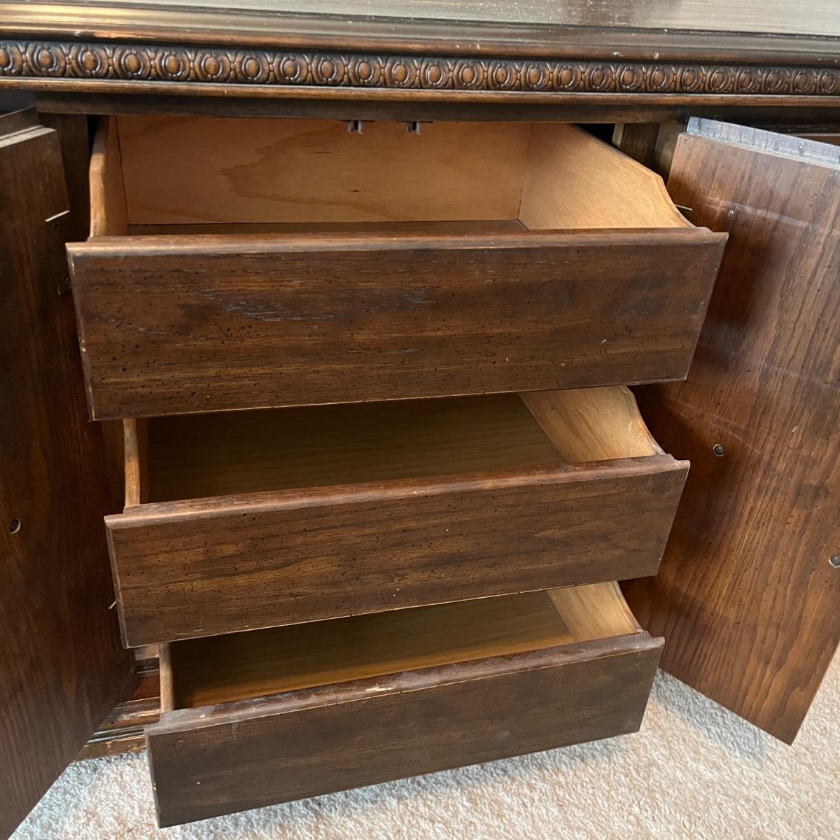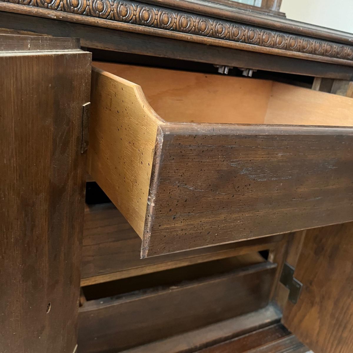 This San Marco dresser has nine drawers with three of them behind two doors. Dresser measures 20” x 75” x 31”H and mirror measures 37” x 55”H. Mirror appears to come apart from dresser, also mirror backing has come loose, see pictures. Dresser is up one flight of stairs.