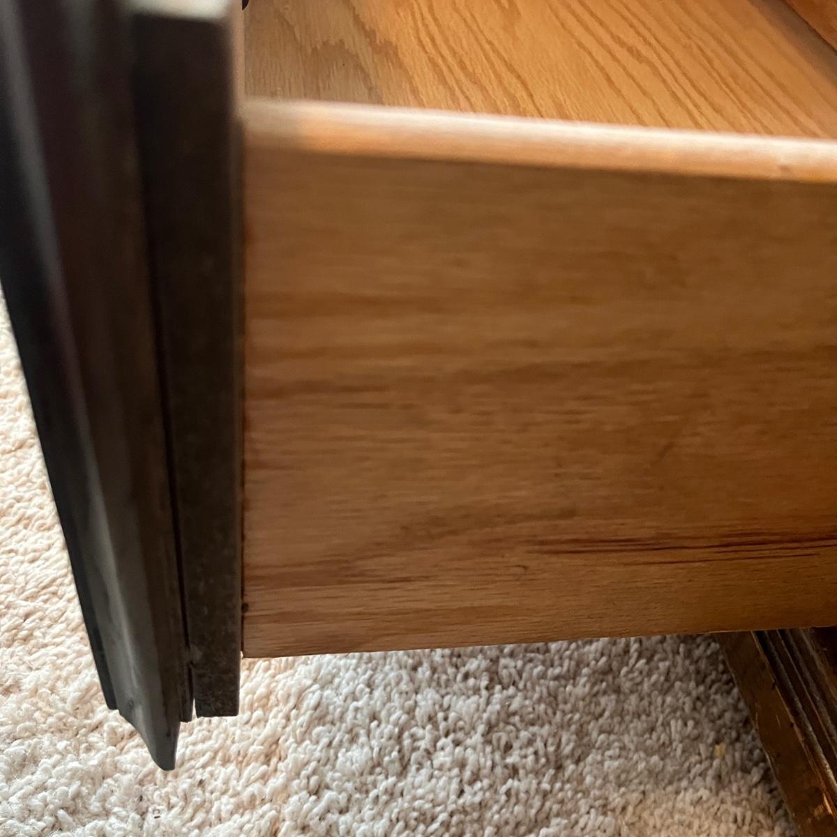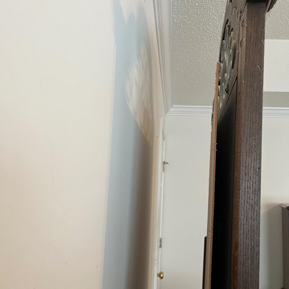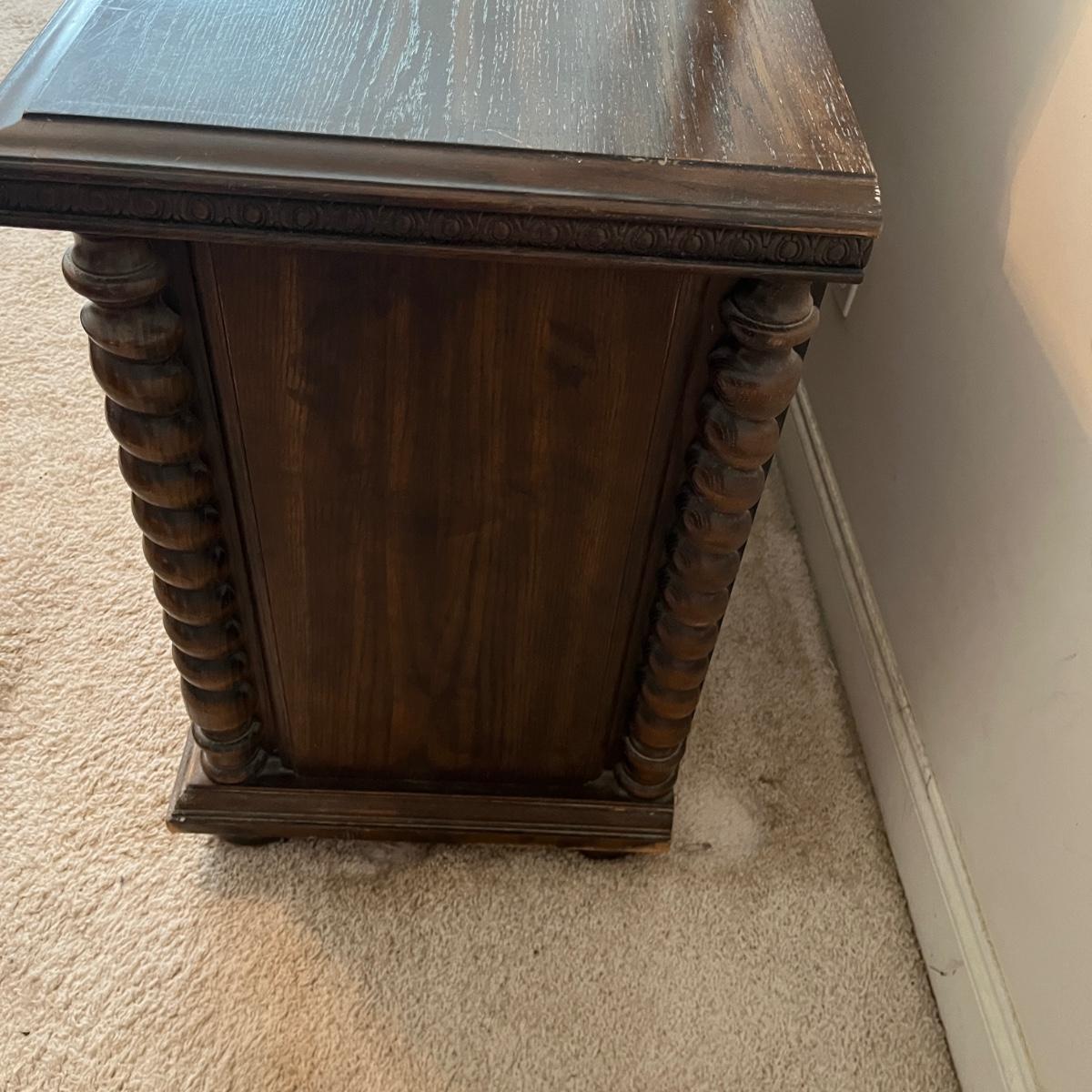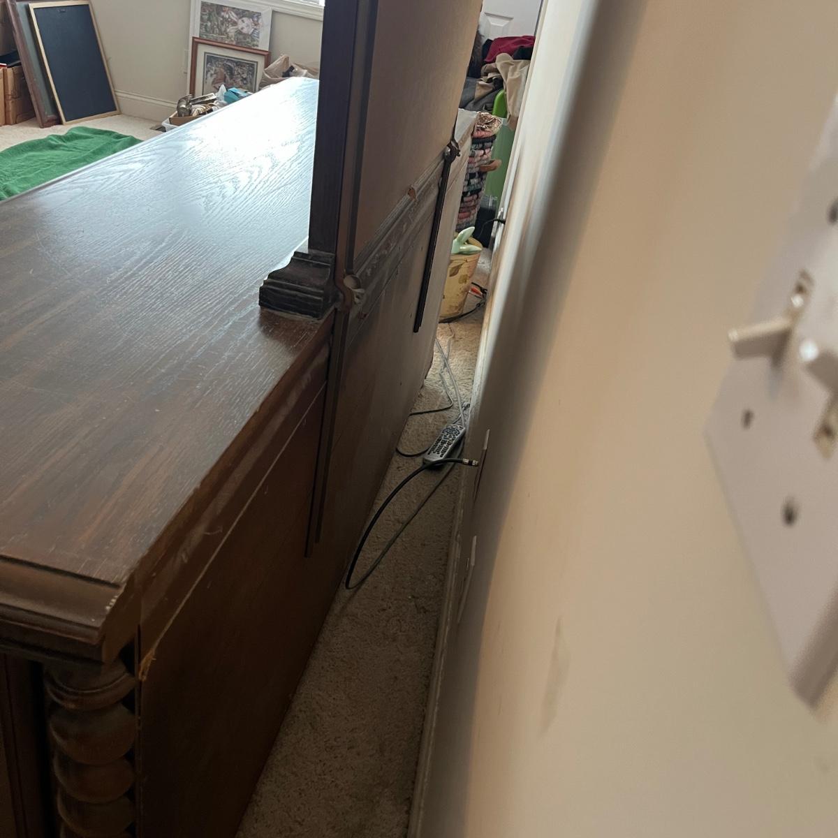 This San Marco dresser has nine drawers with three of them behind two doors. Dresser measures 20” x 75” x 31”H and mirror measures 37” x 55”H. Mirror appears to come apart from dresser, also mirror backing has come loose, see pictures. Dresser is up one flight of stairs.