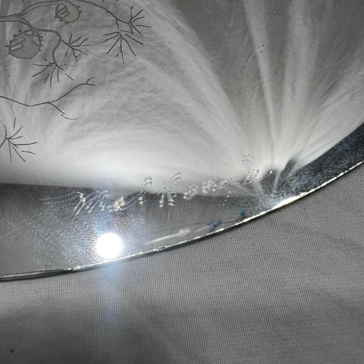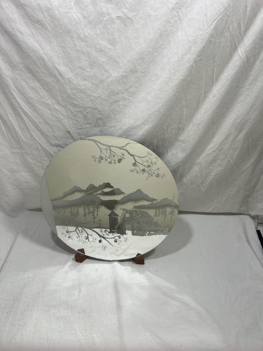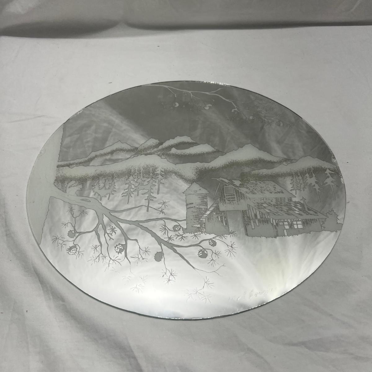 Sandblasted art onto mirror of Cabin In mountains by mel Rodela comes with custom wood stand made for art type. 15"