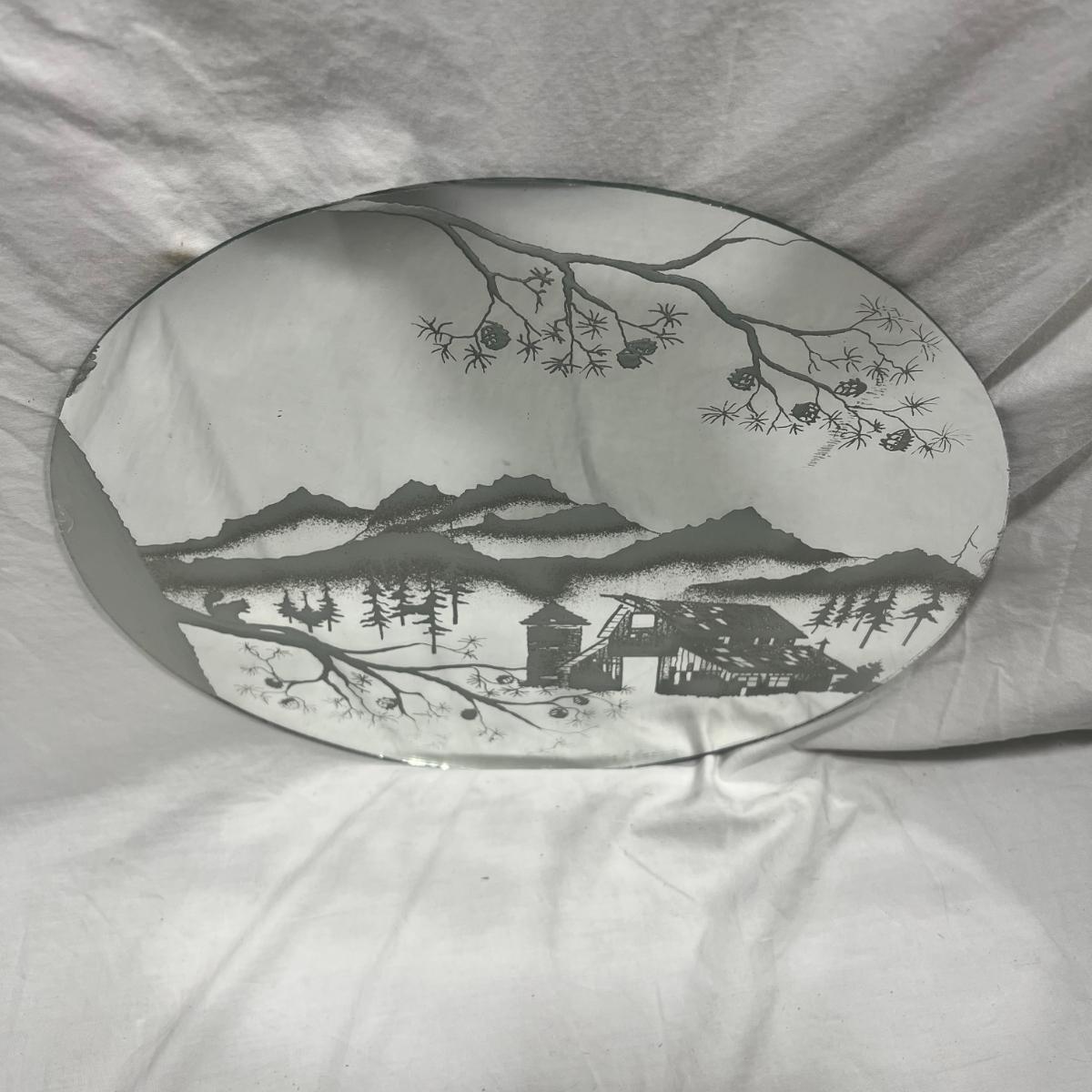 Sandblasted art onto mirror of Cabin In mountains
