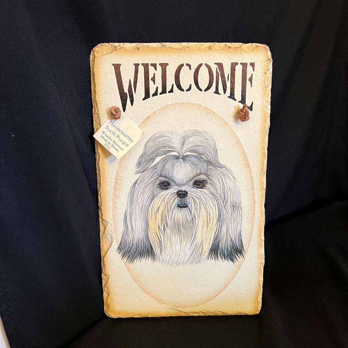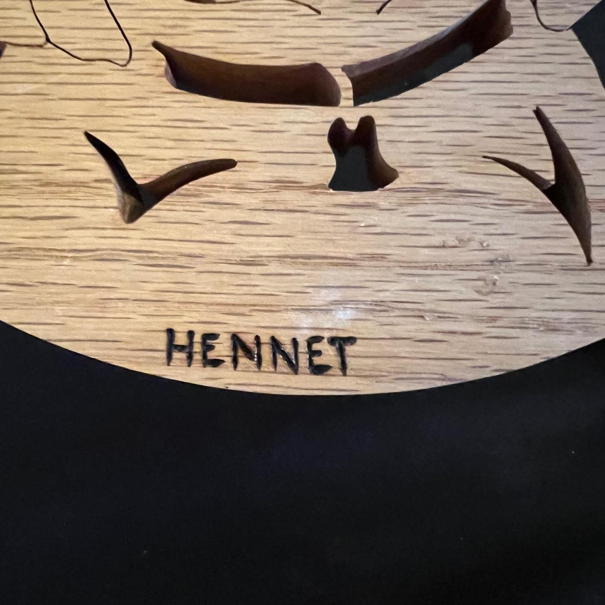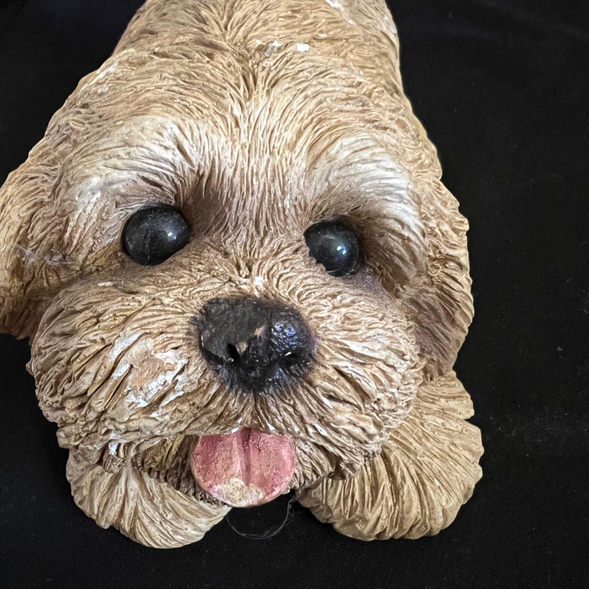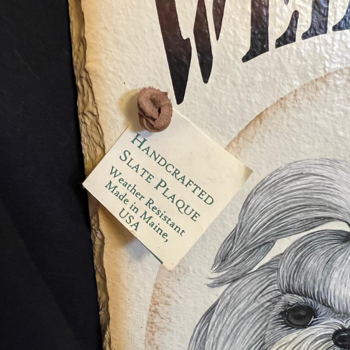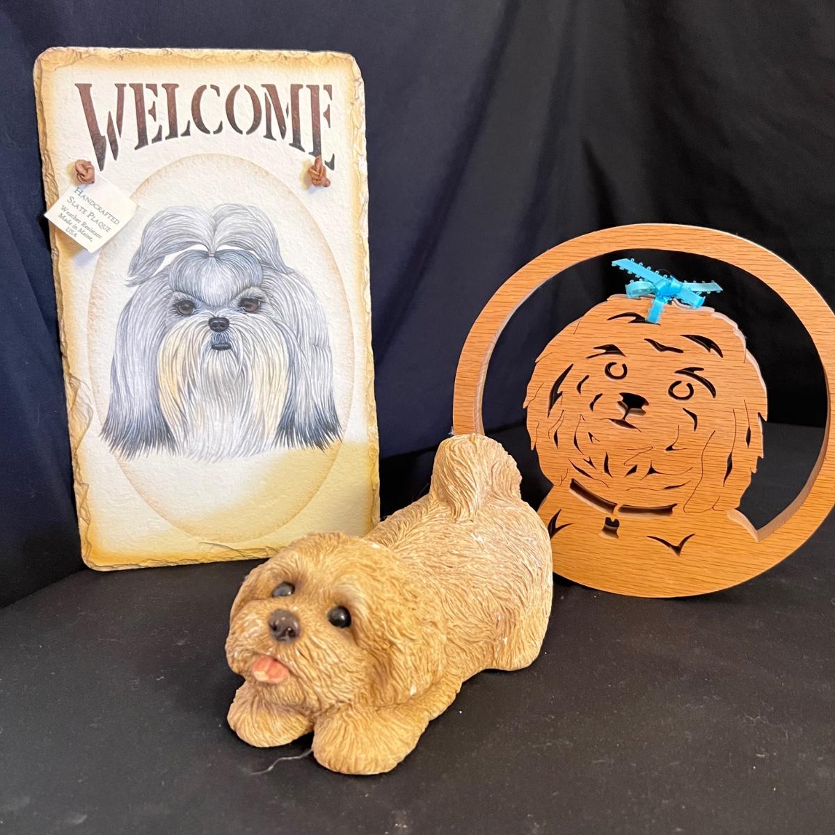 This lot of three items includes a handcrafted slate plaque with leather cord for hanging, a Sandicast brown dog sculpture and a round wooden plaque stamped Hennet. The Sandicast sculpture has a few tiny chips in the fur and the tip of the tongue shown in images, all other items are in good condition. The wood plaque has remnants of a sticker.