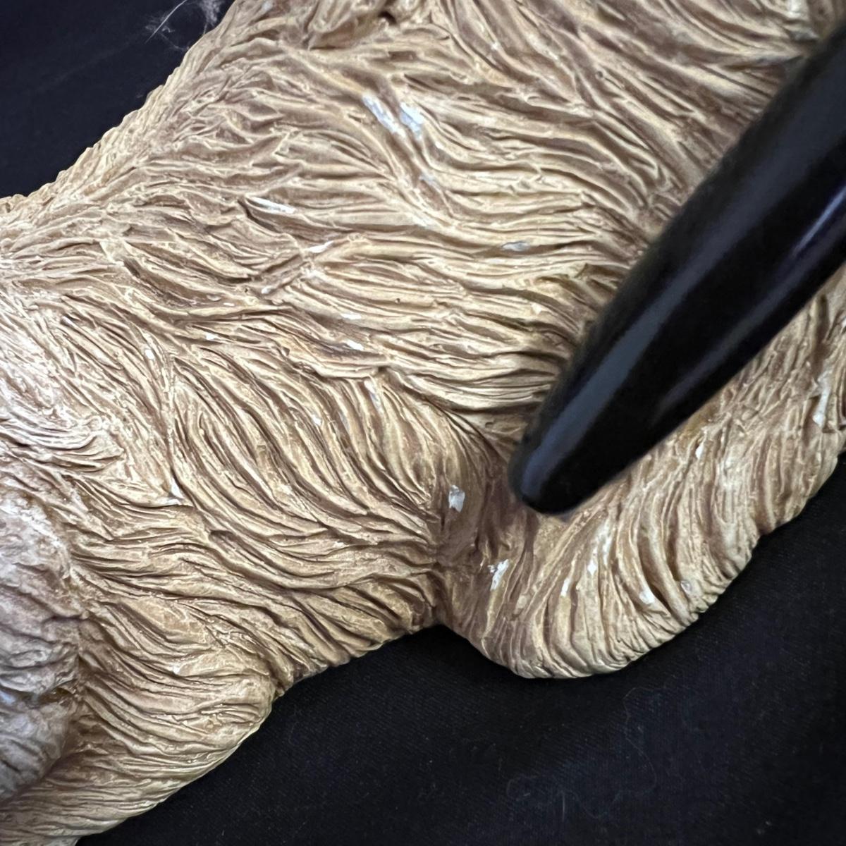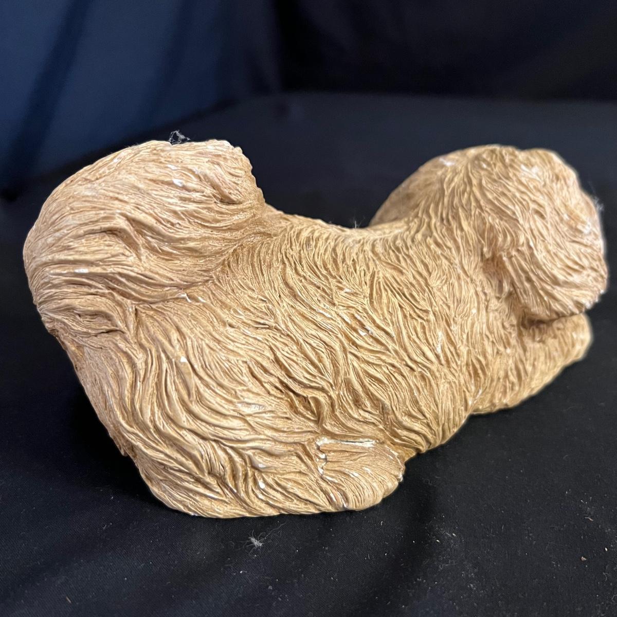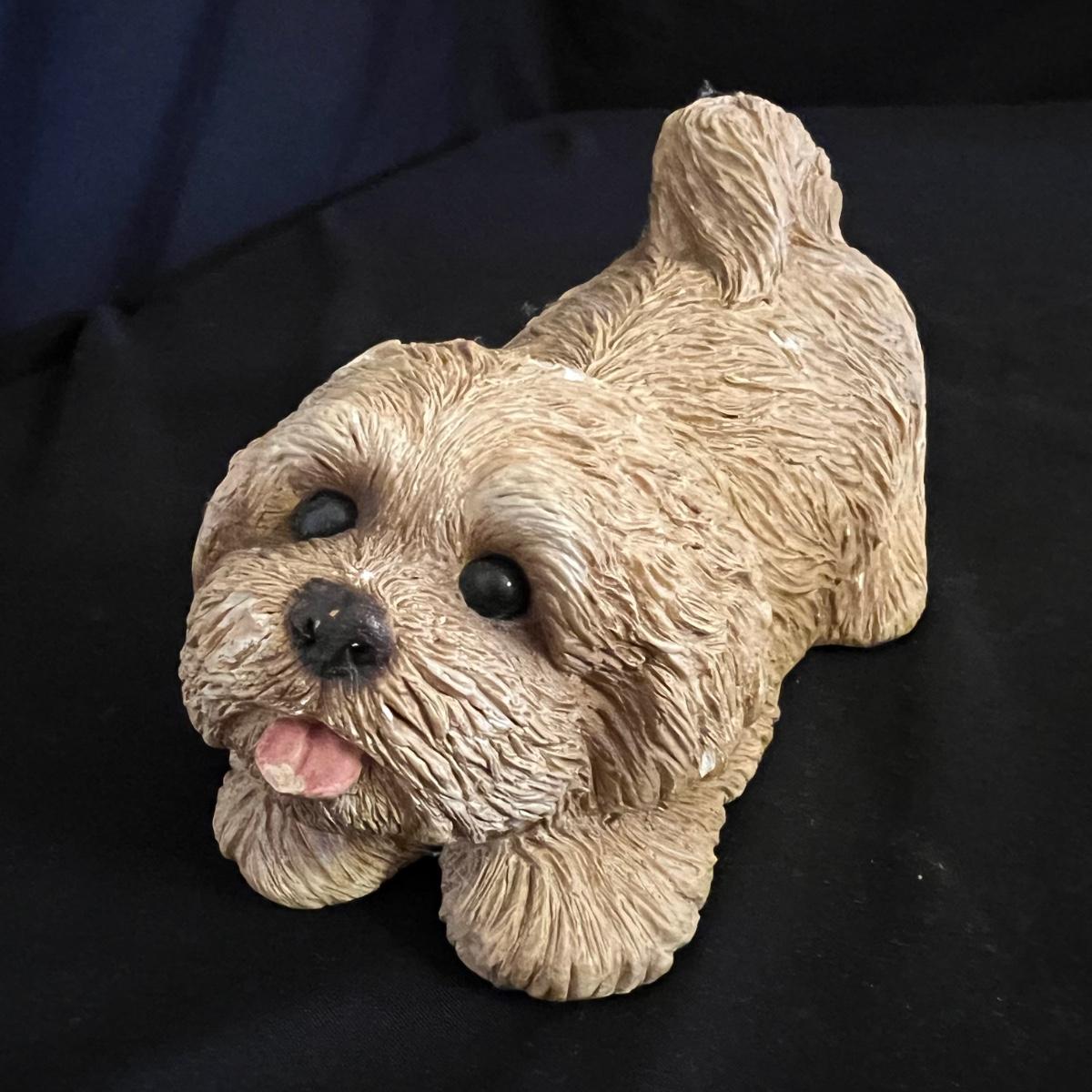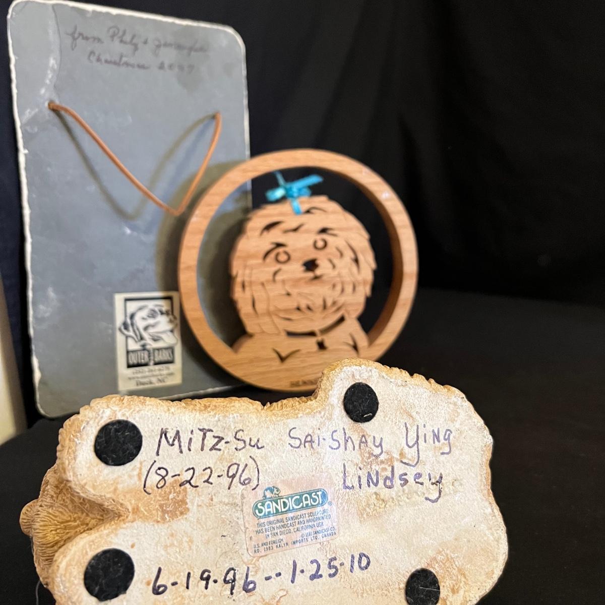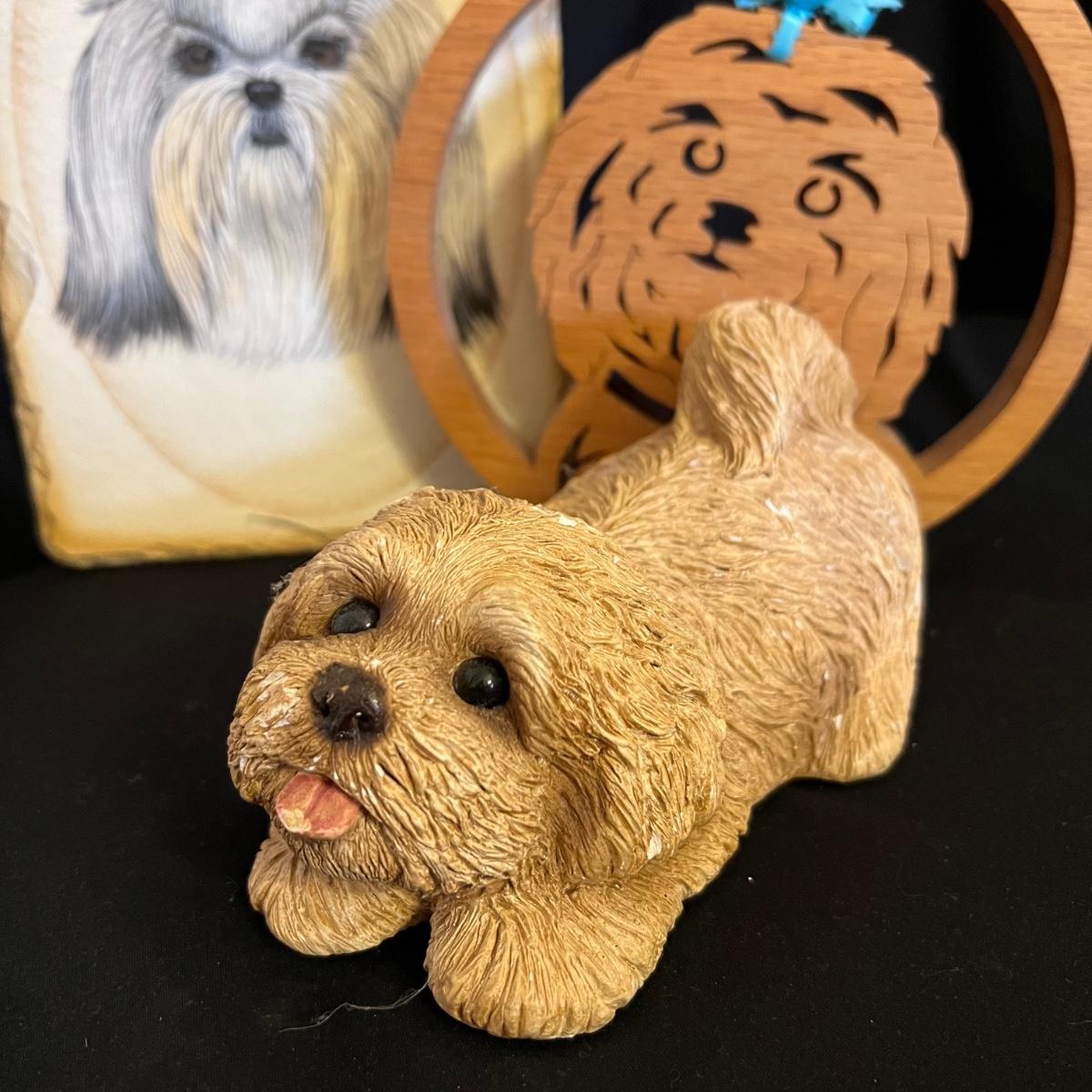 This lot of three items includes a handcrafted slate plaque with leather cord for hanging, a Sandicast brown dog sculpture and a round wooden plaque stamped Hennet. The Sandicast sculpture has a few tiny chips in the fur and the tip of the tongue shown in images, all other items are in good condition. The wood plaque has remnants of a sticker.