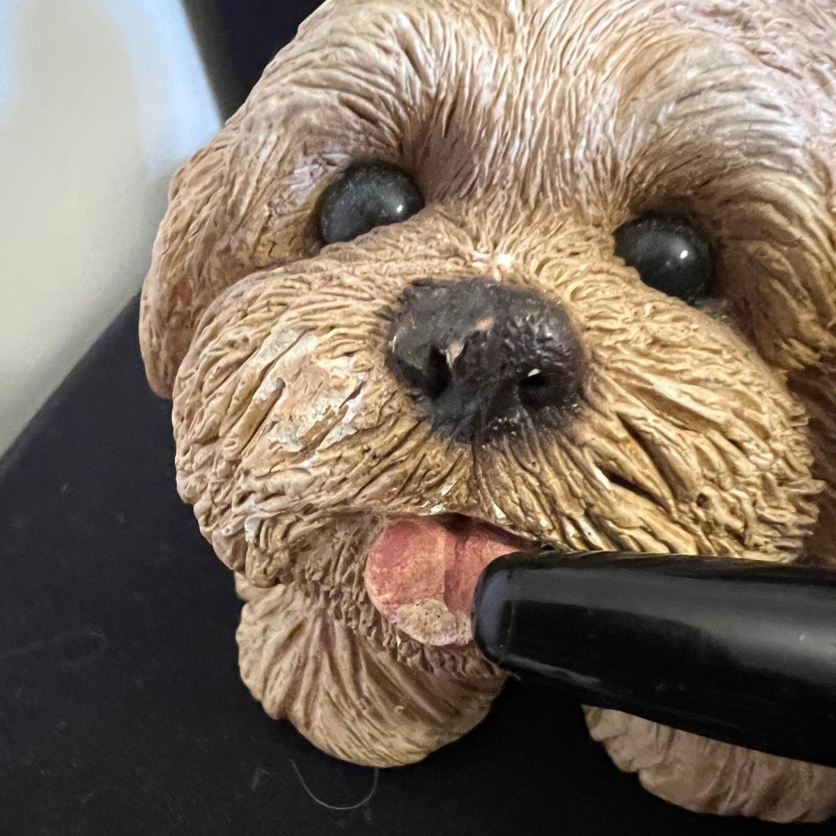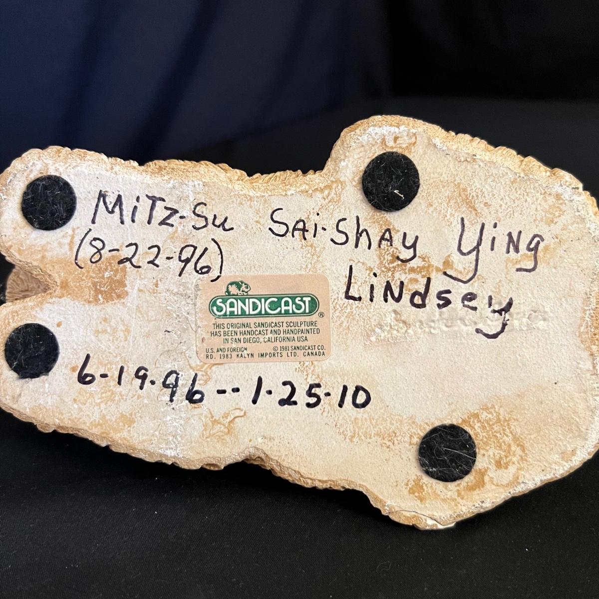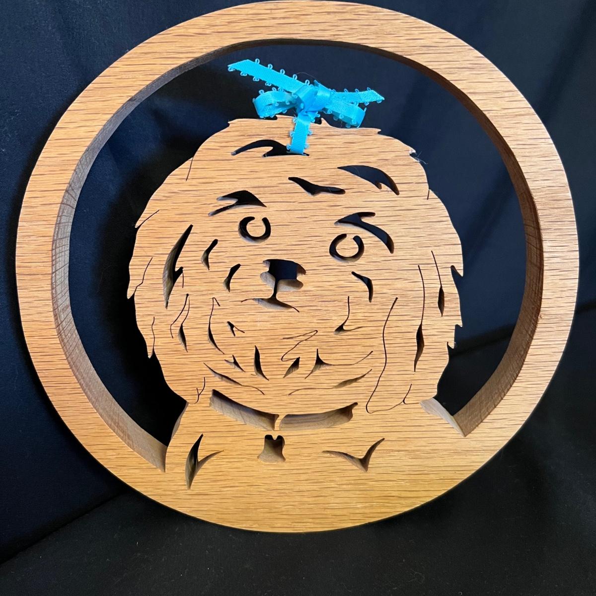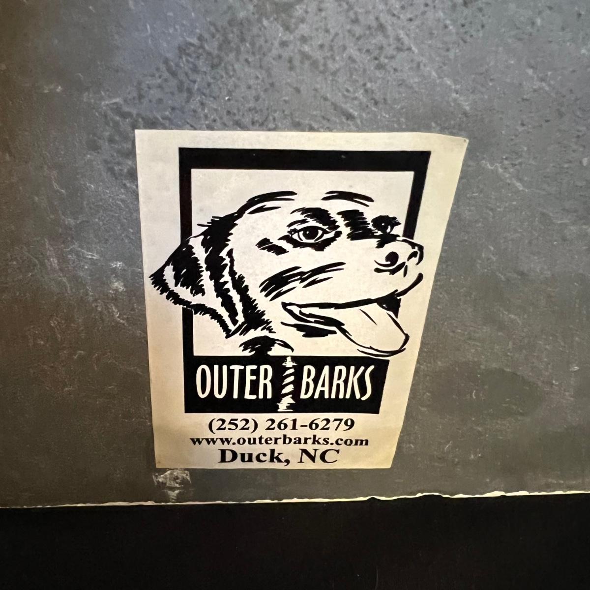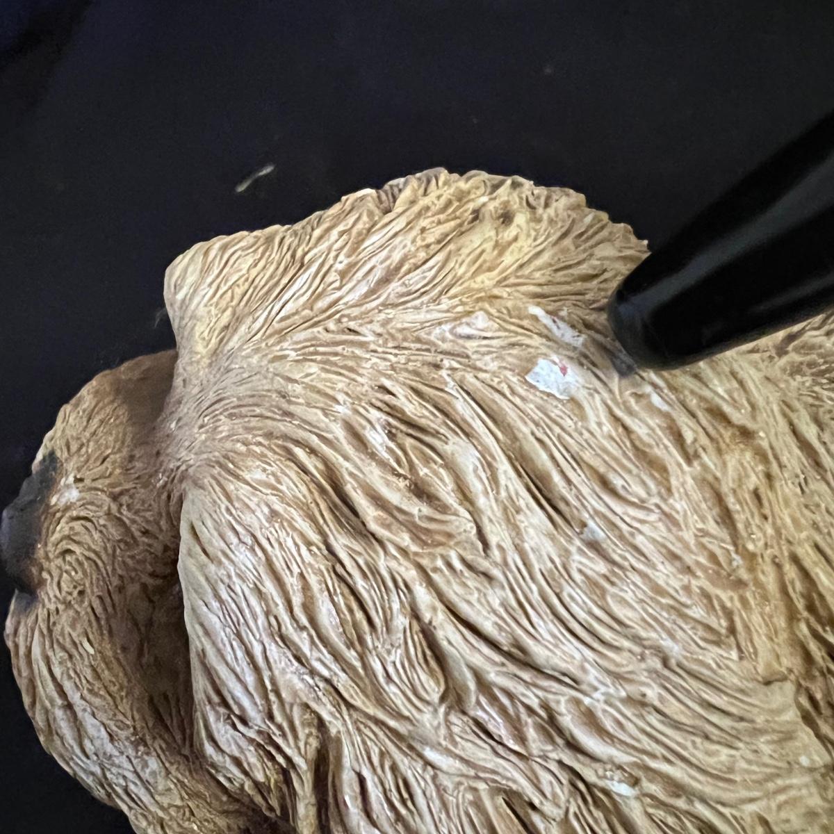 This lot of three items includes a handcrafted slate plaque with leather cord for hanging, a Sandicast brown dog sculpture and a round wooden plaque stamped Hennet. The Sandicast sculpture has a few tiny chips in the fur and the tip of the tongue shown in images, all other items are in good condition. The wood plaque has remnants of a sticker.
