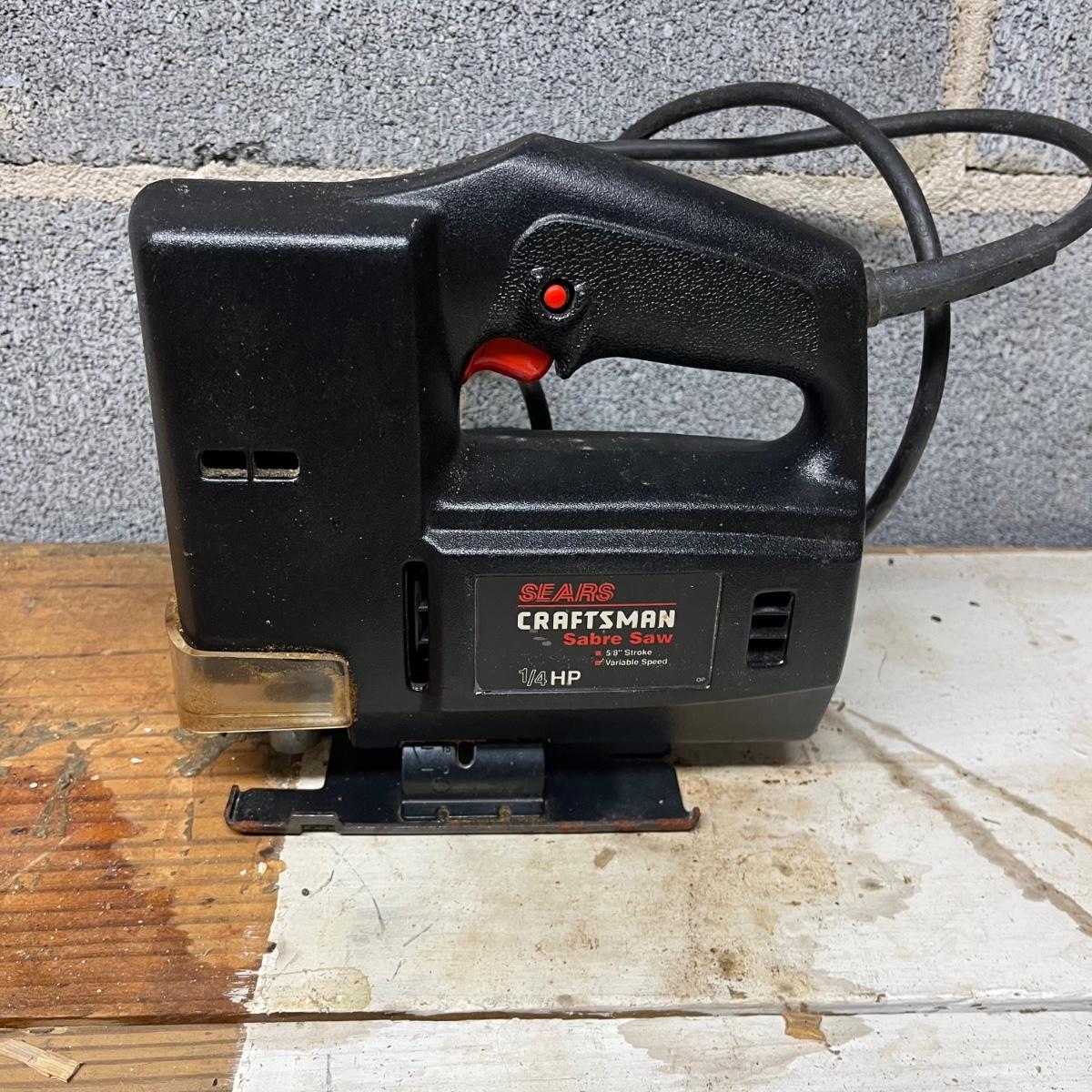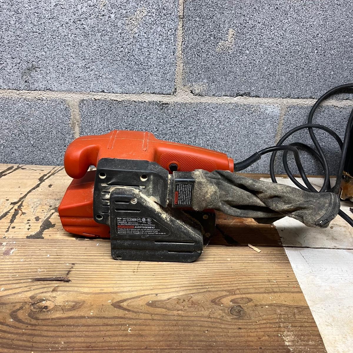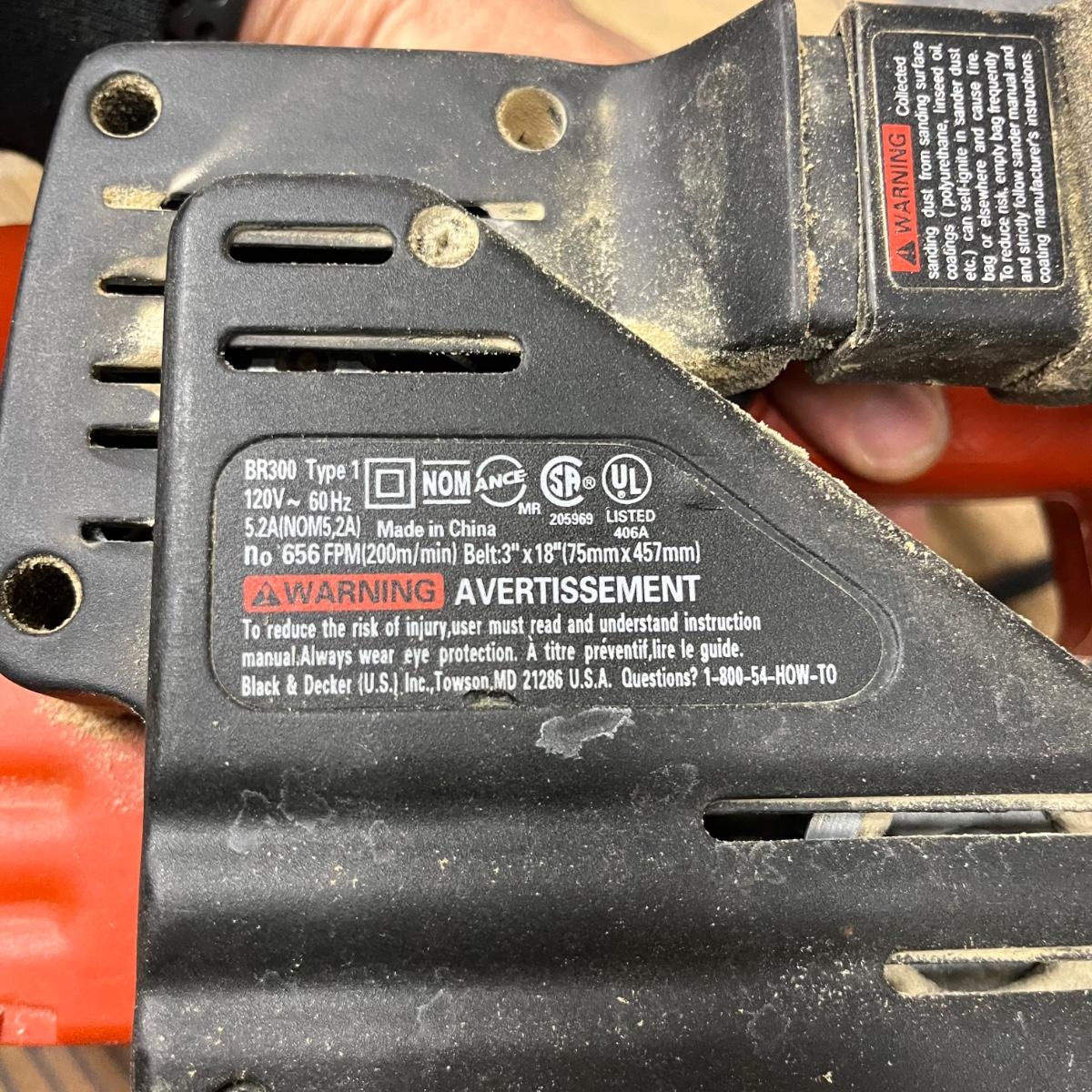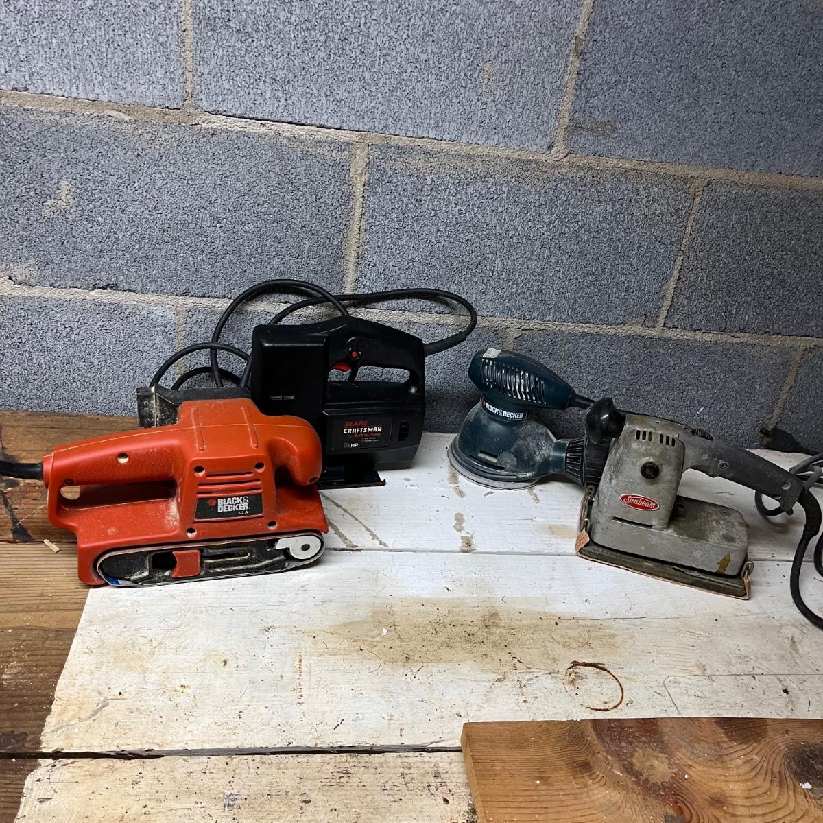 Lot includes a Black and Decker belt sander model # BR-300 and orbital sander model # RO100. Also includes a Craftsman Sabre saw and a Sunbeam sander. All items powered on when tested.