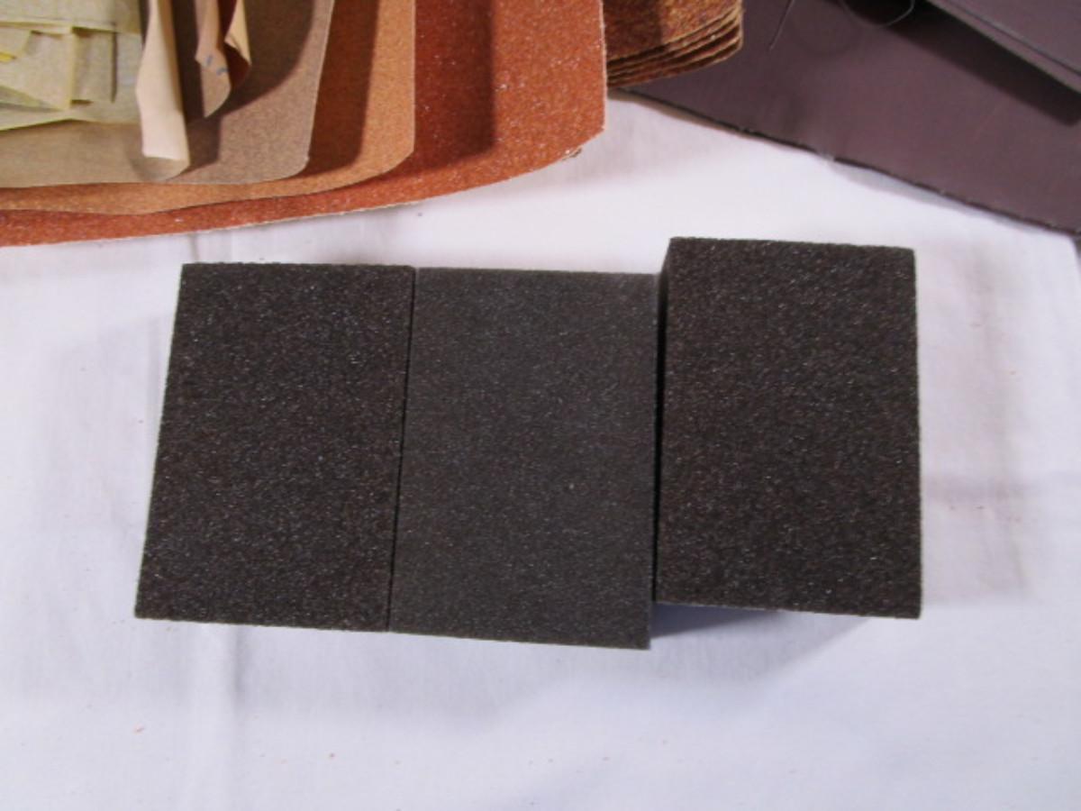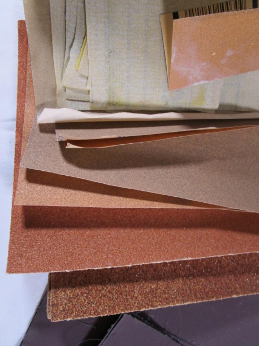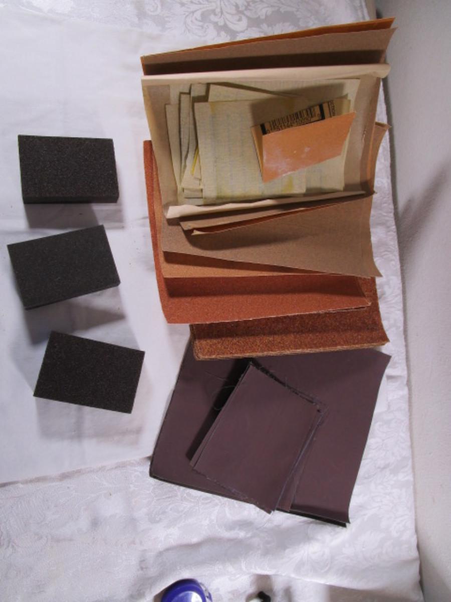 3 sandpaper sponge blocks, 6 sheets of 36 grit, 5 sheets of 60 grit, 1 sheet of 120, 2 sheets of 100 grit, 2 sheets of 150 grit, 2 sheets of unknown grit, small pieces of 220 grit