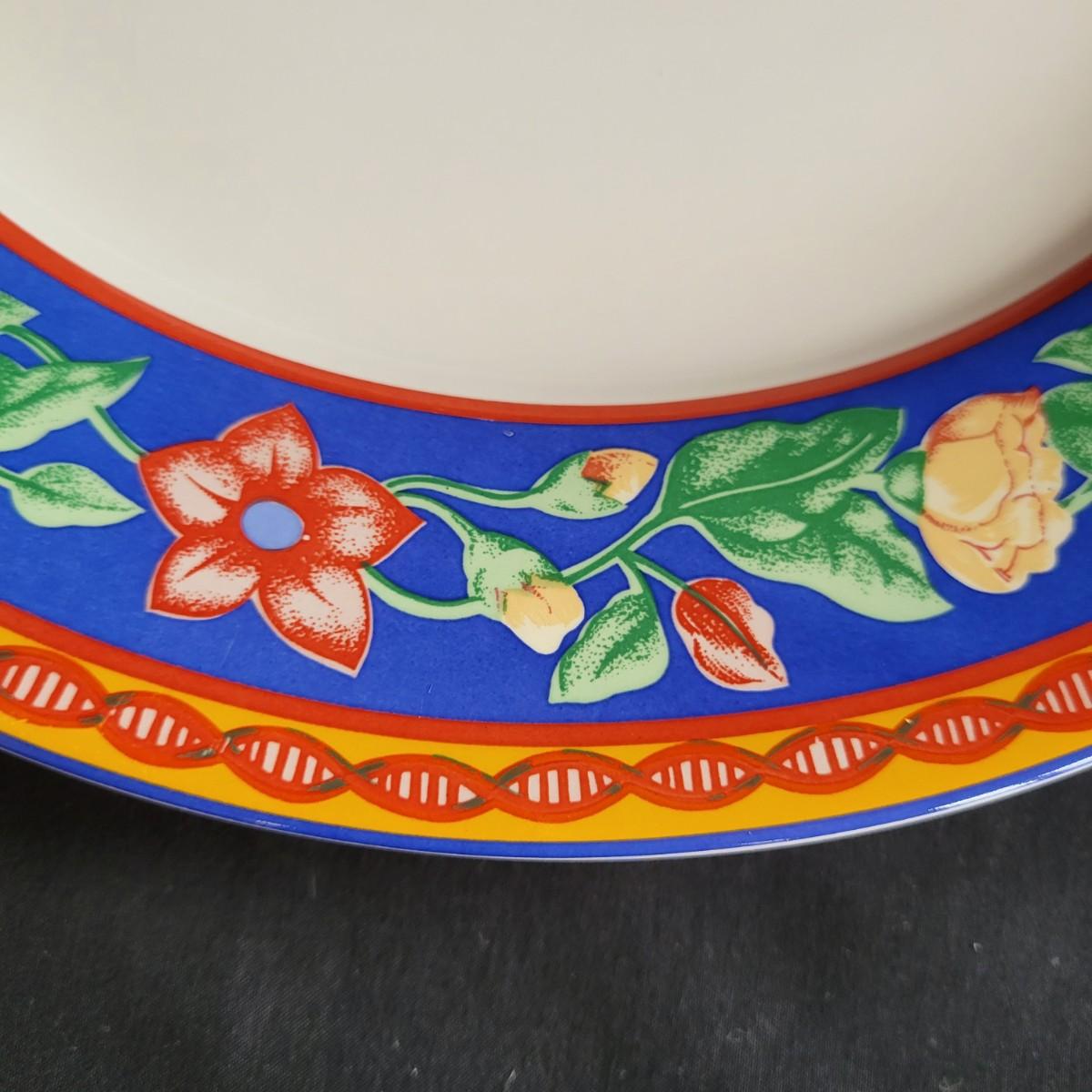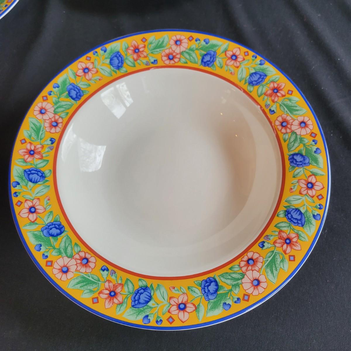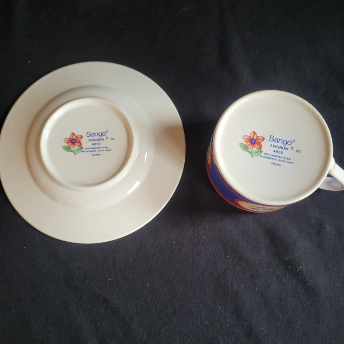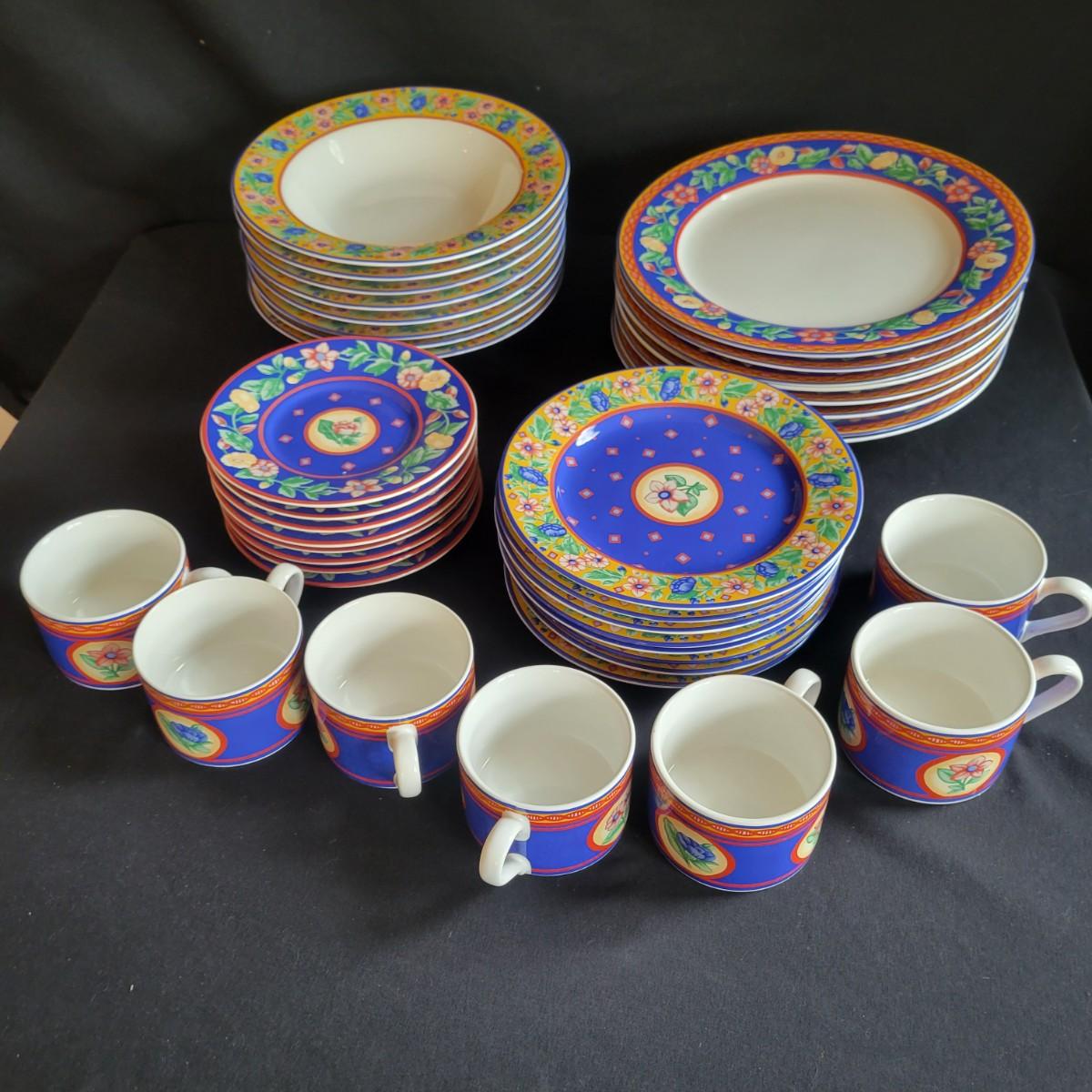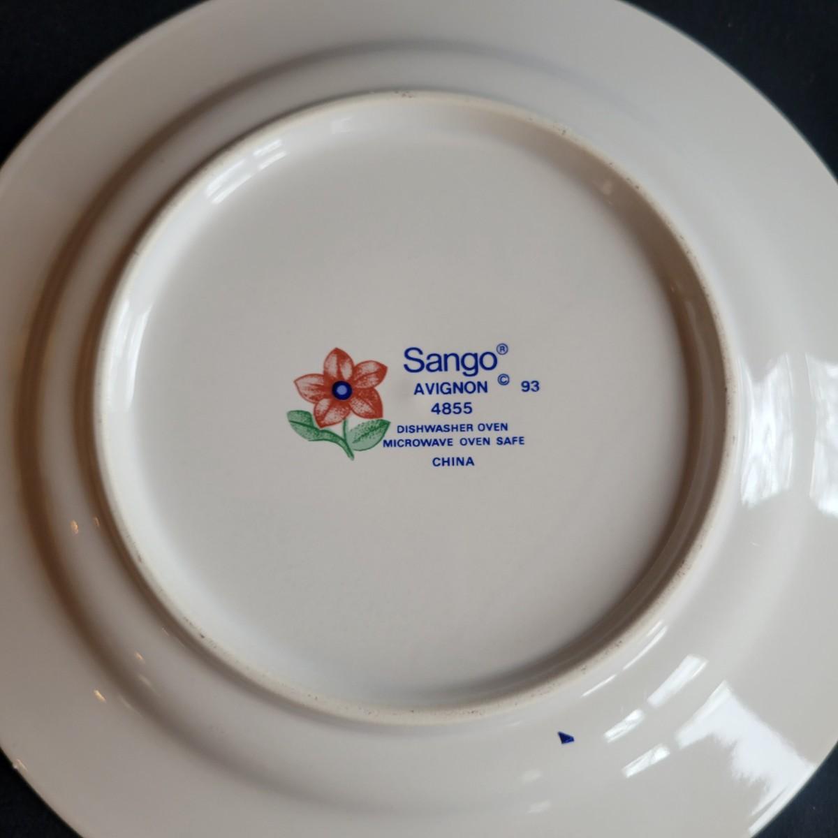 A five piece, eight place setting china set by Sango in the Avignon pattern. This set is both dishwasher and microwave safe. There is one coffee cup missing from the set. The dinner plate measures approximately 11" in diameter. Local pickup only