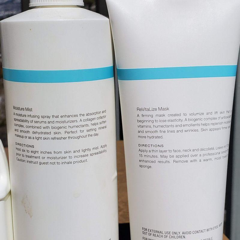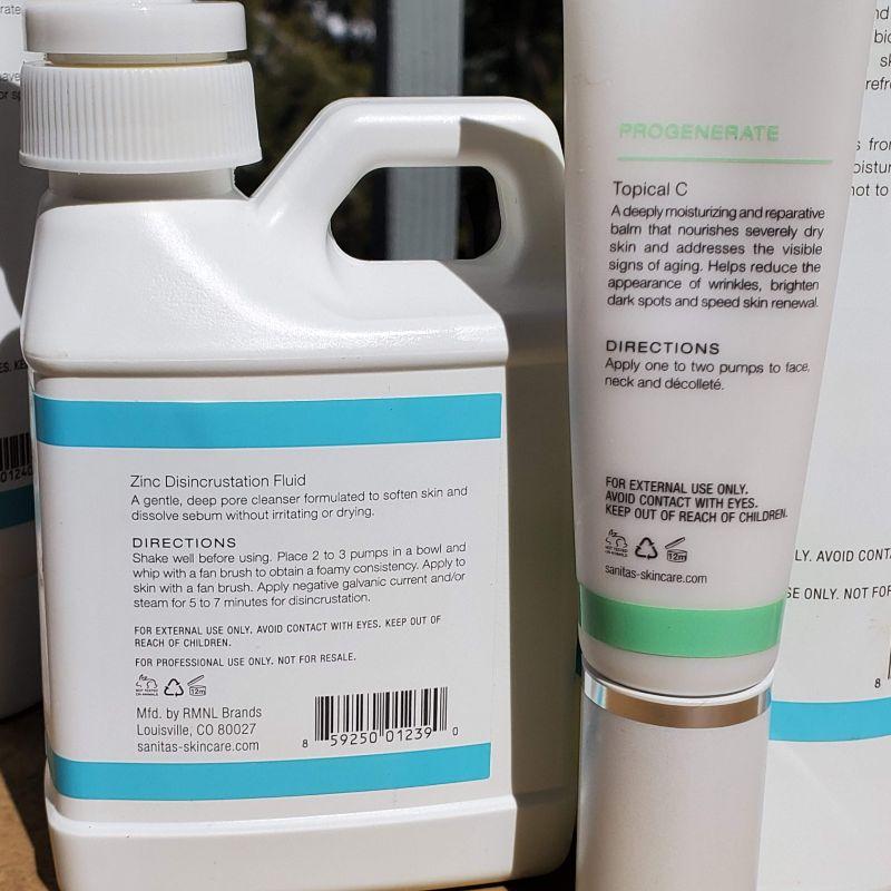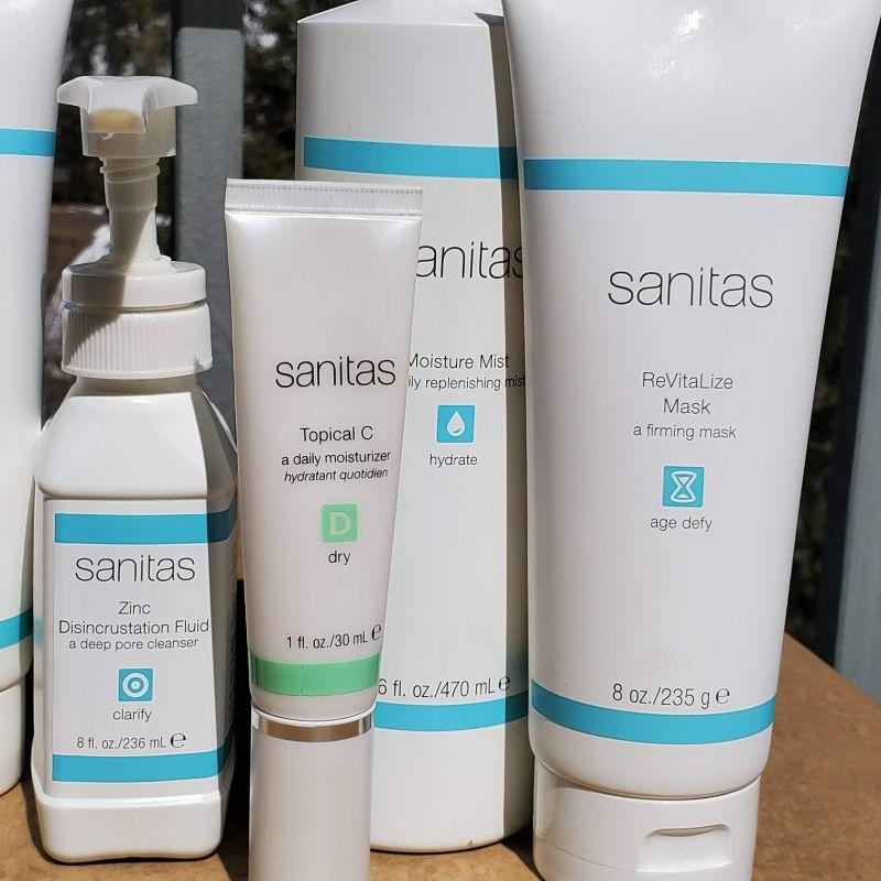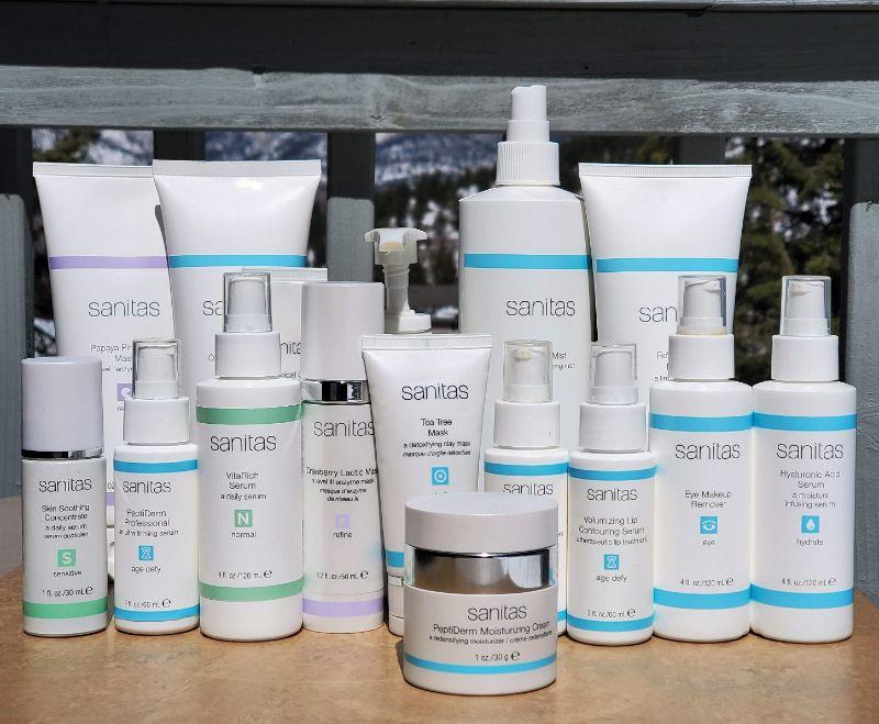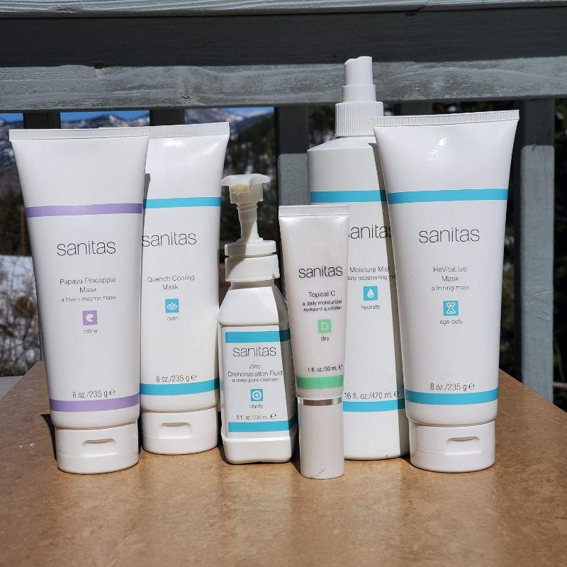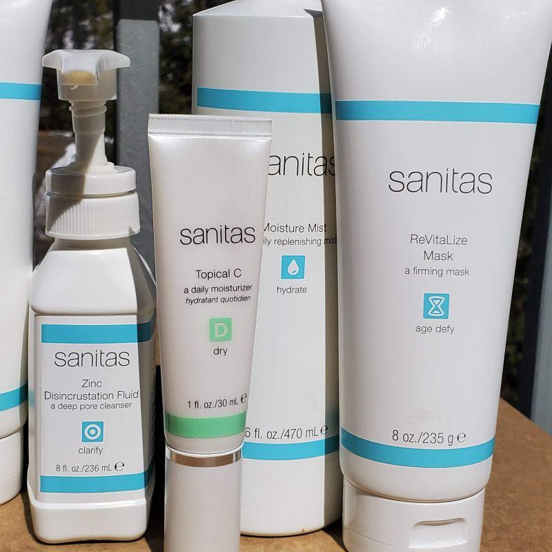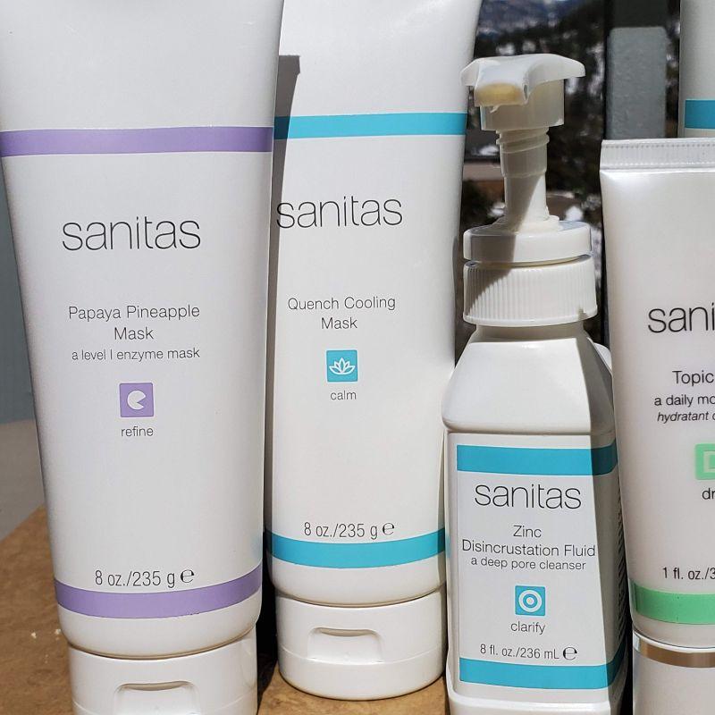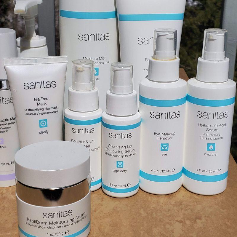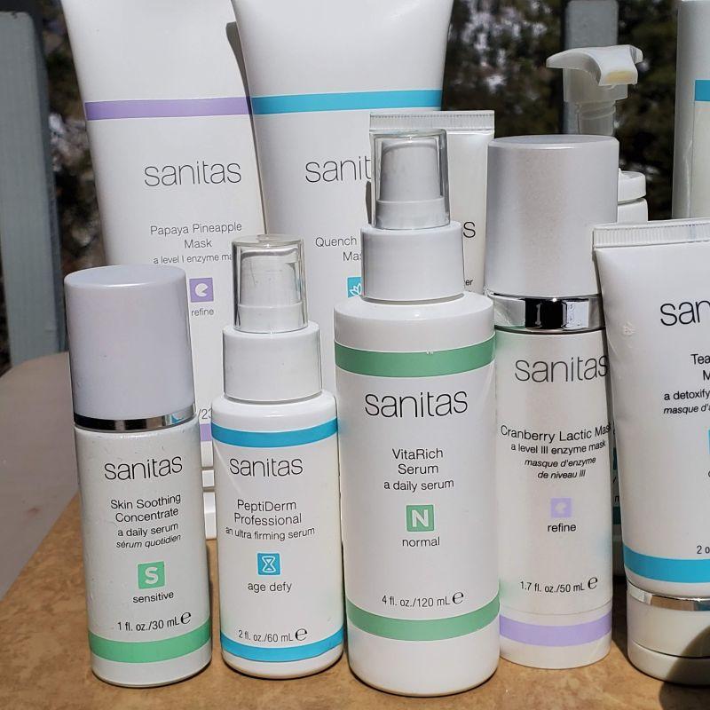 Sanitas Lot of 16 Opened/Barely Used Products (Papaya Pineapple Mask 8 oz, Zinc Disincrustation Fluid 8 fl oz, PeptiDerm Moisturizing Cream 1 oz, VitaRich Daily Serum 4 fl oz, Contour and Lift Eye Gel 2 fl oz, Hyaluronic Acid Serum 4 fl oz, Cranberry Lactic Mask 1.7 fl oz, Quench Cooling Mask 8 oz, Tea Tree Detoxifying Clay Mask 2 oz, Skin Soothing Concentrate 1 fl oz, ReVitaLize Mask 8 oz, Moisture Mist 16 fl oz, Topical C 1 fl oz, Eye Makeup Remover 4 fl oz, Volumizing Lip Contouring Serum 2 fl oz, PeptiDerm Professional Ultra Firming Serum 2 fl oz)