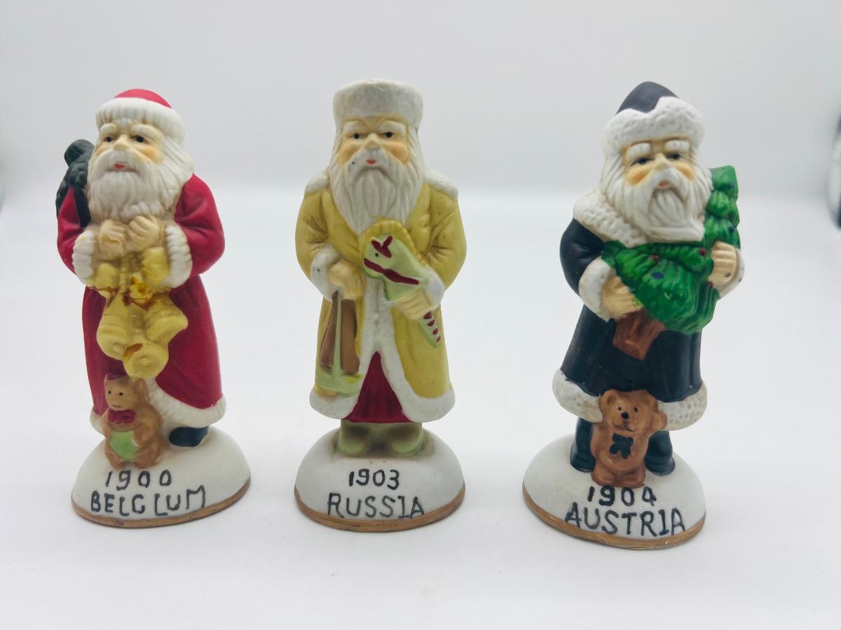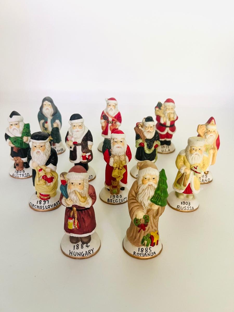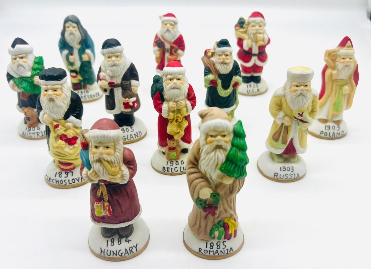 Santas From Around the World Germany Christmas Figurine. 12 total. And painted porcelain. Each Santa measures approximately 5 inches tall. One Santa looks as though it has been repaired, see picture.